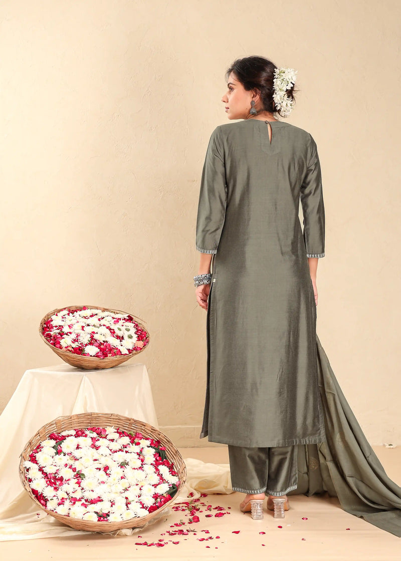 Women Caster Grey 3pc placement embroidery kurta set