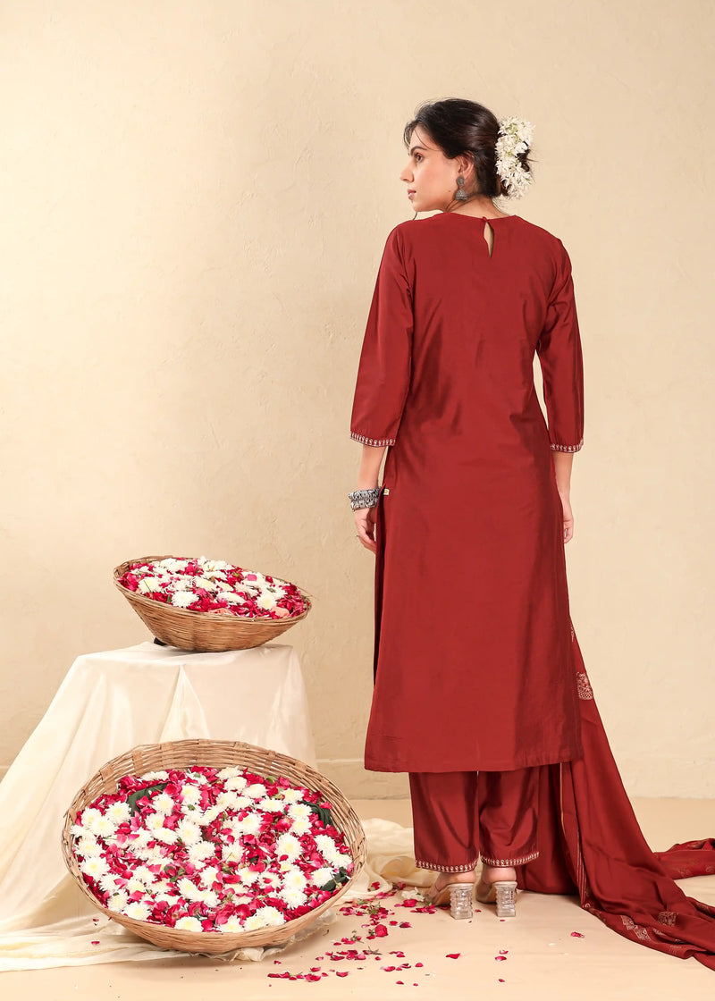 Women Maroon Red 3pc-placement-embroidery-kurta-set