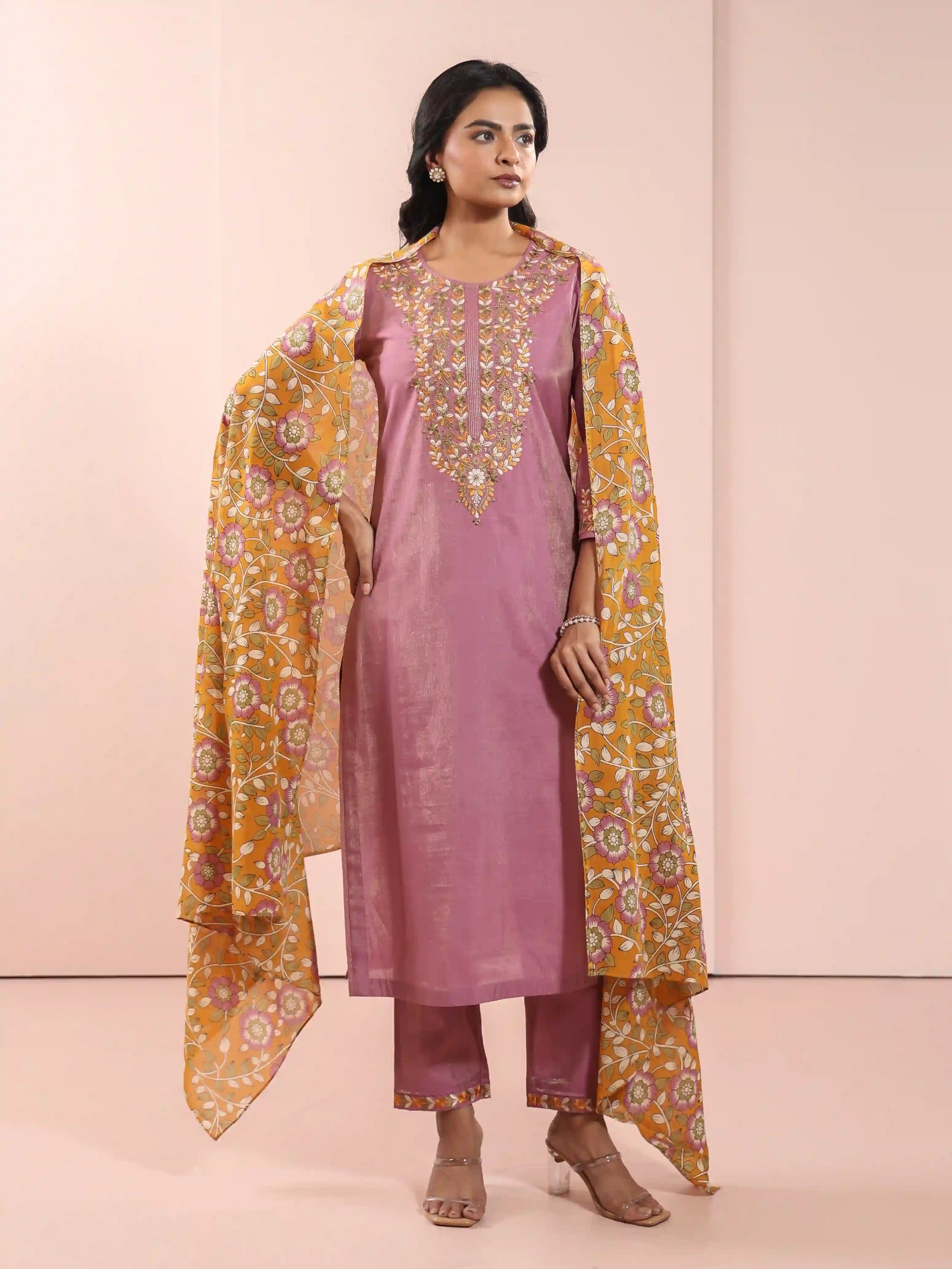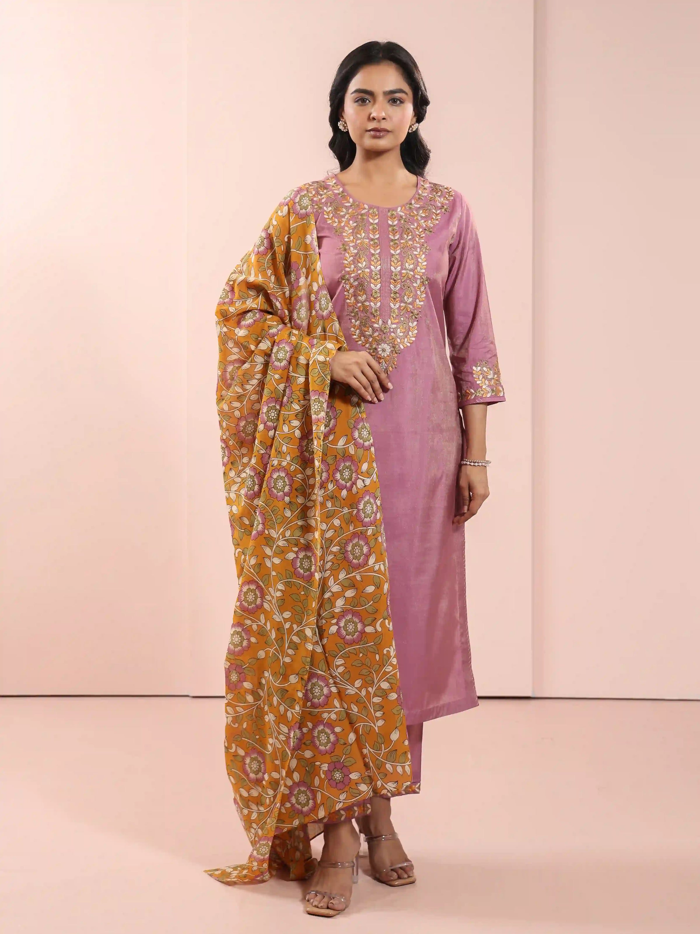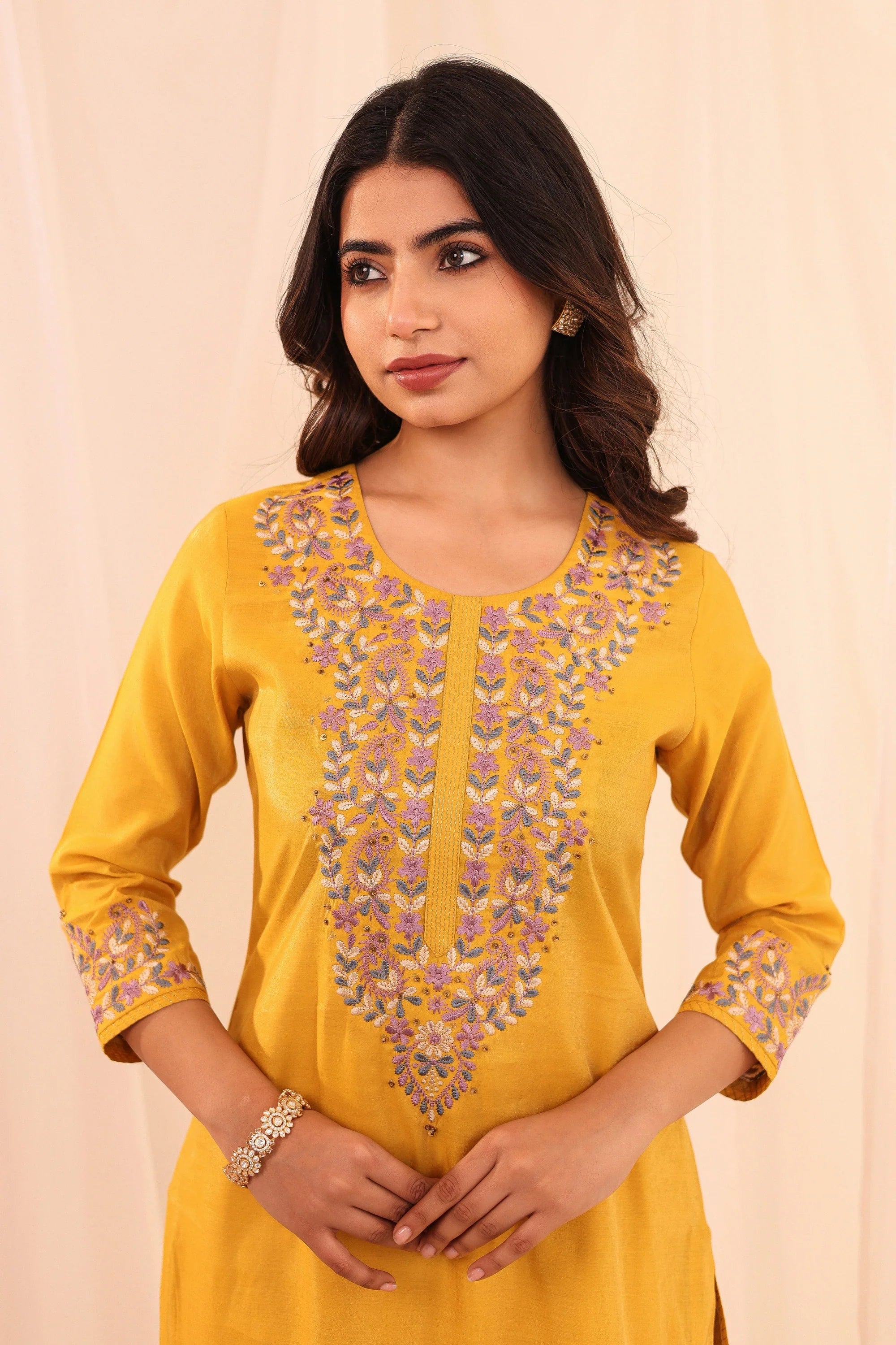 Women Golden Yellow shimmer-3pc-chikankari-embroidery-kurta-set-embellished-with-adda-work-highlights