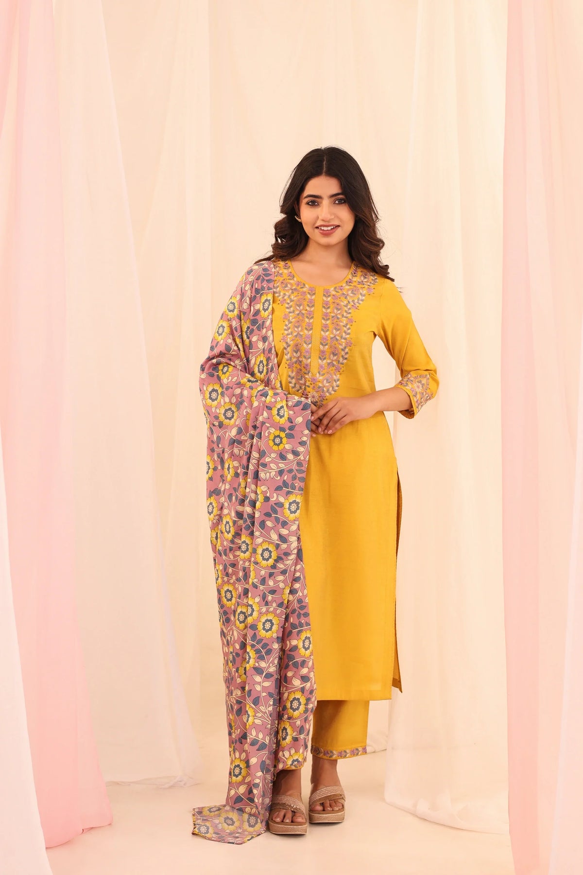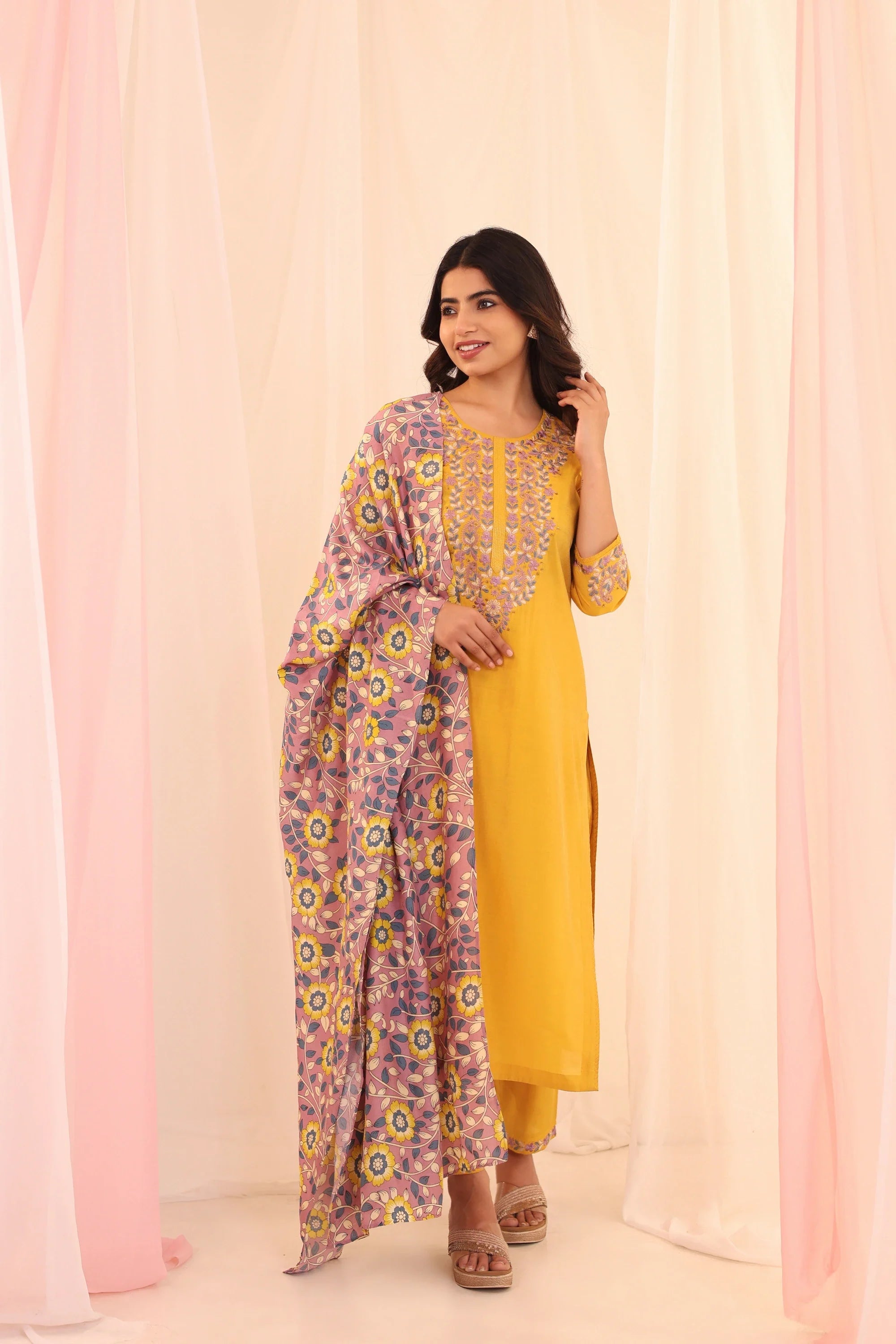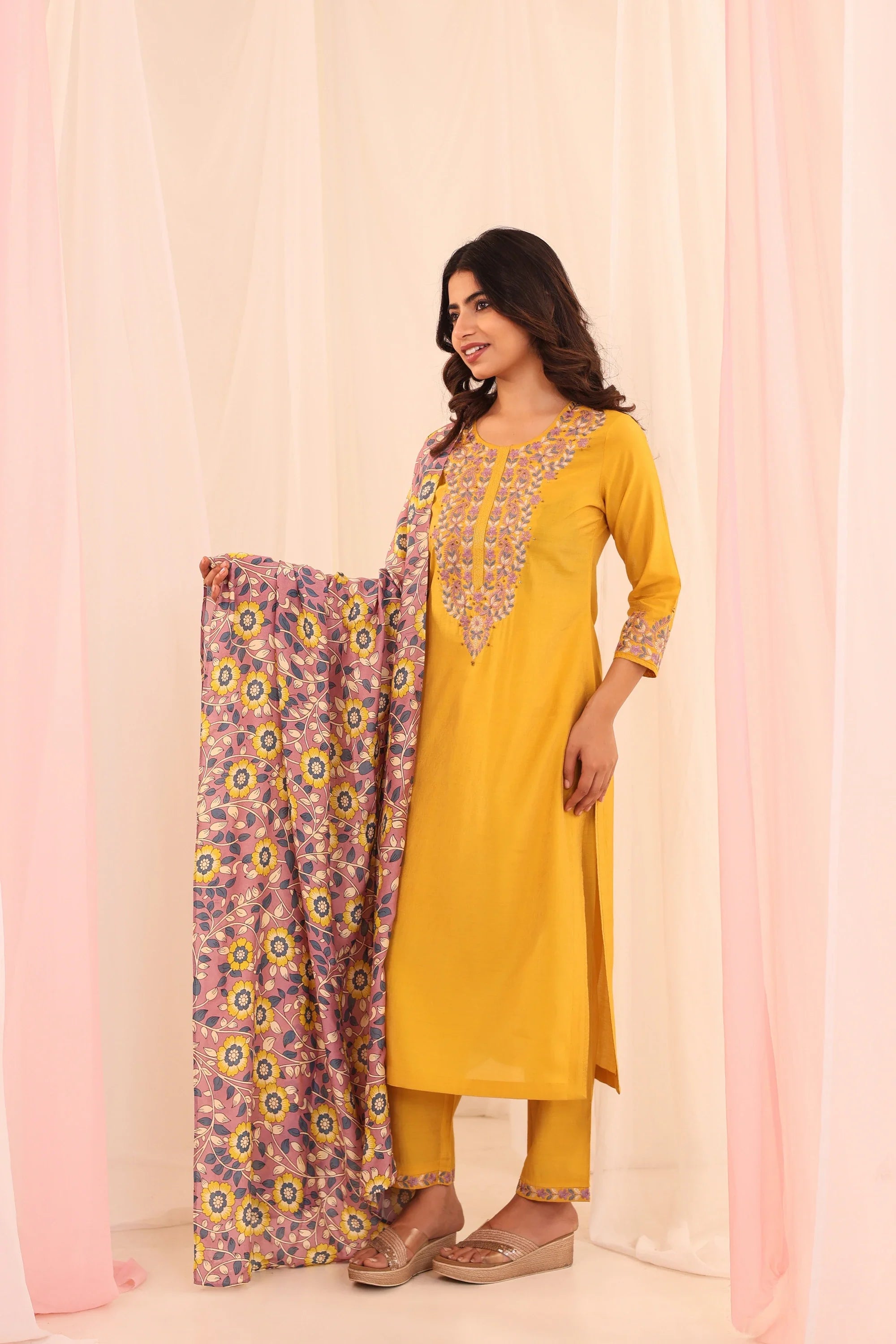 Women Golden Yellow shimmer-3pc-chikankari-embroidery-kurta-set-embellished-with-adda-work-highlights