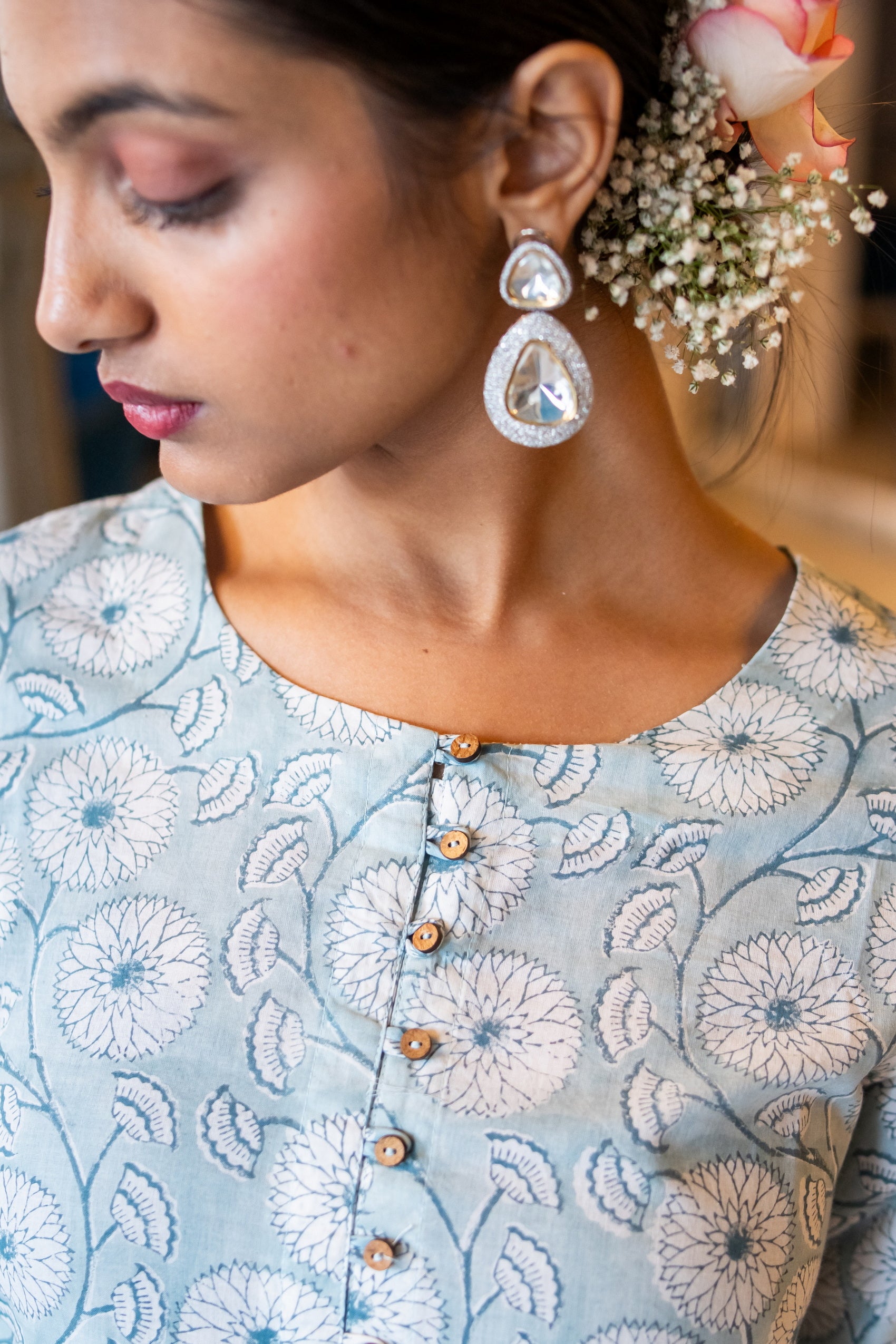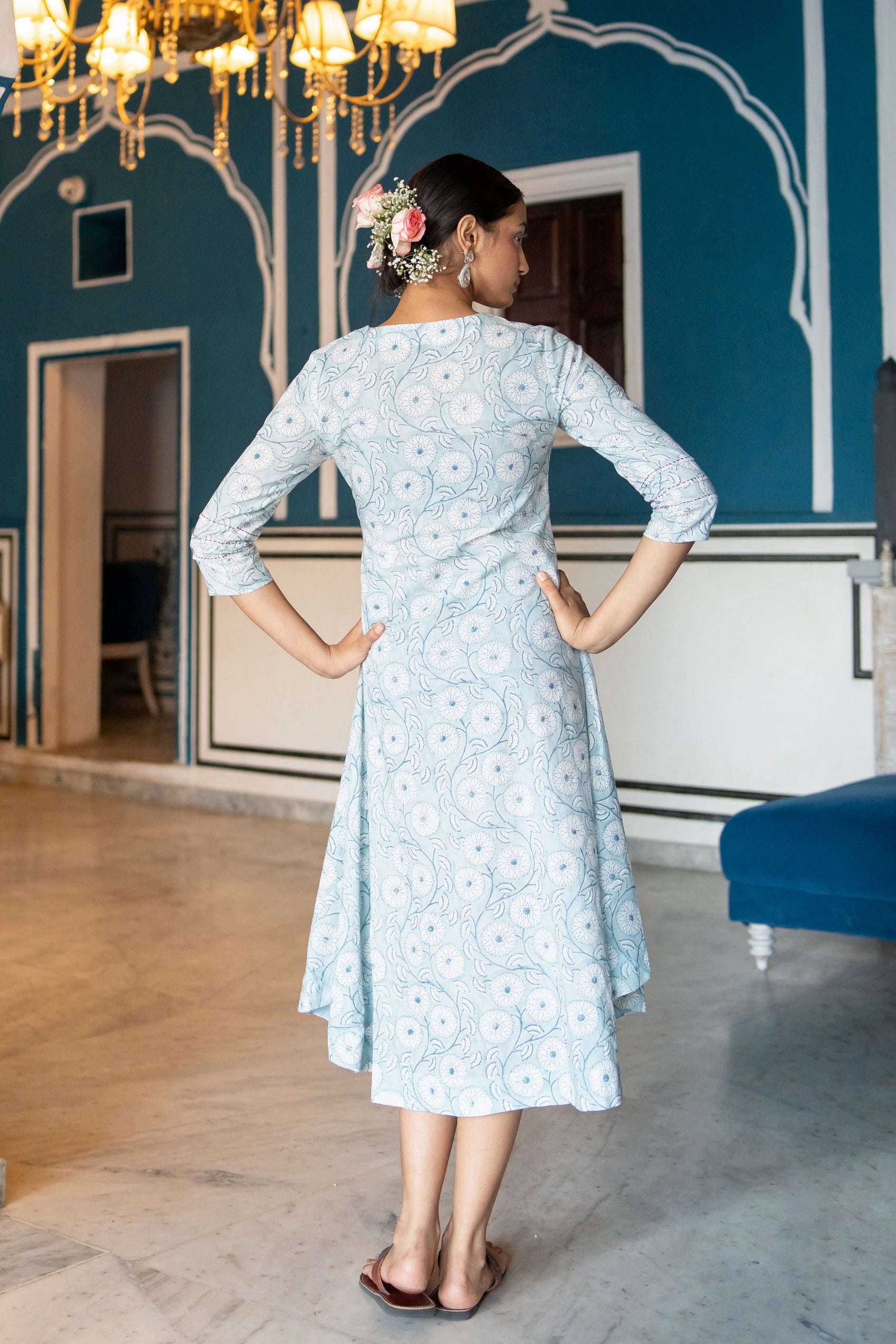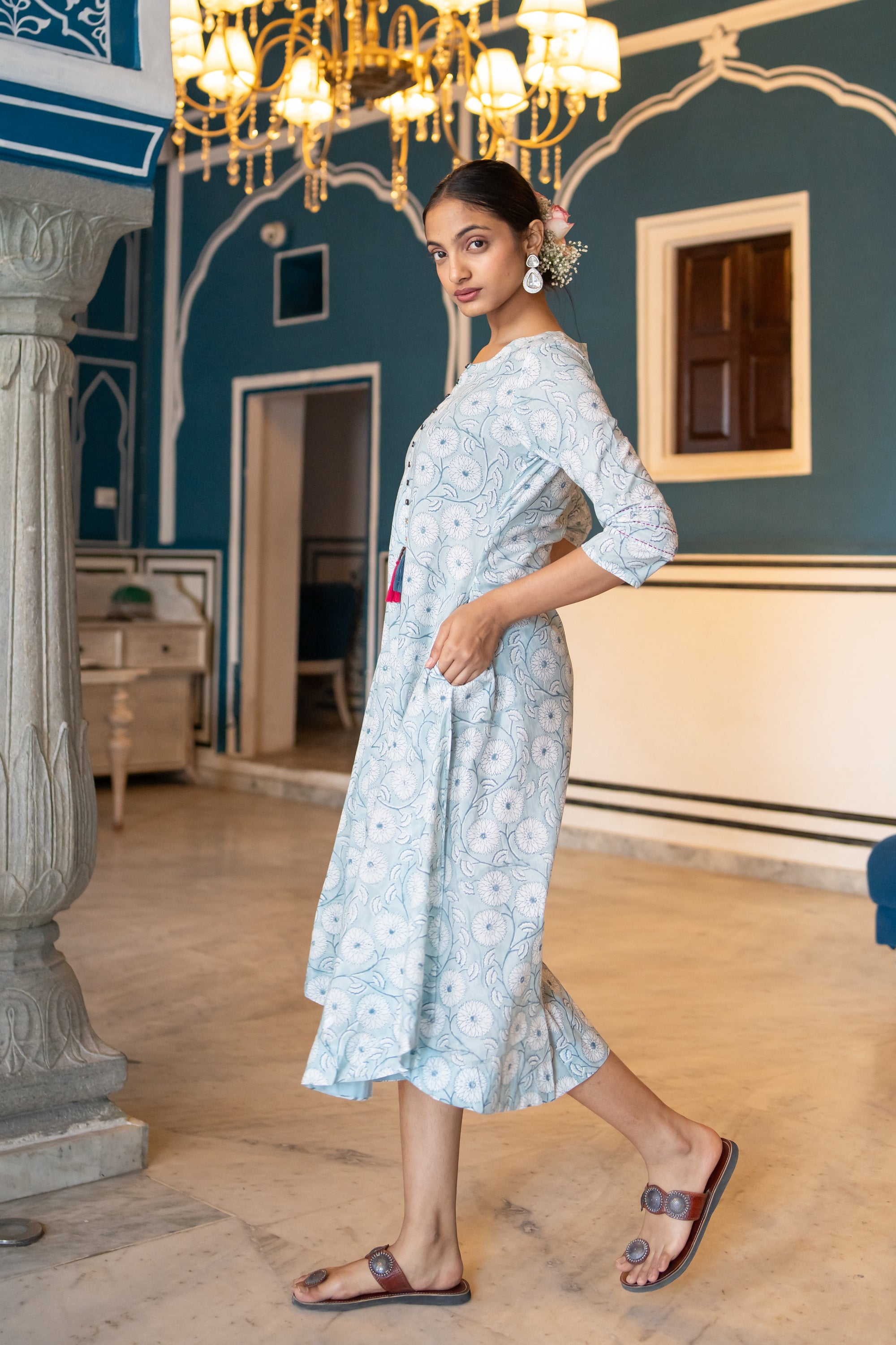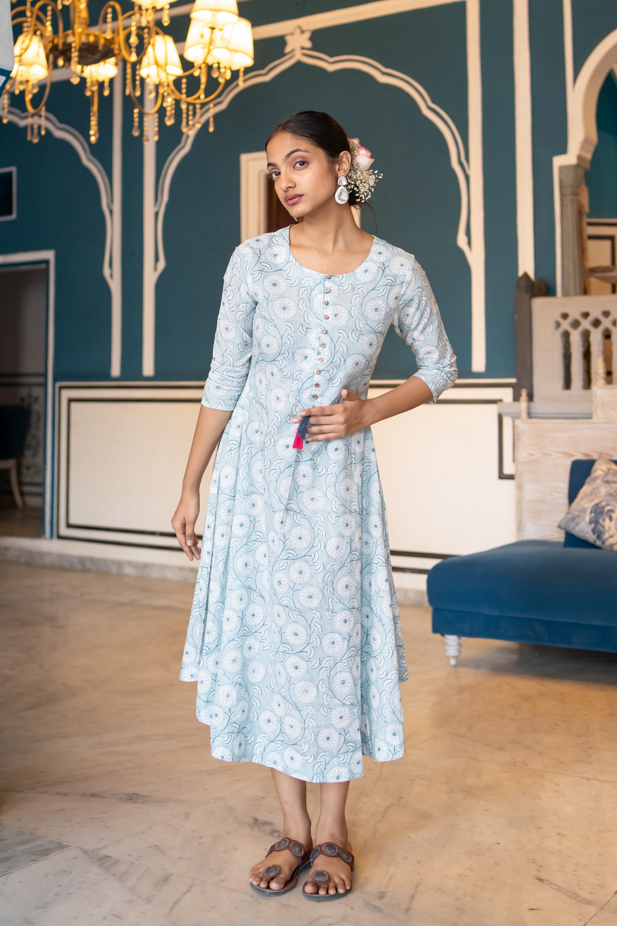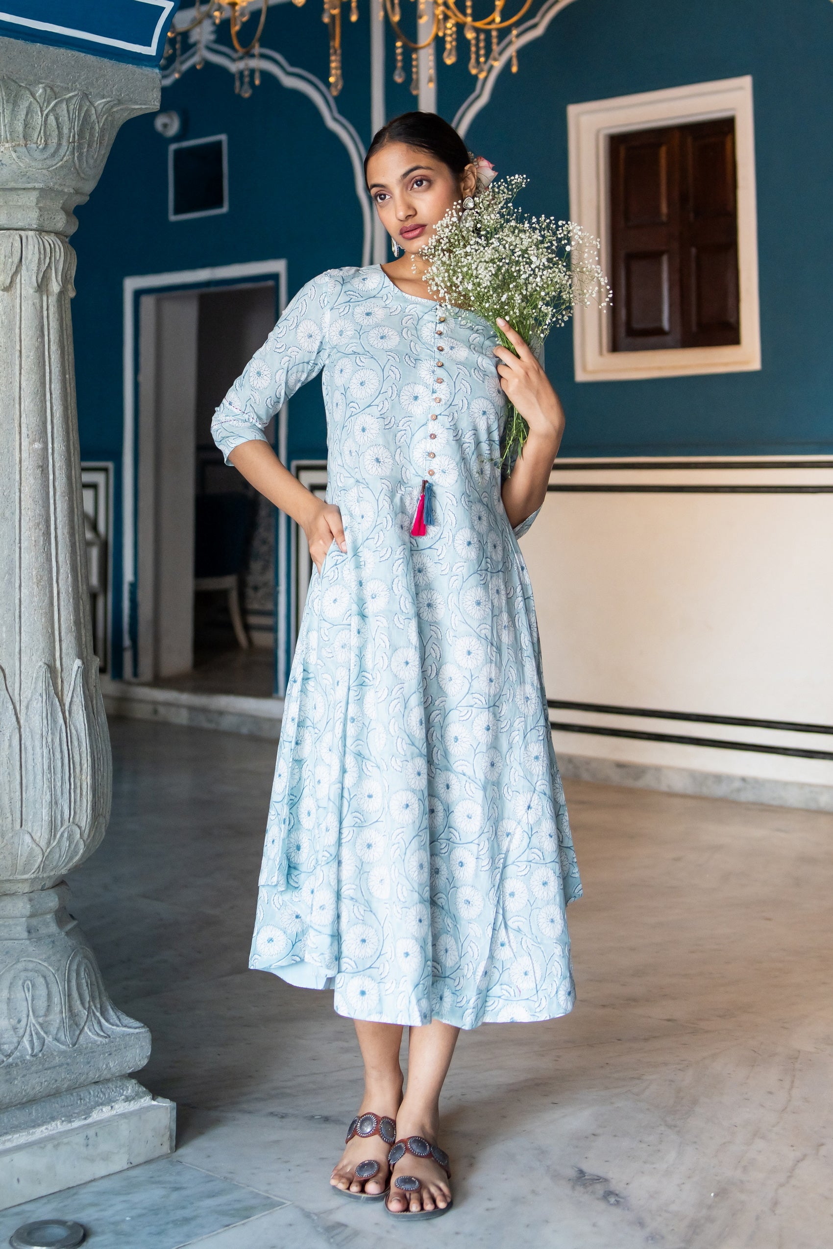 This Mul cotton long dress by Suti boasts floral prints throughout on an A-line silhouette. Spun from pure mul cotton, it features a classic round neck with button down and playful thread tassels and 3/4th sleeves with pin tucks and kantha details, and is finished with convenient side pockets.