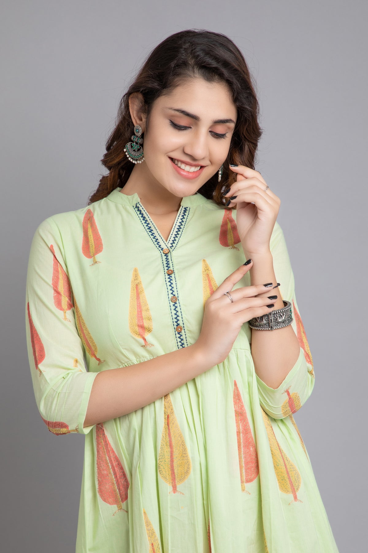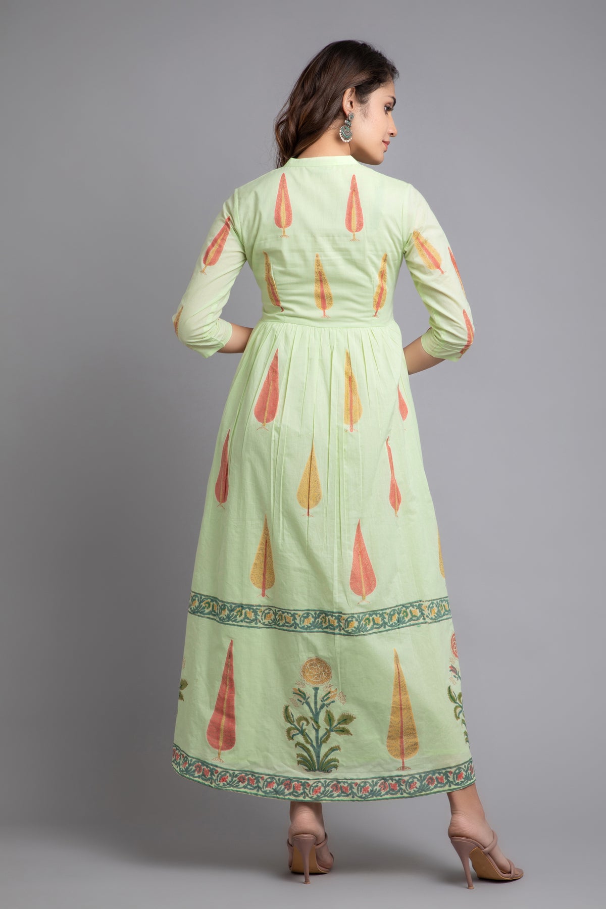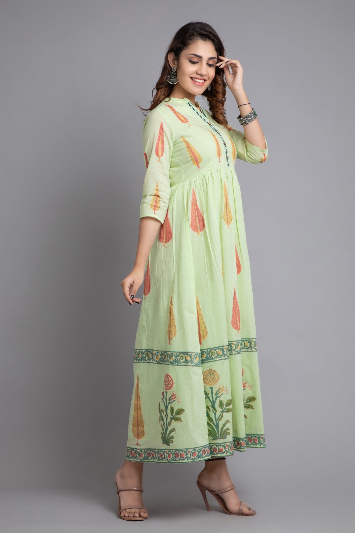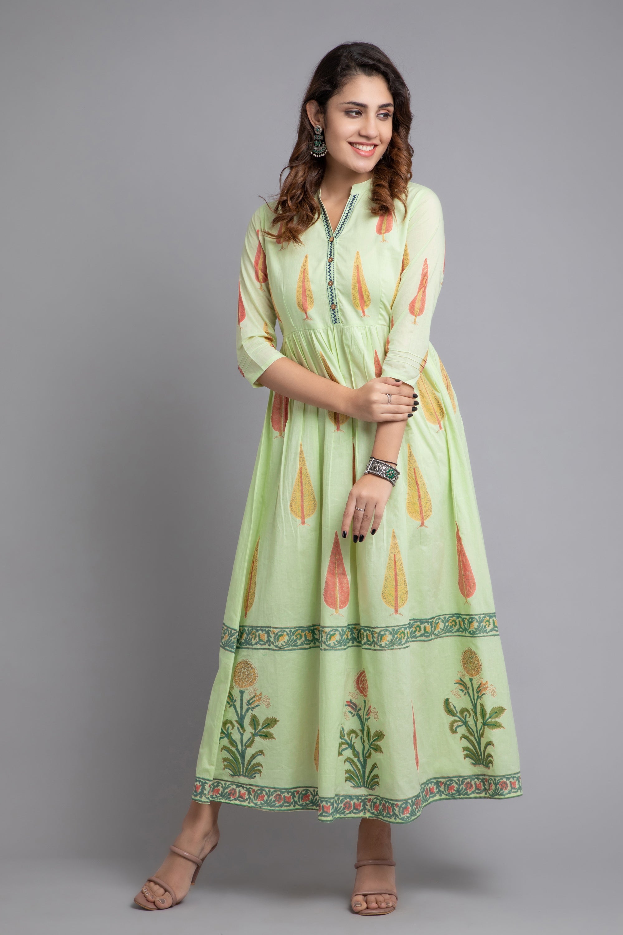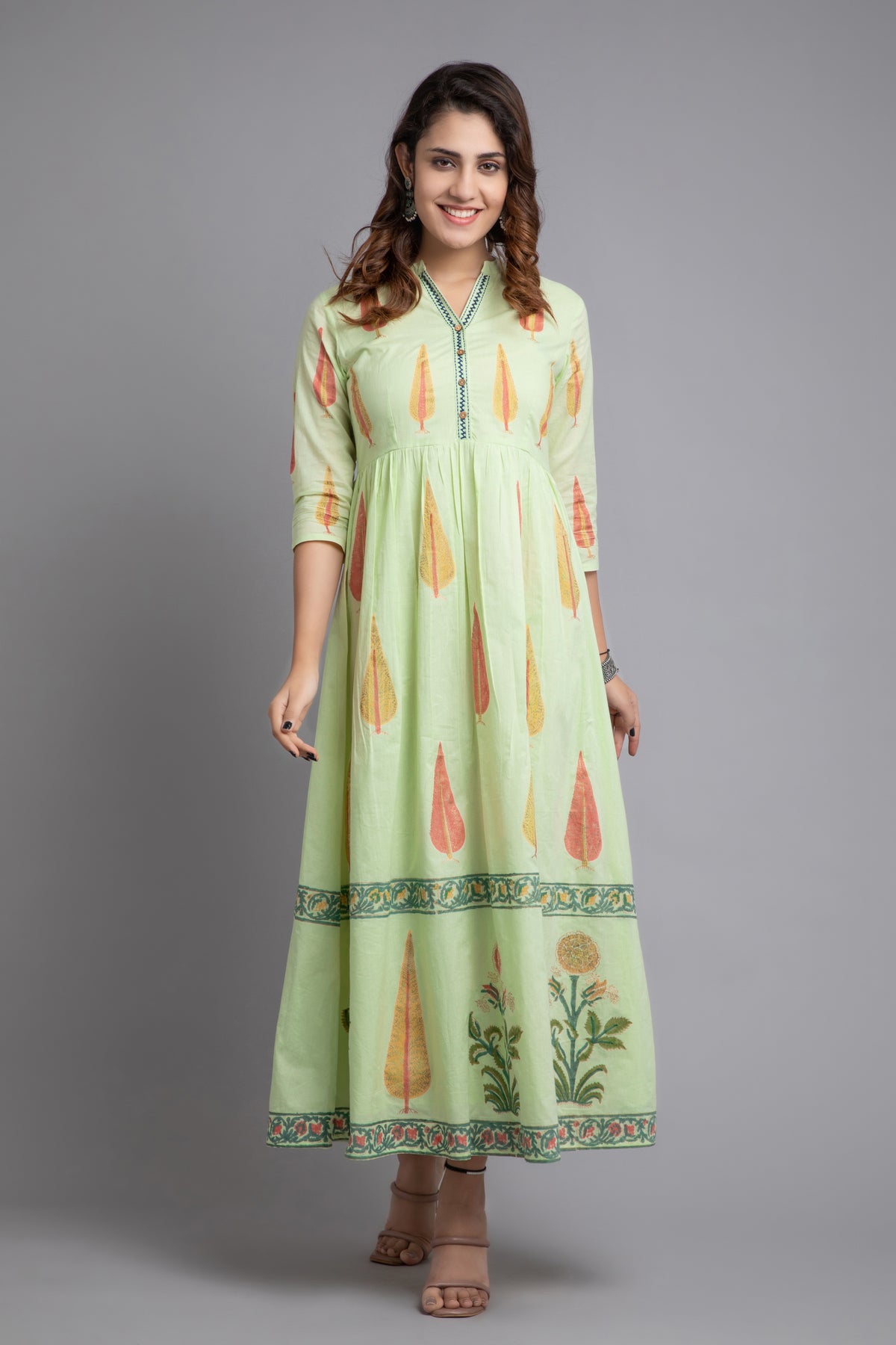 This mul cotton long dress is a vibrant celebration of style and femininity, perfect for everyday comfort. It features a lively golden traditional had block print that beautifully complements the dress's bold hue. The addition of contrast hand embroidery on placket enhances its playful and elegant appeal, making it a standout choice for women who love to embrace colour and pattern in their wardrobe. The stand collar, 3/4th sleeves, flared design not only adds a dimensional look but also offers a flattering fit for all body types. Pair this eye-catching dress with gold or neutral-toned accessories to let its vibrant colors and unique details shine.