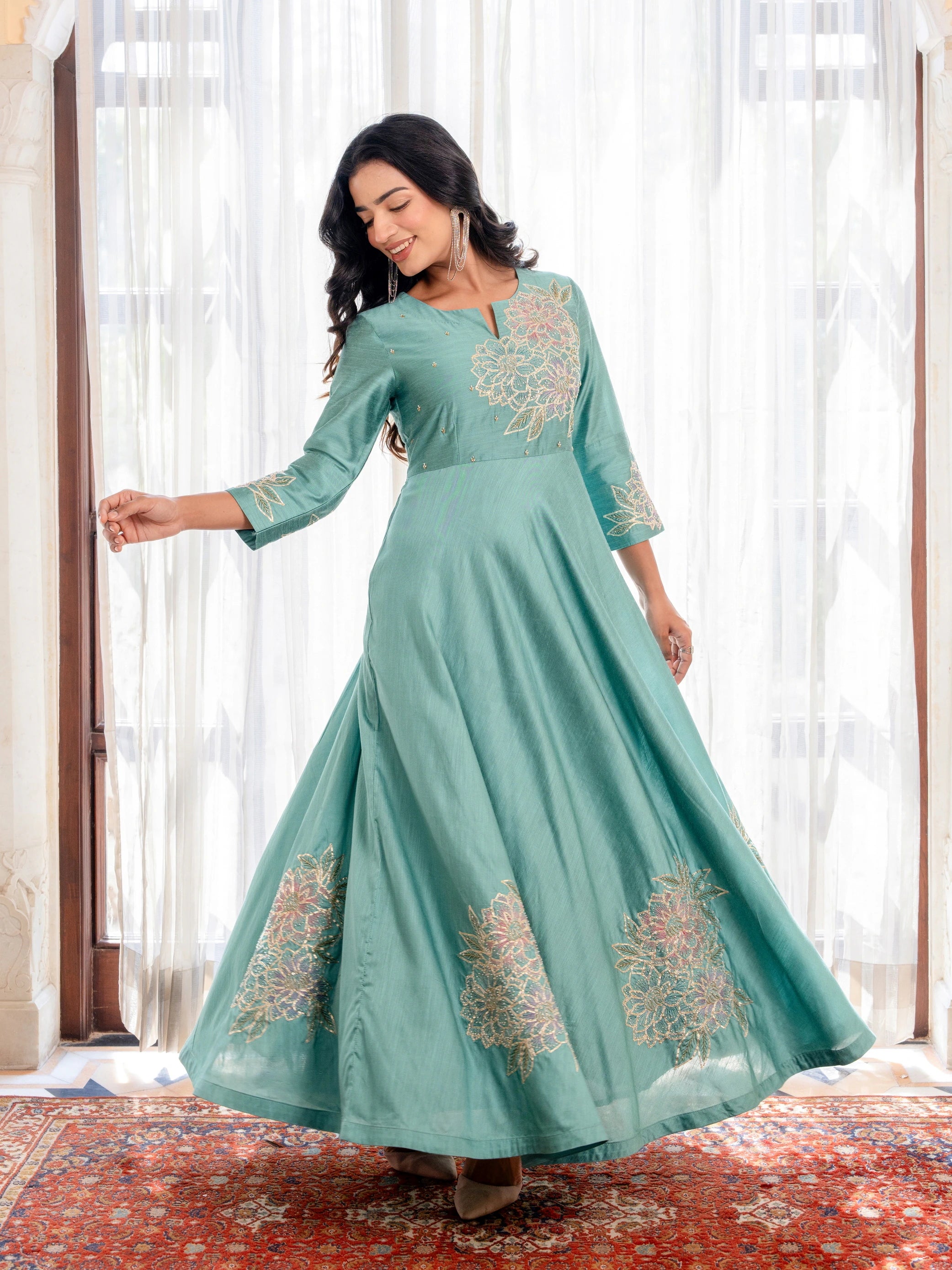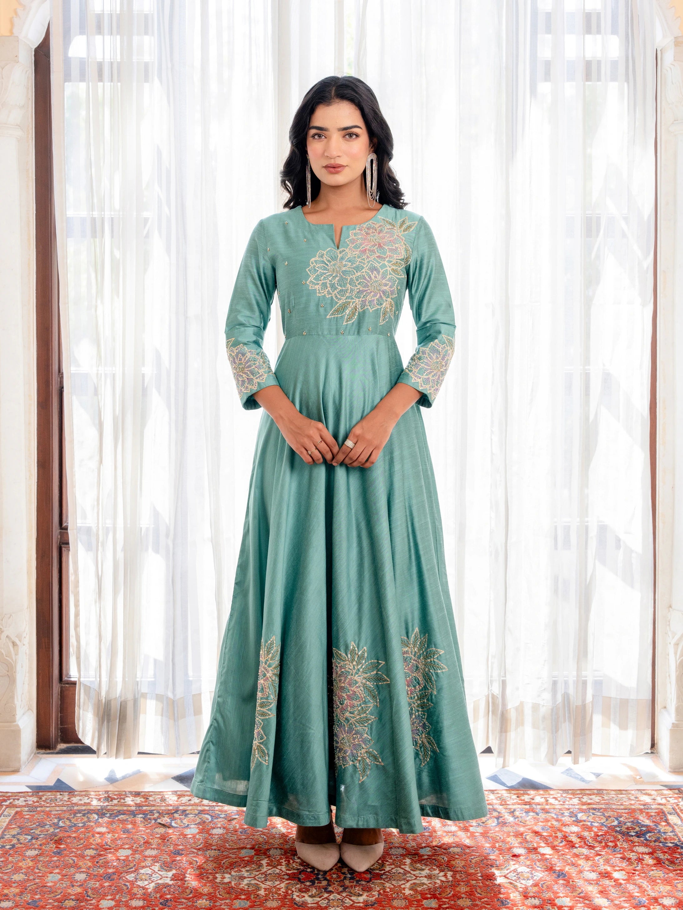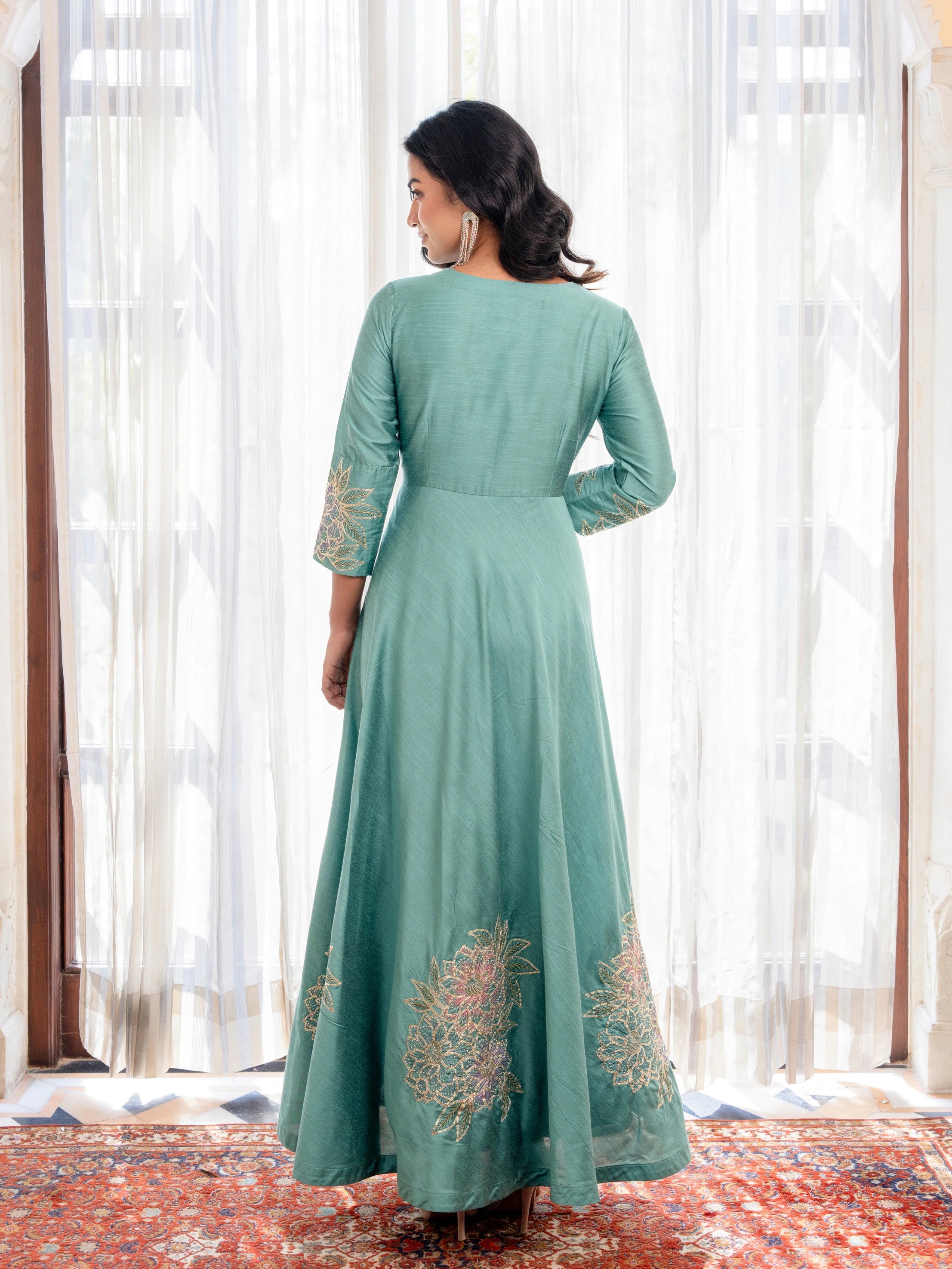 Green Embroidered Gota Lace and Cutdana Work Gown Dress