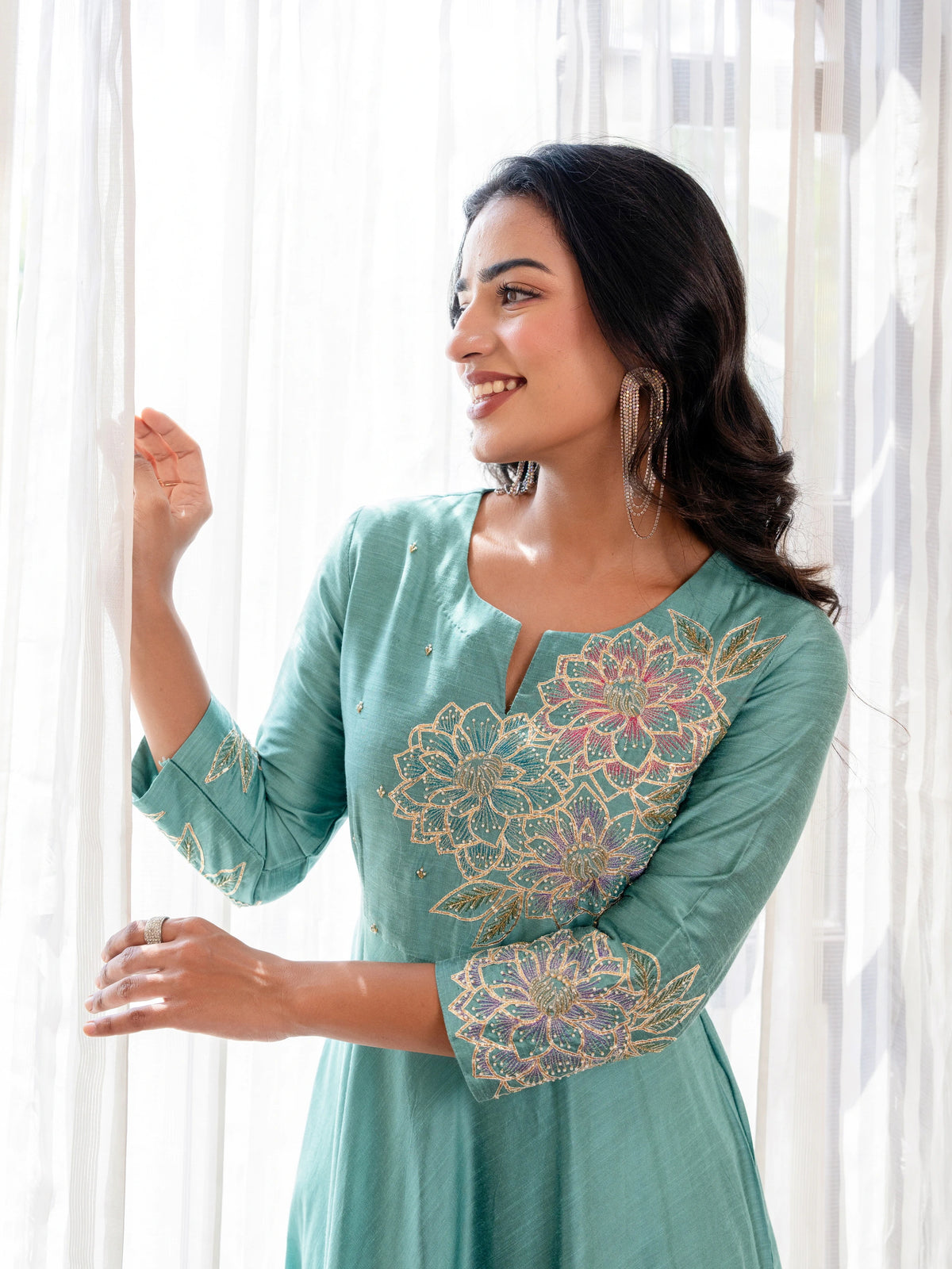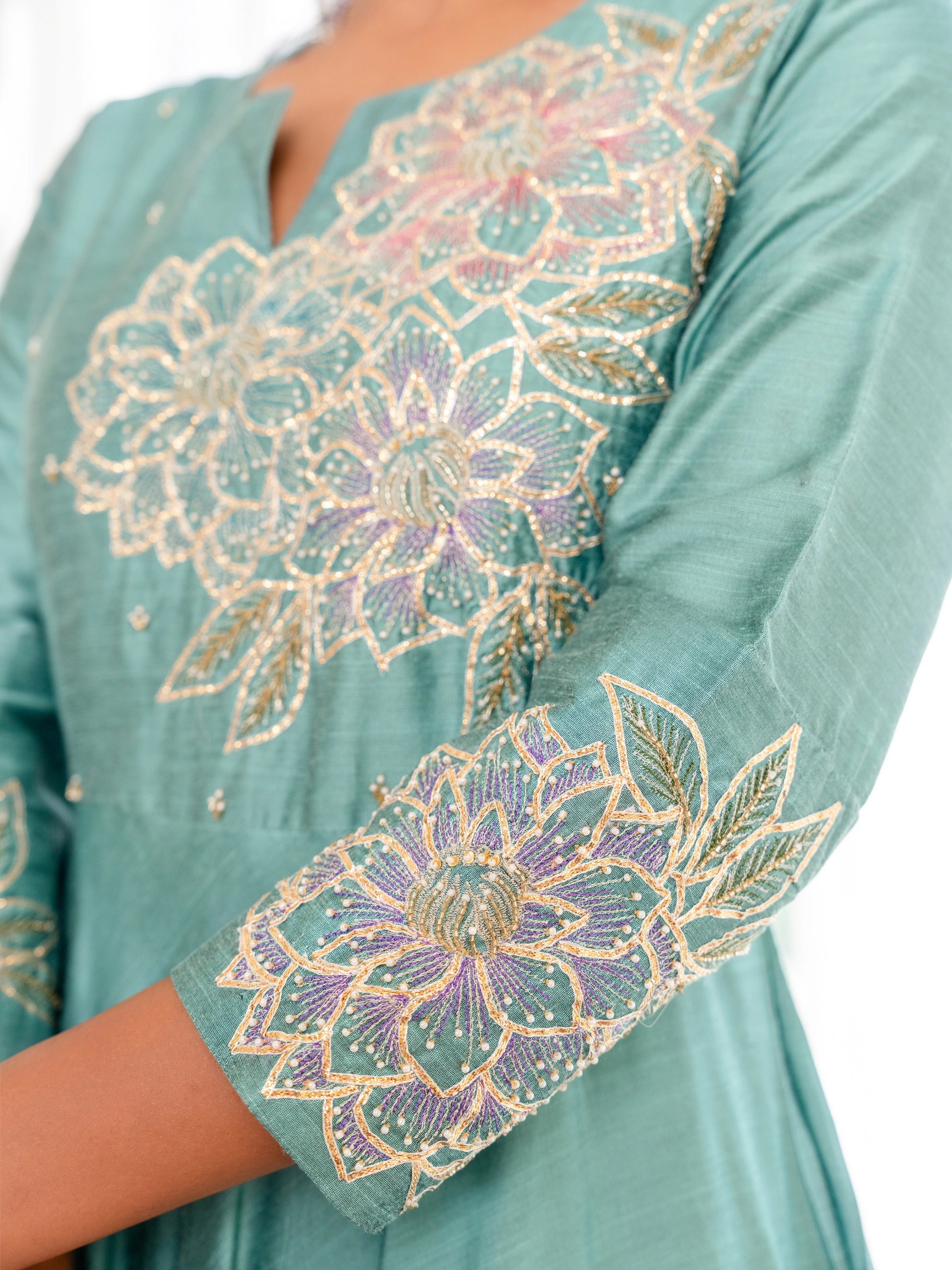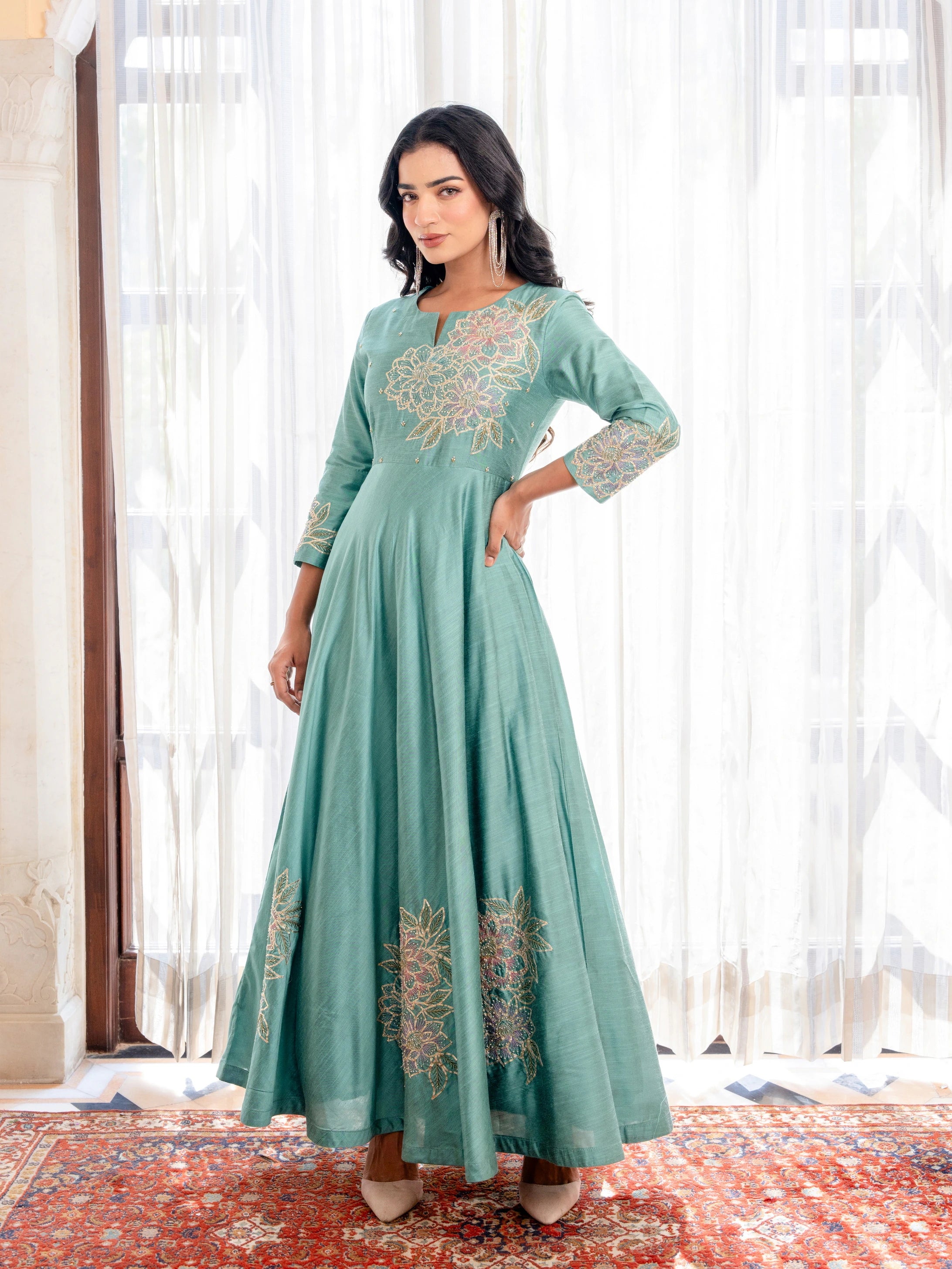 Green Embroidered Gota Lace and Cutdana Work Gown Dress