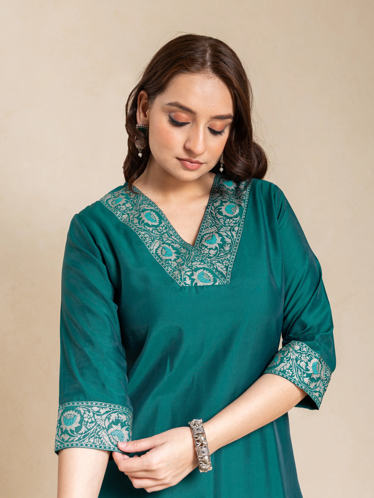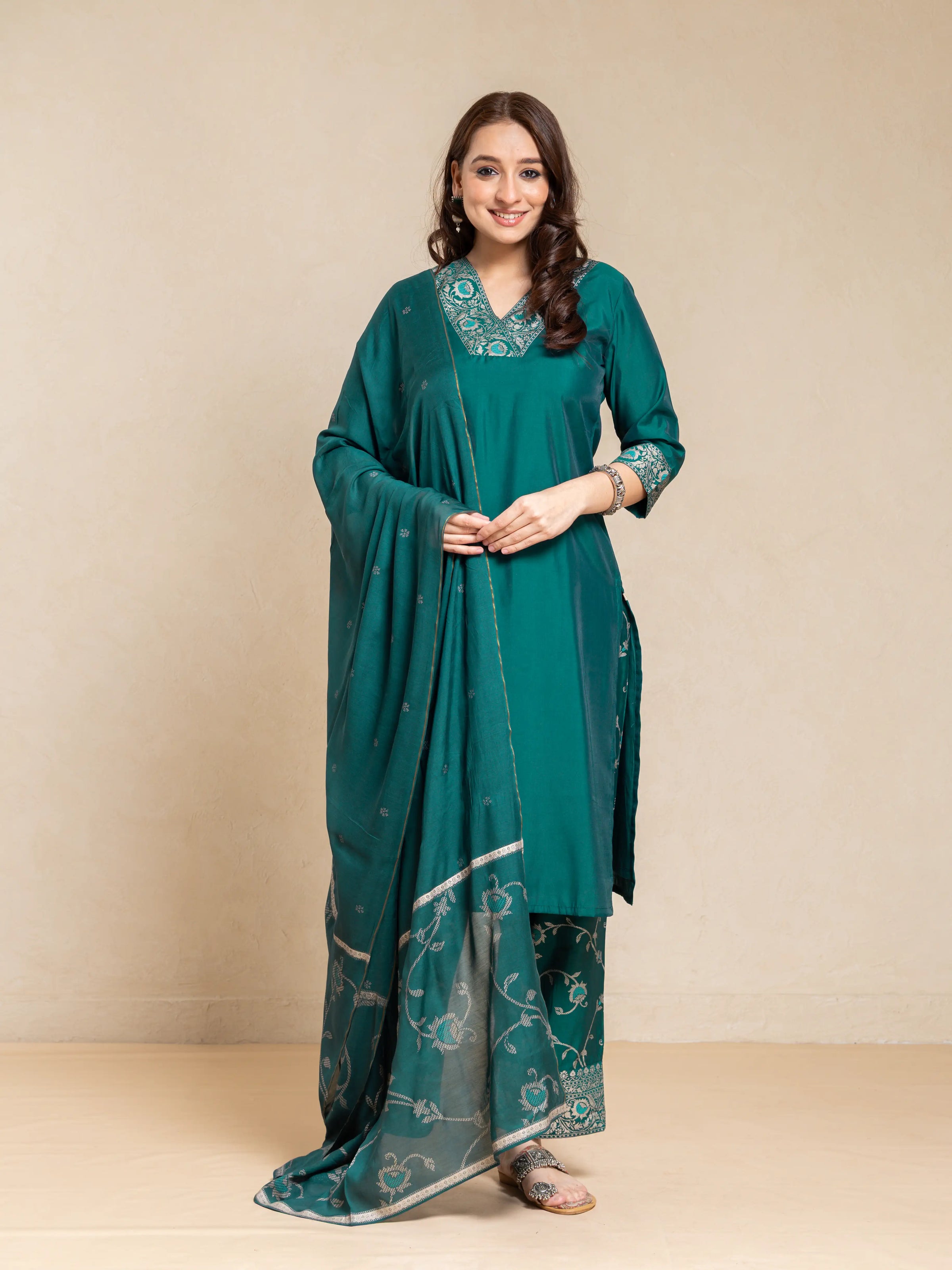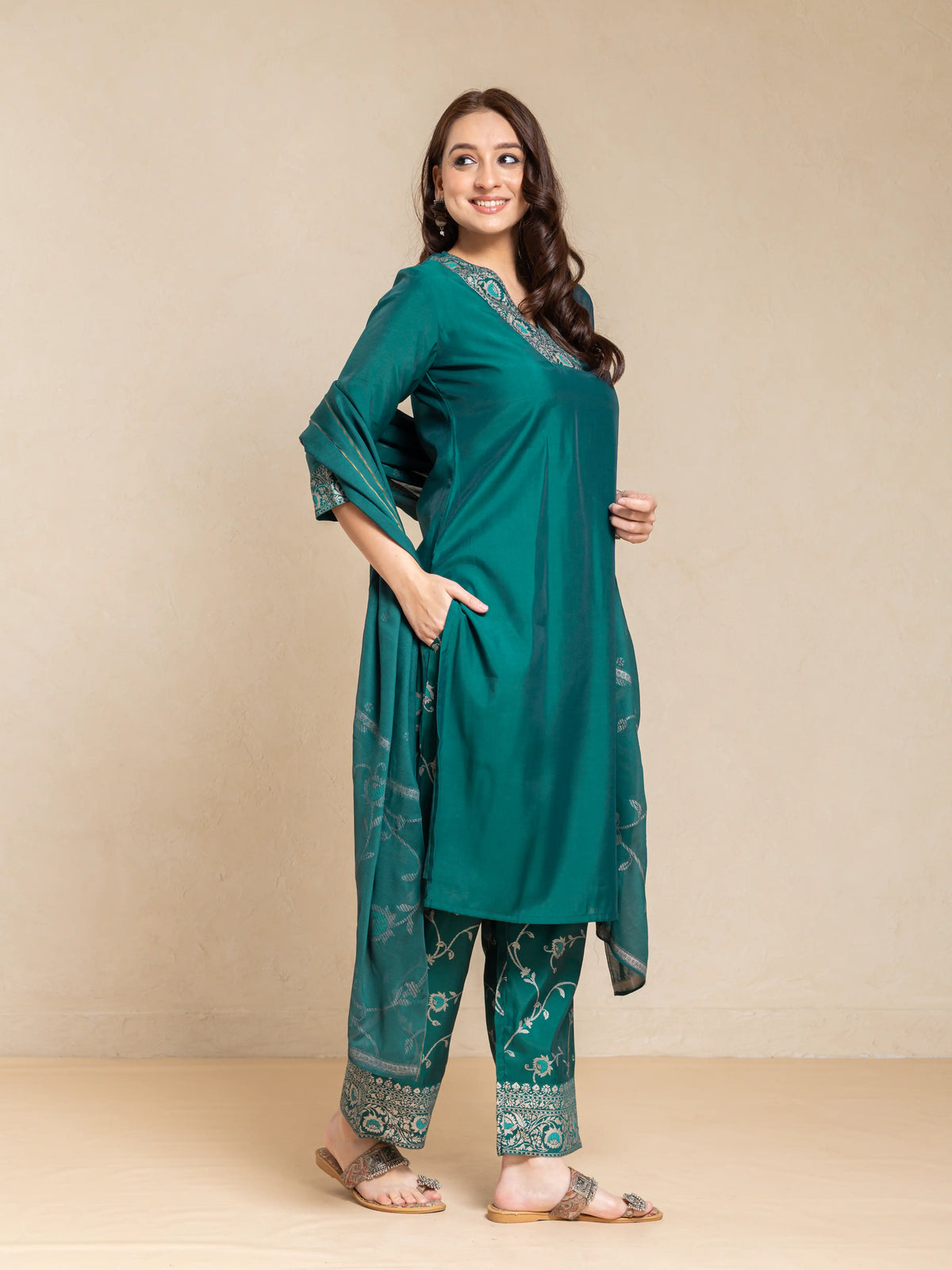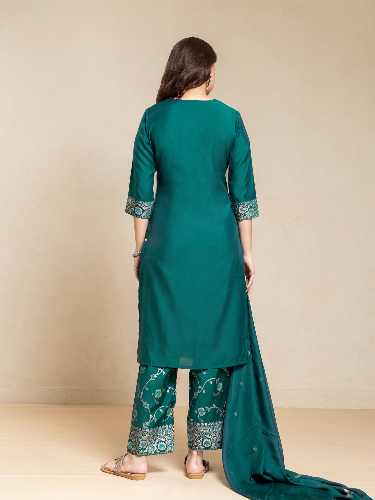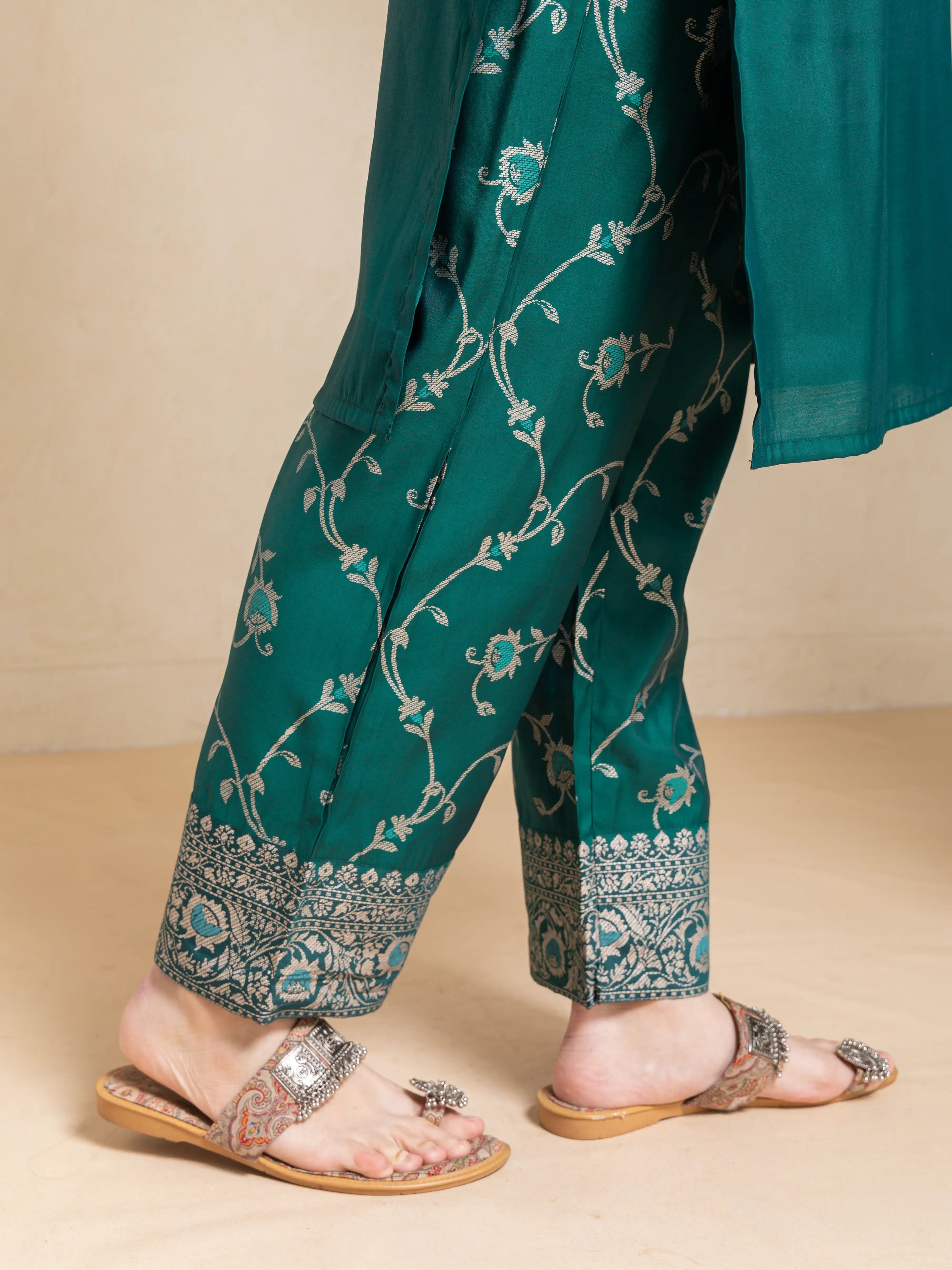 SILK BASE 3PC BROCADE GOLD PRINTED KURTA SET WITH SCALLOPED EMBROIDERY