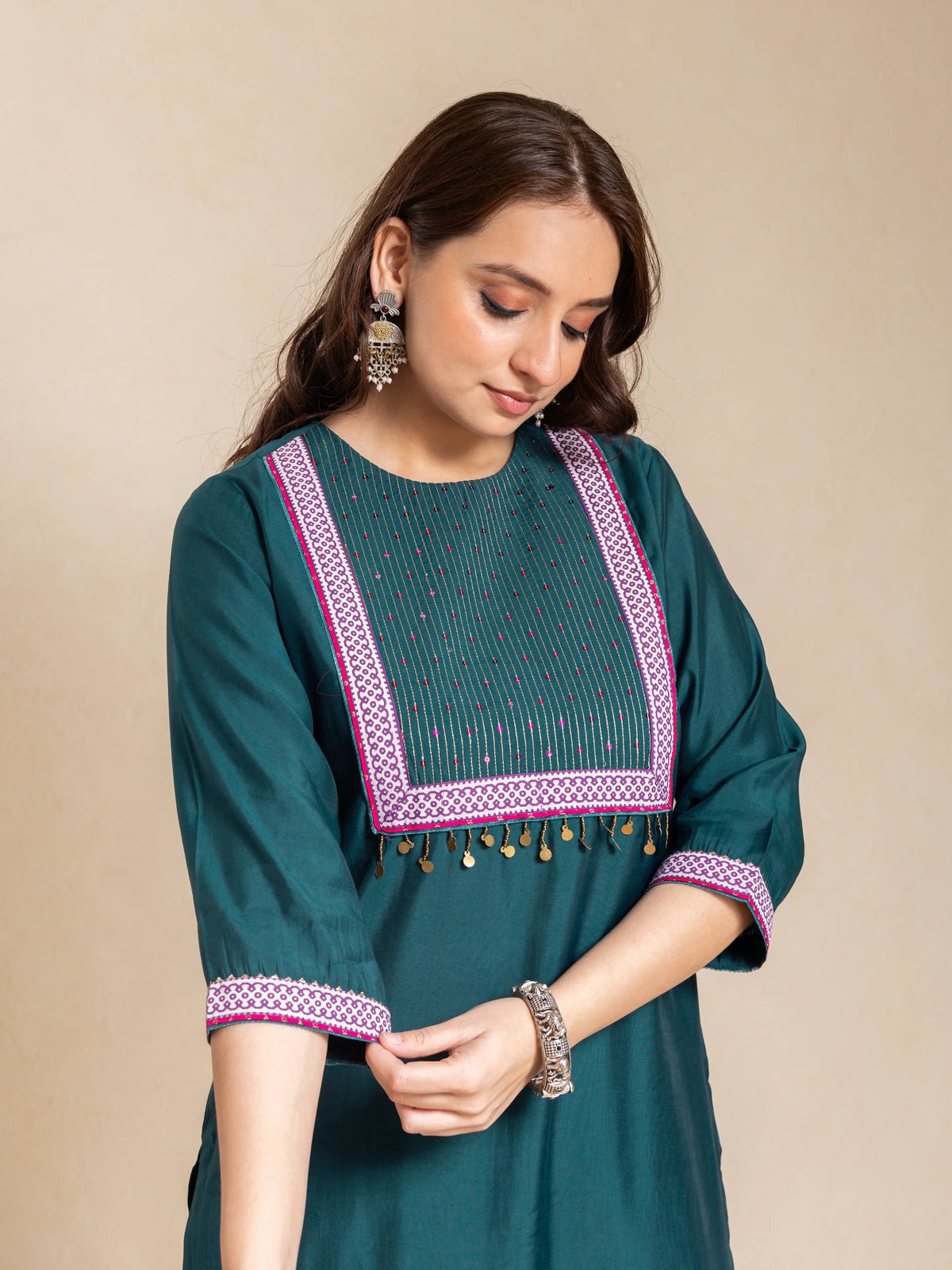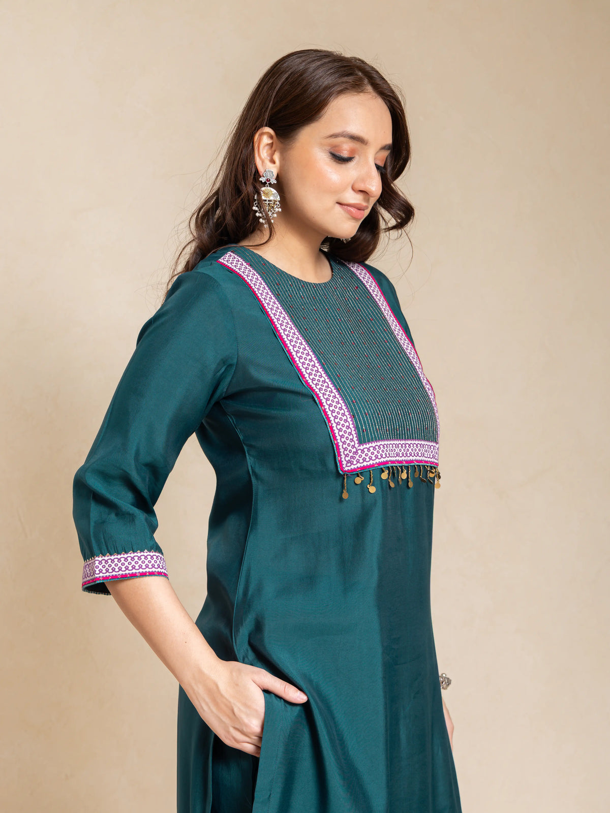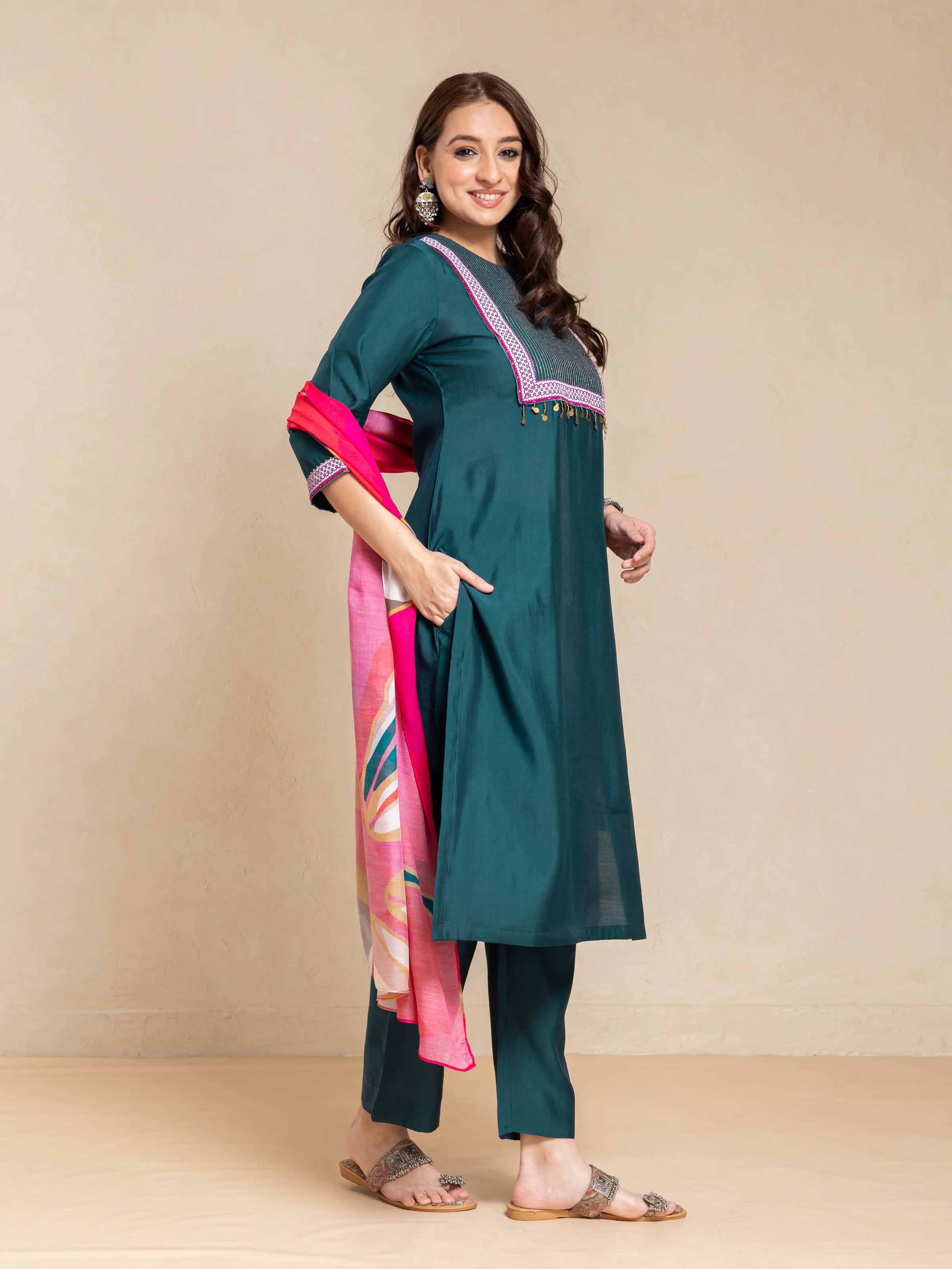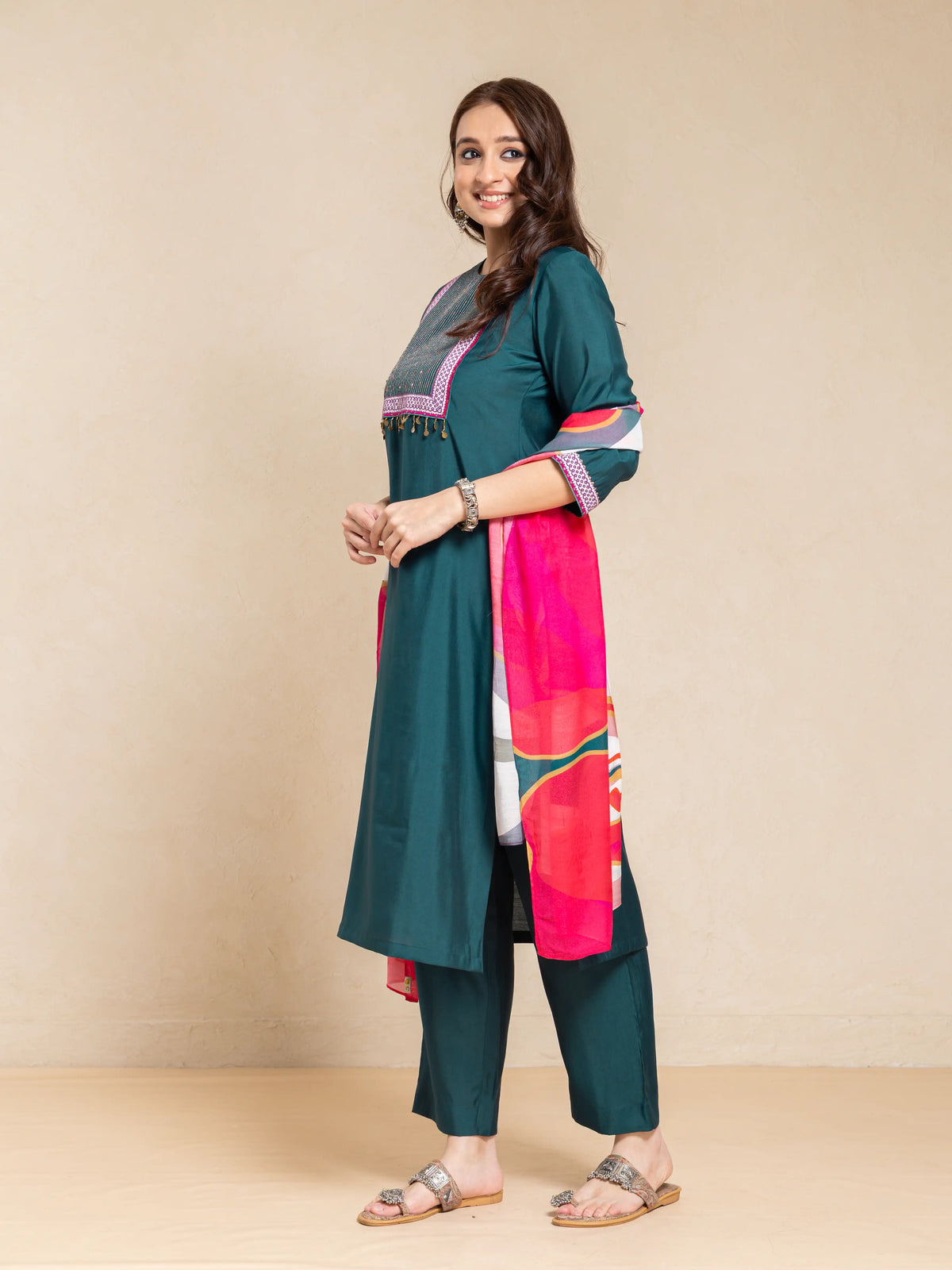 SILK BASE 3PC KURTA SET WITH SEQUENCE DETAIL PAIRED WITH DIGITAL PRINTED FLORAL DUPATTA