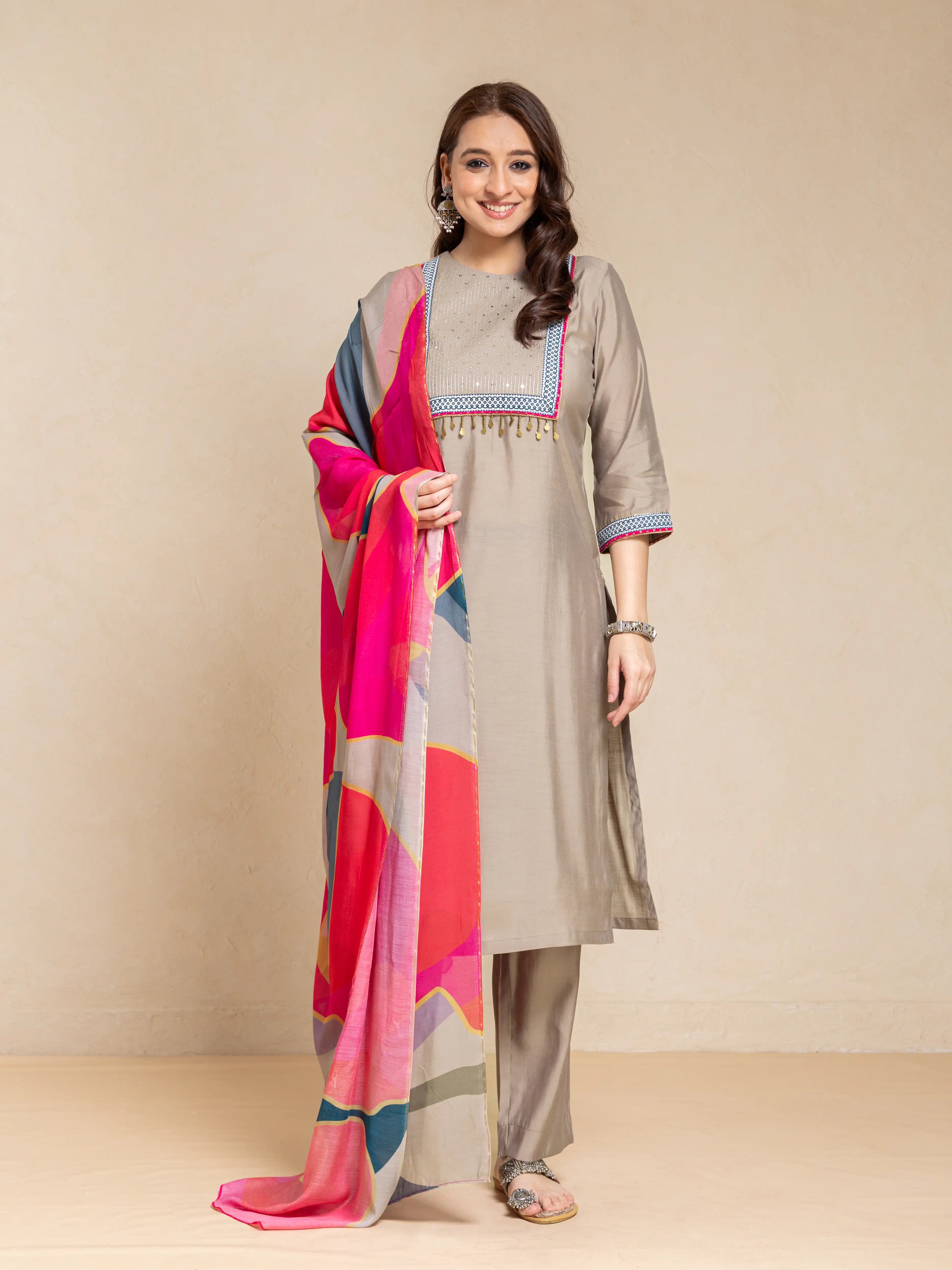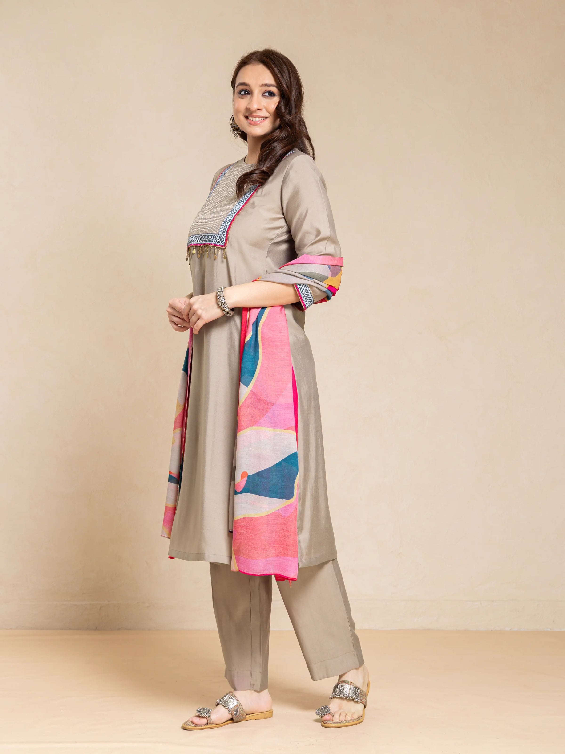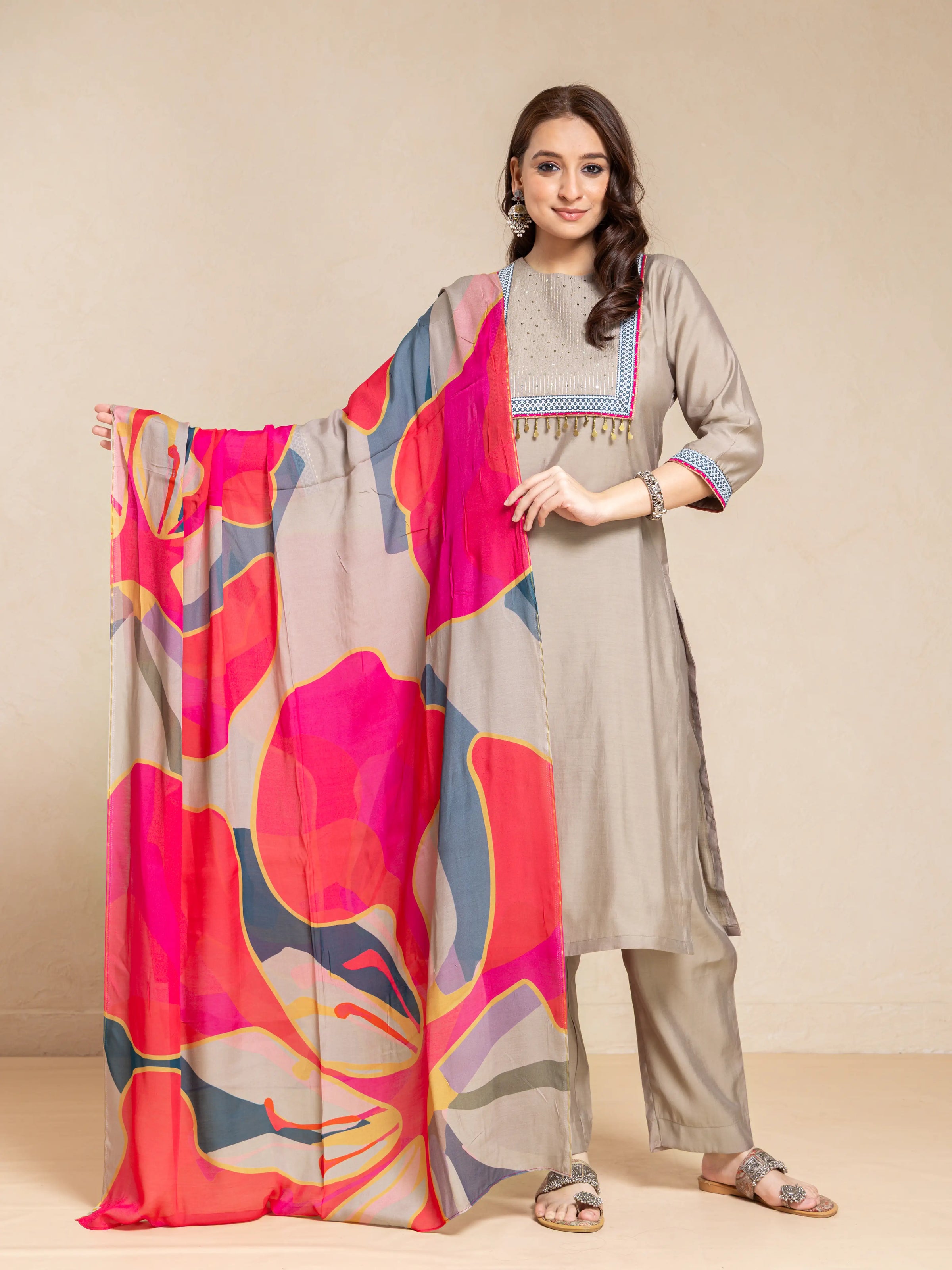 SILK BASE 3PC KURTA SET WITH SEQUENCE DETAIL PAIRED WITH DIGITAL PRINTED FLORAL DUPATTA