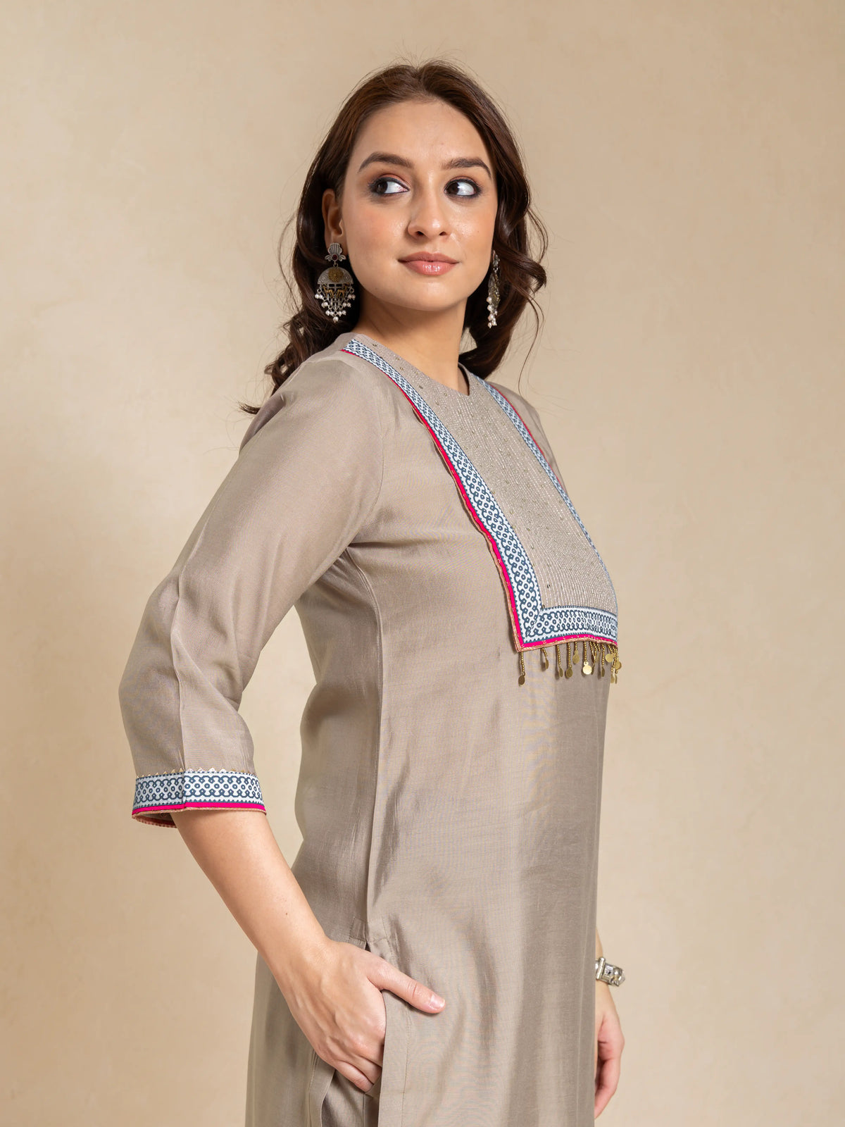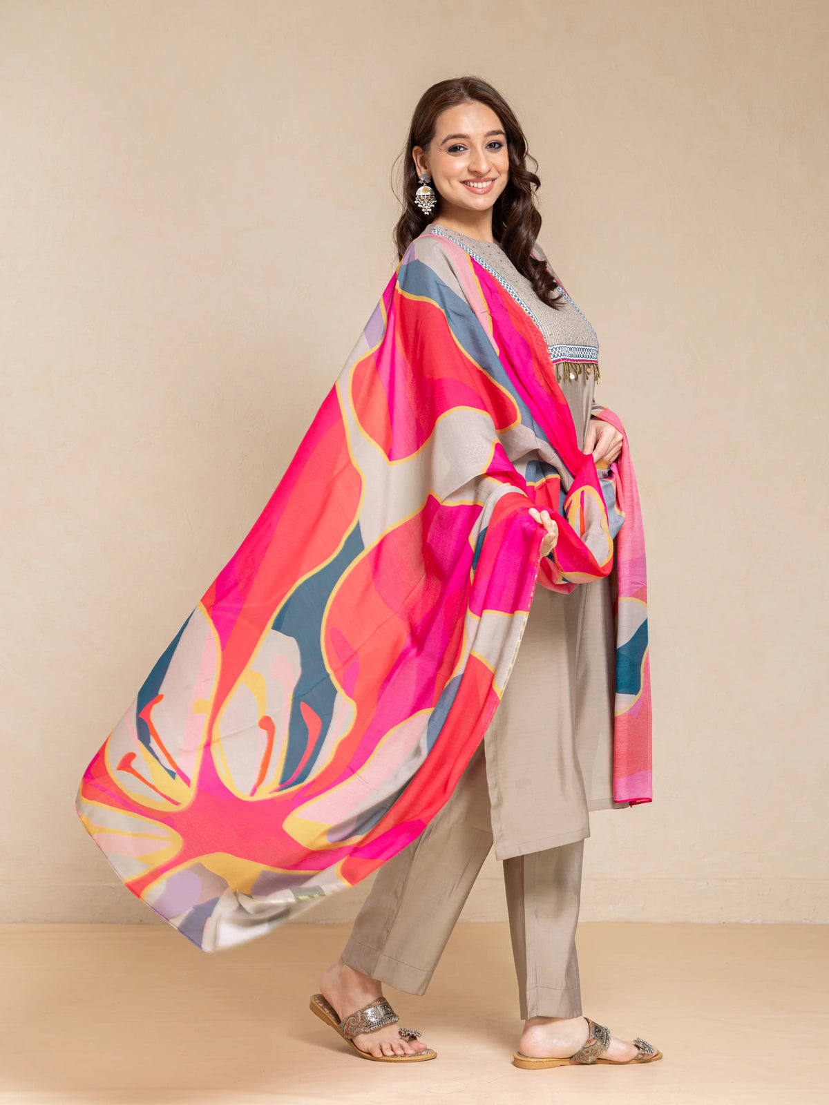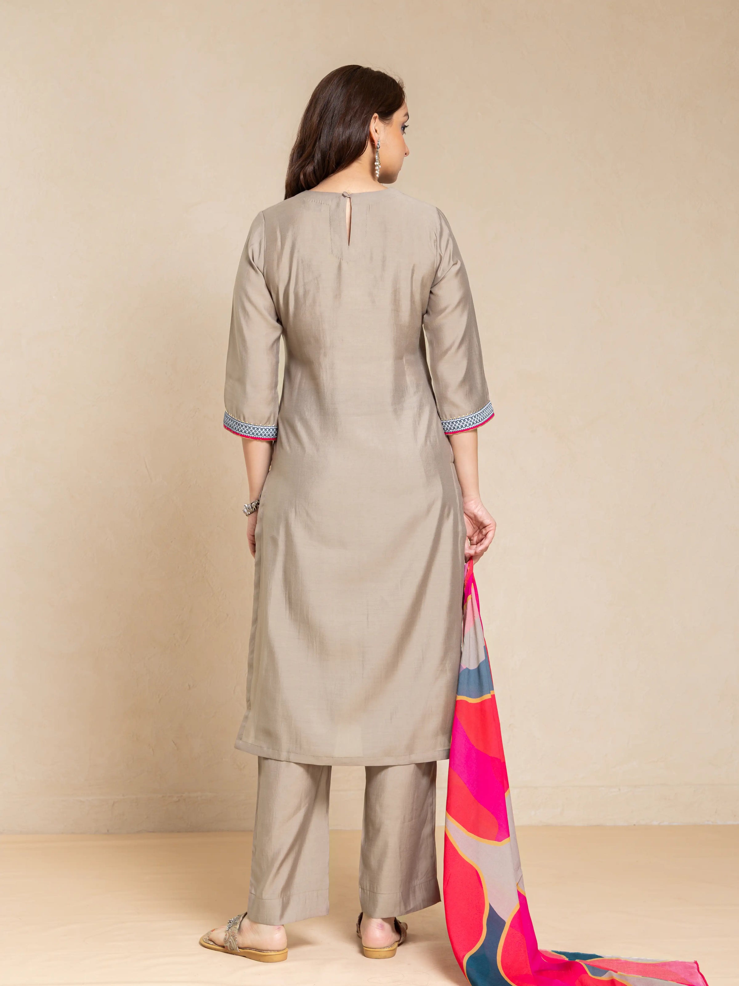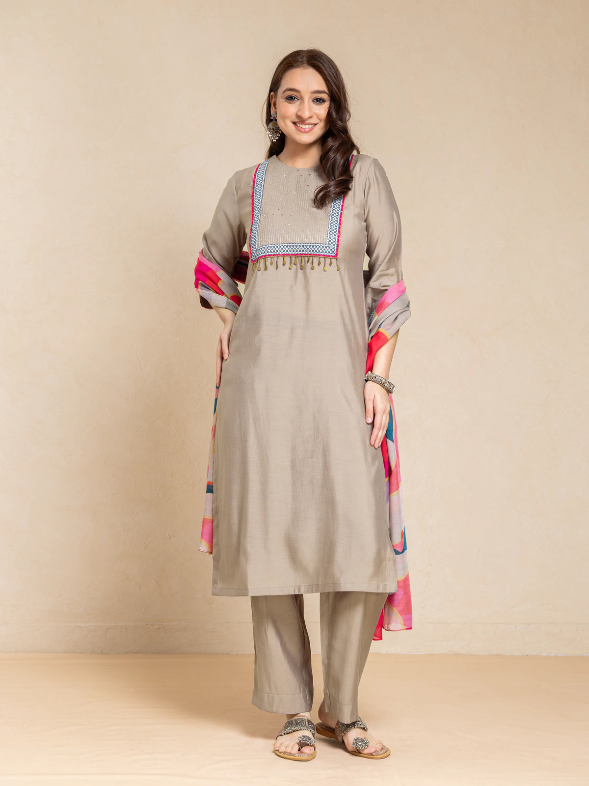 SILK BASE 3PC KURTA SET WITH SEQUENCE DETAIL PAIRED WITH DIGITAL PRINTED FLORAL DUPATTA