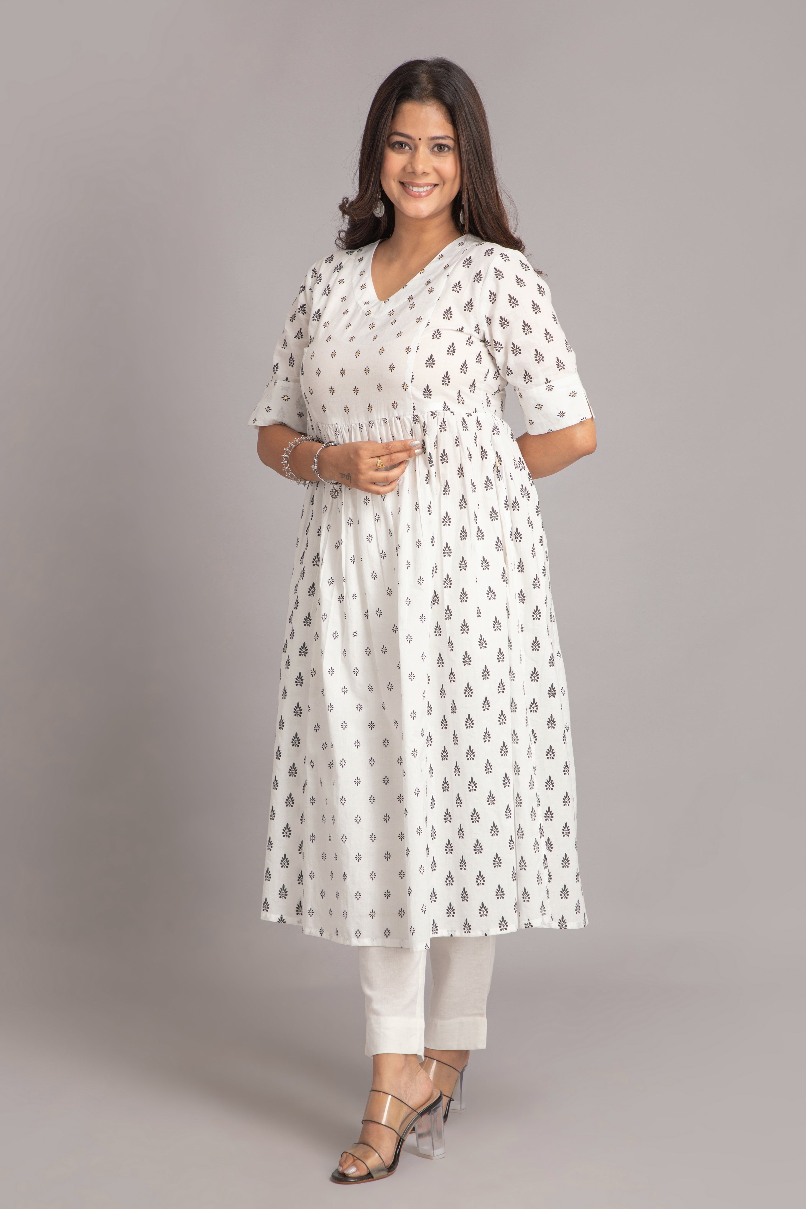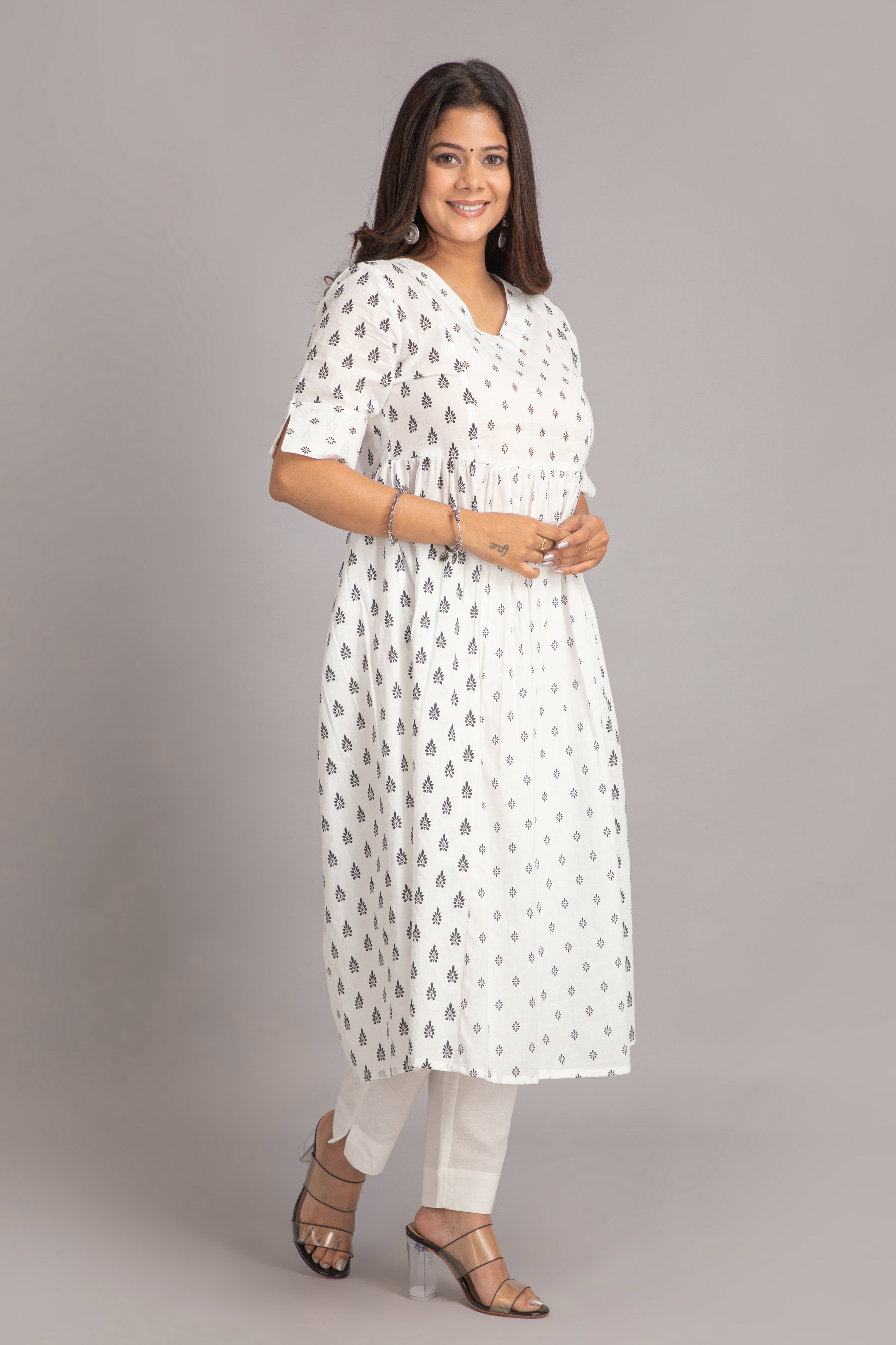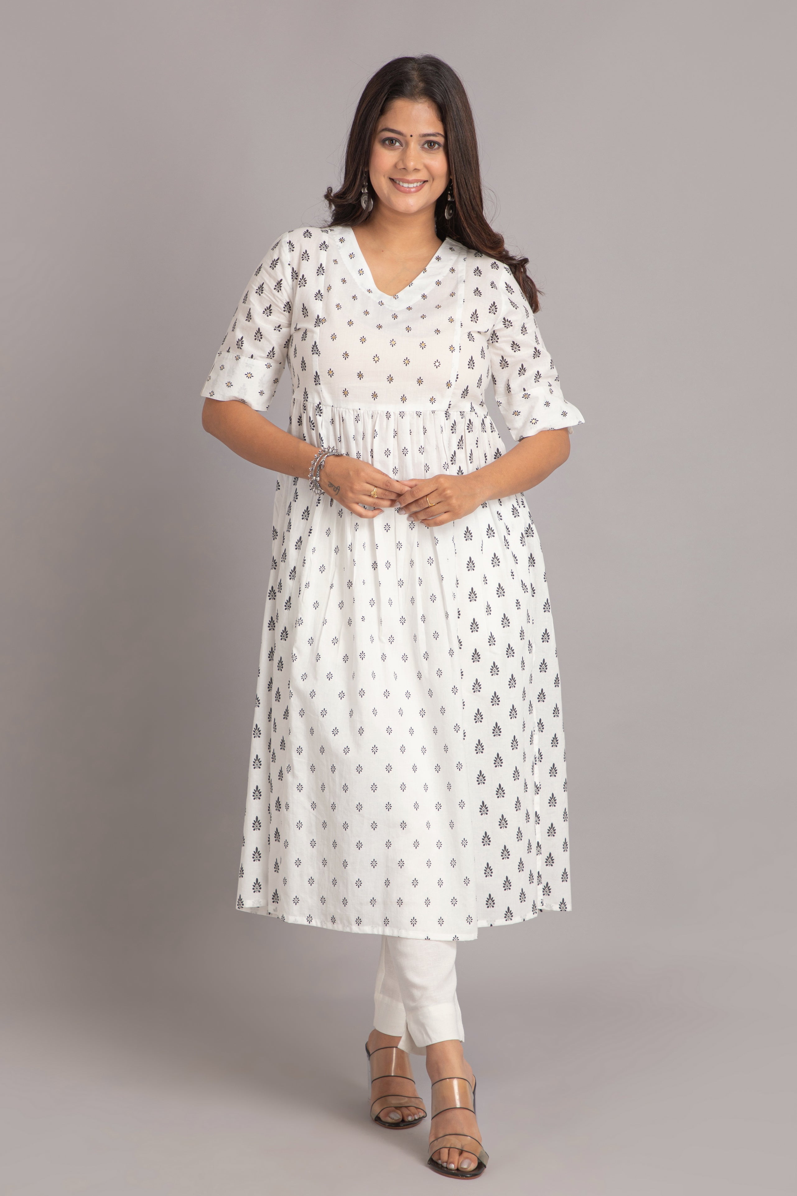 Mul Cotton Printed Flared Long Kurti with Sequin Detail