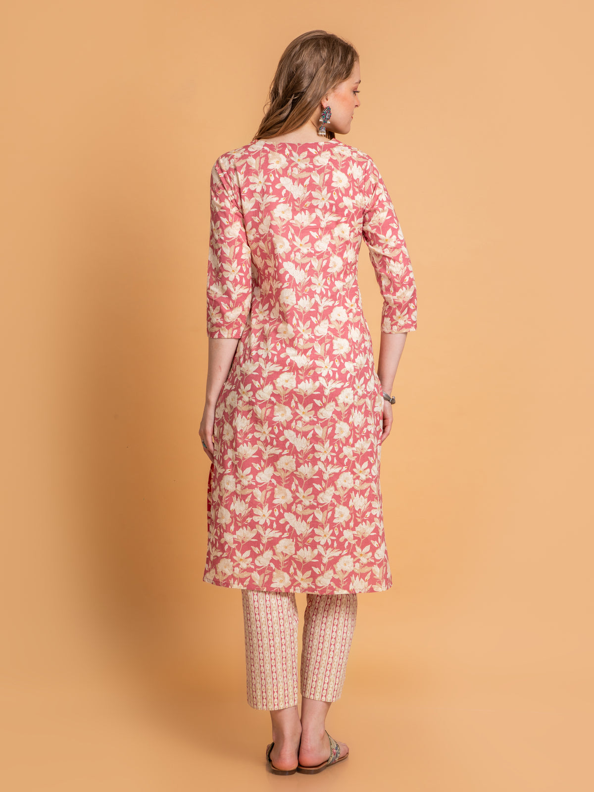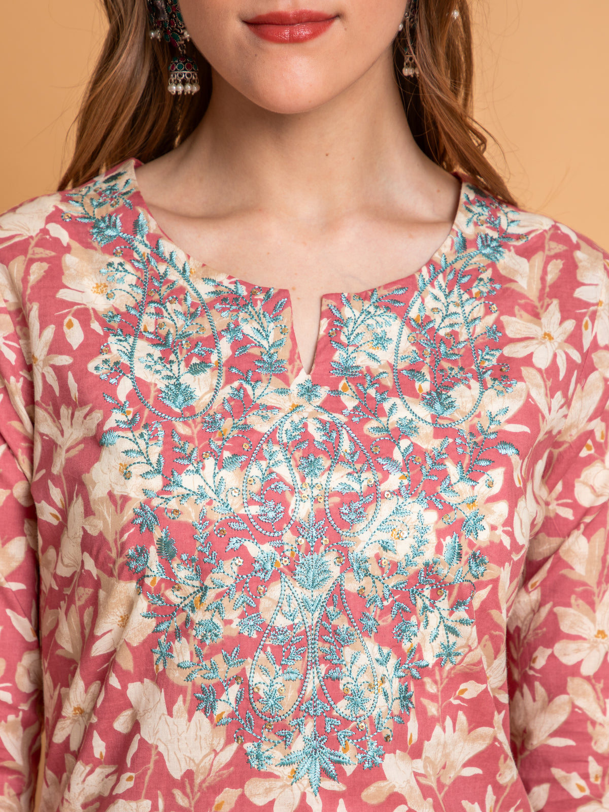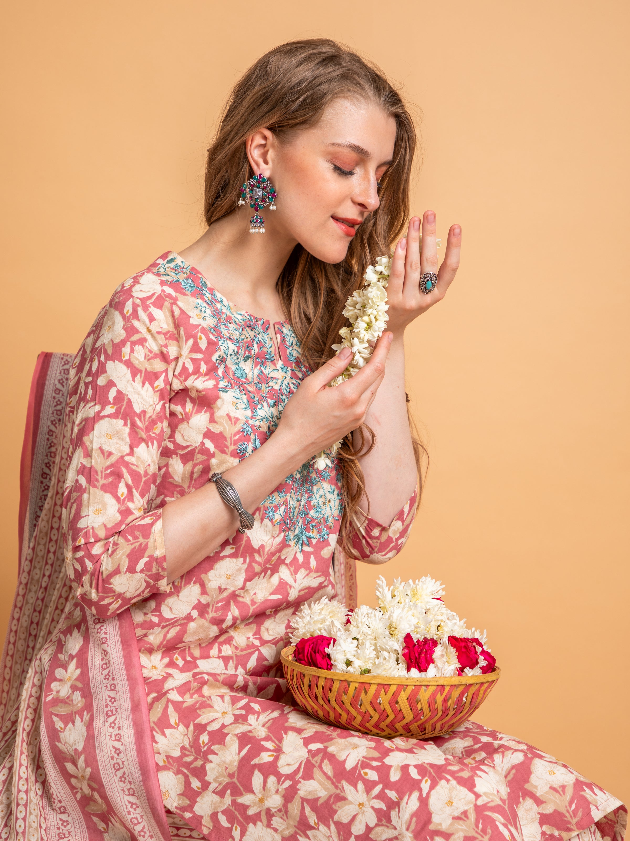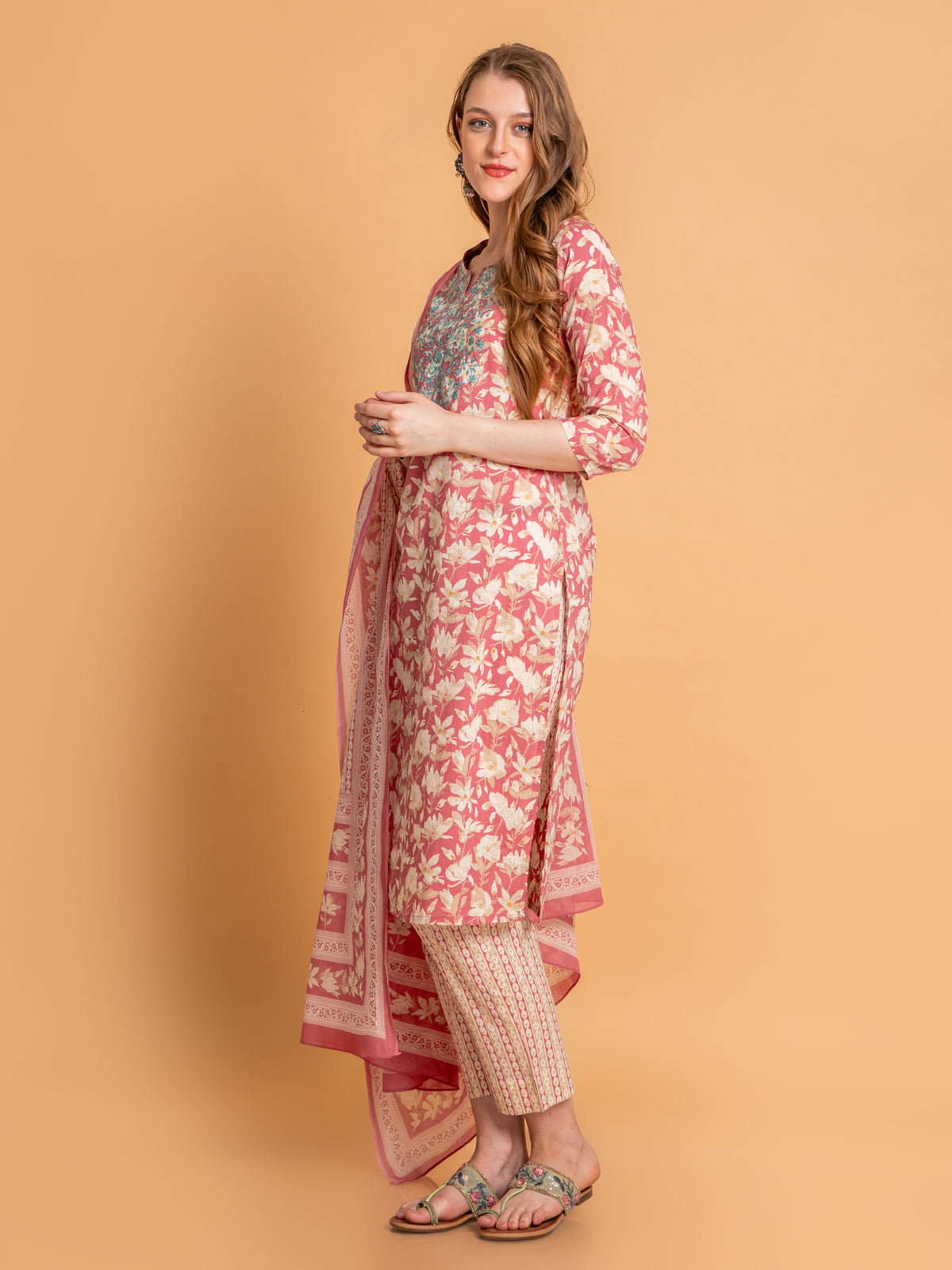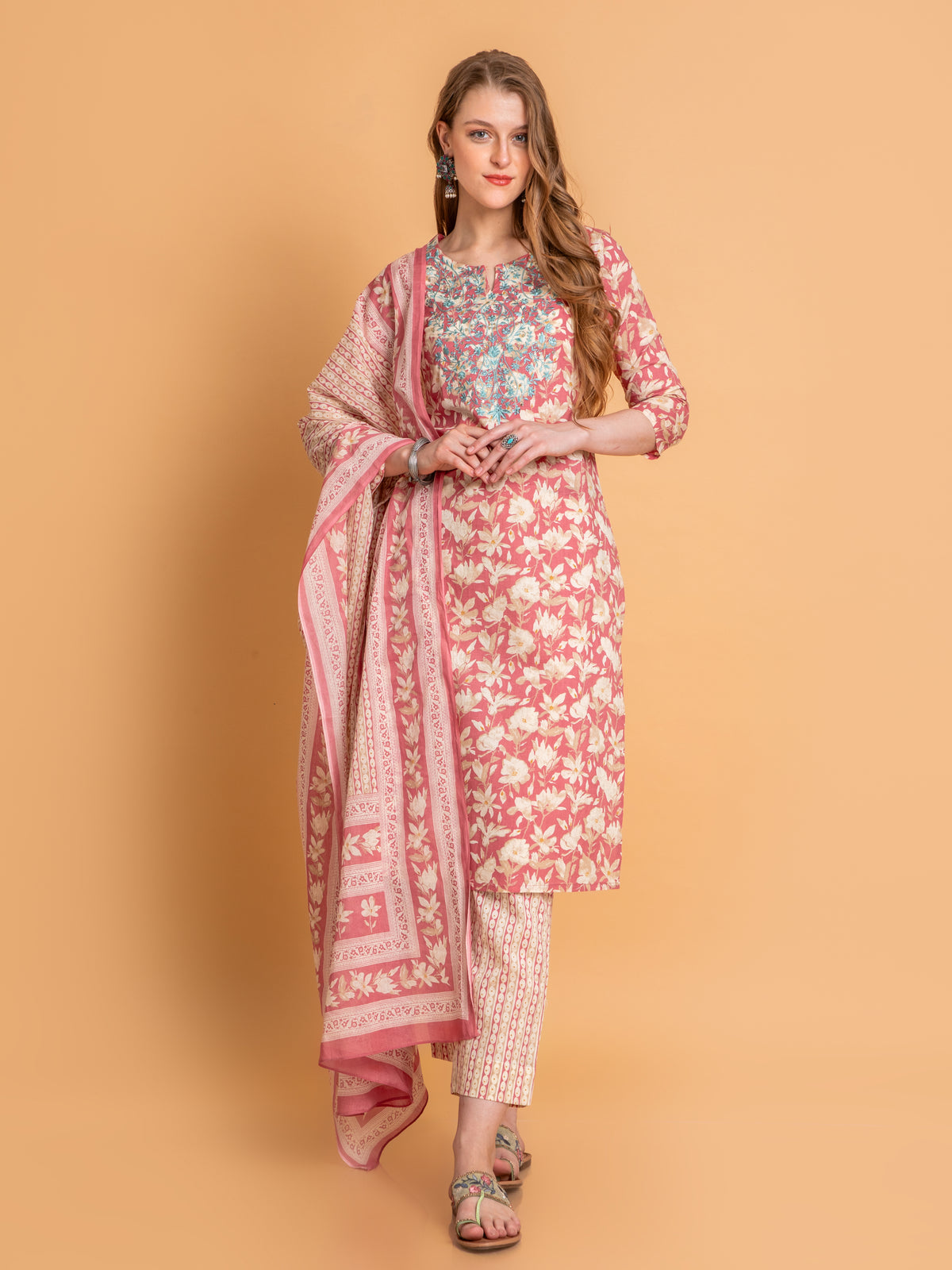 Women Peach Blossom MUL COTTON PRINTED 3PC EMBROIDERED SET