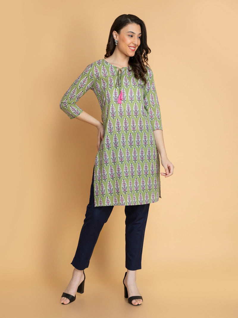 Women Pista Green MUL-COTTON PRINTED KURTI WITH DORI LATKAN DETAIL