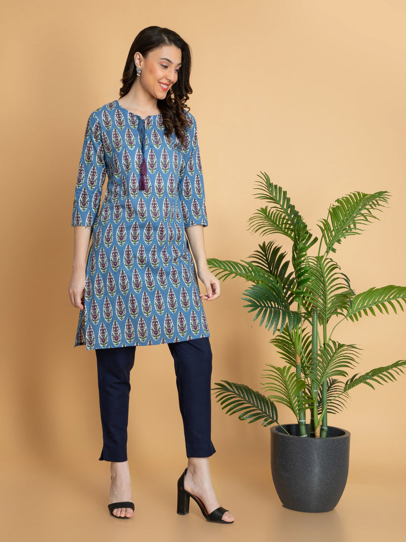 Women True Blue MUL-COTTON PRINTED KURTI WITH DORI LATKAN DETAIL