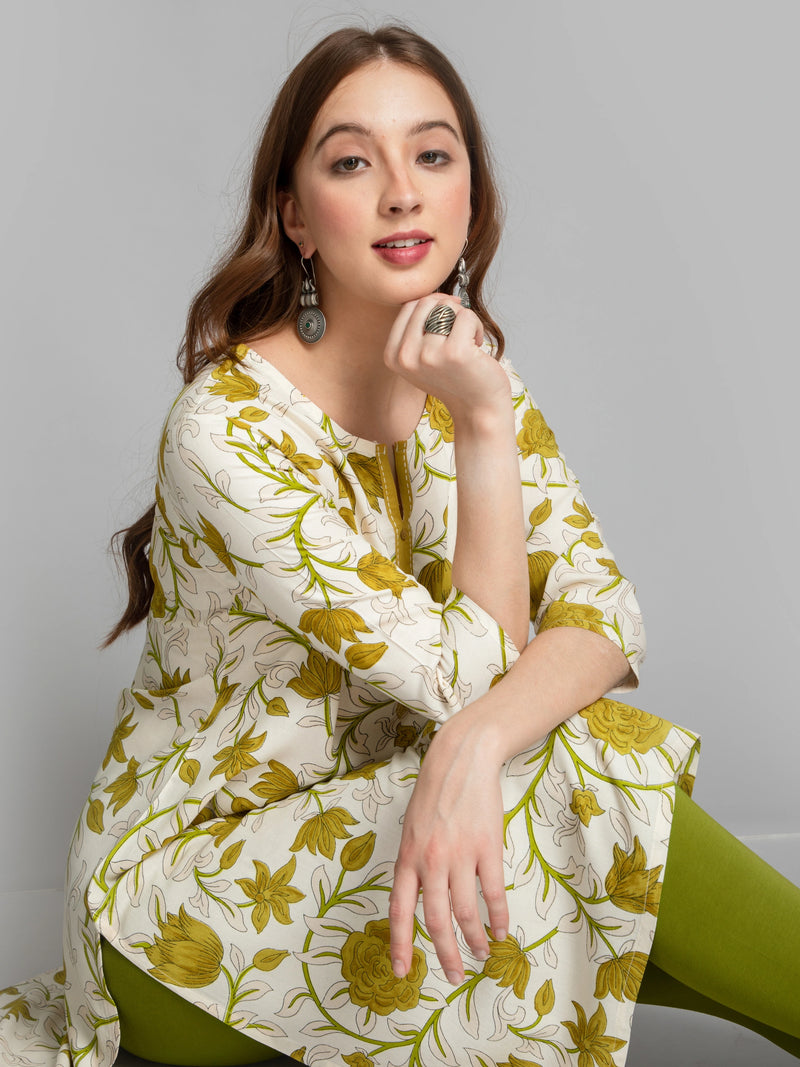 Women Light Yellow FLORAL PRINTED LONG KURTA.