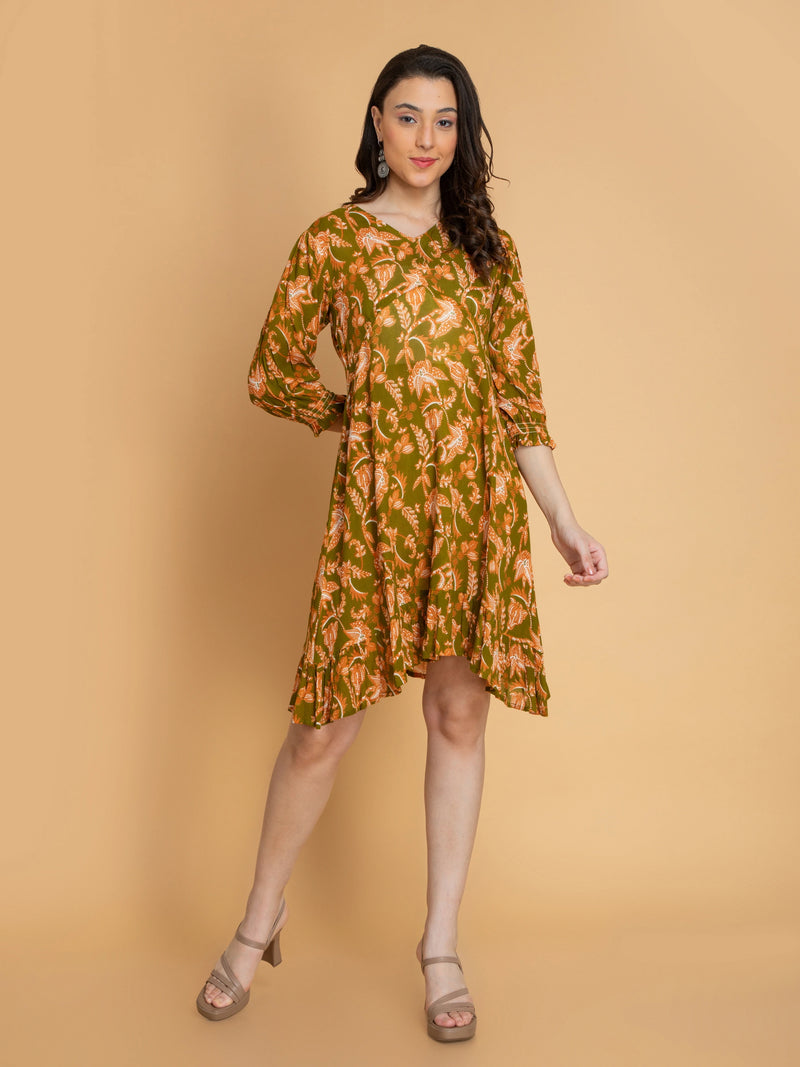 Women Green PRINTED ALIYA CUT SHORT DRESS