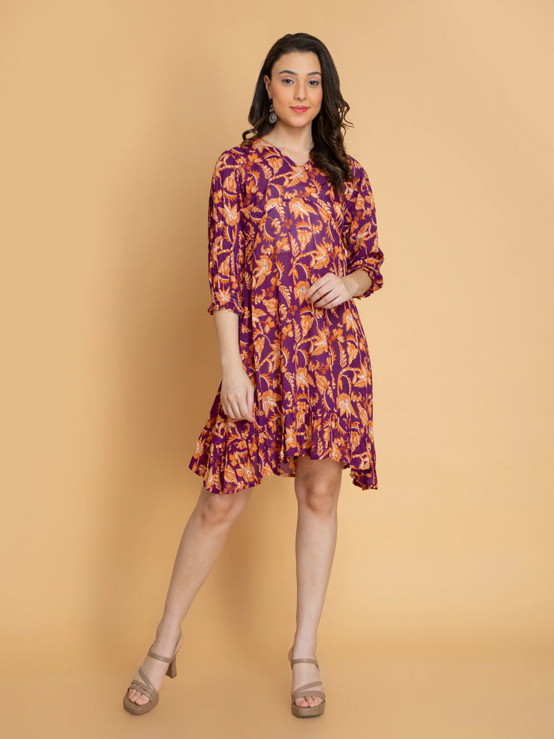 Women Purple Wine PRINTED ALIYA CUT SHORT DRESS