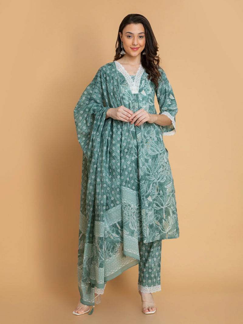 Women Deep Sea MUL COTTON 3PC PRINTED SUIT SET WITH LACE DETAILS