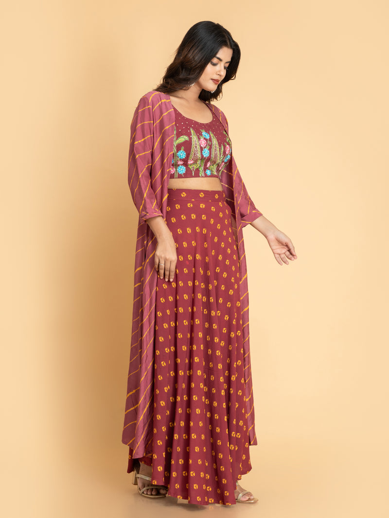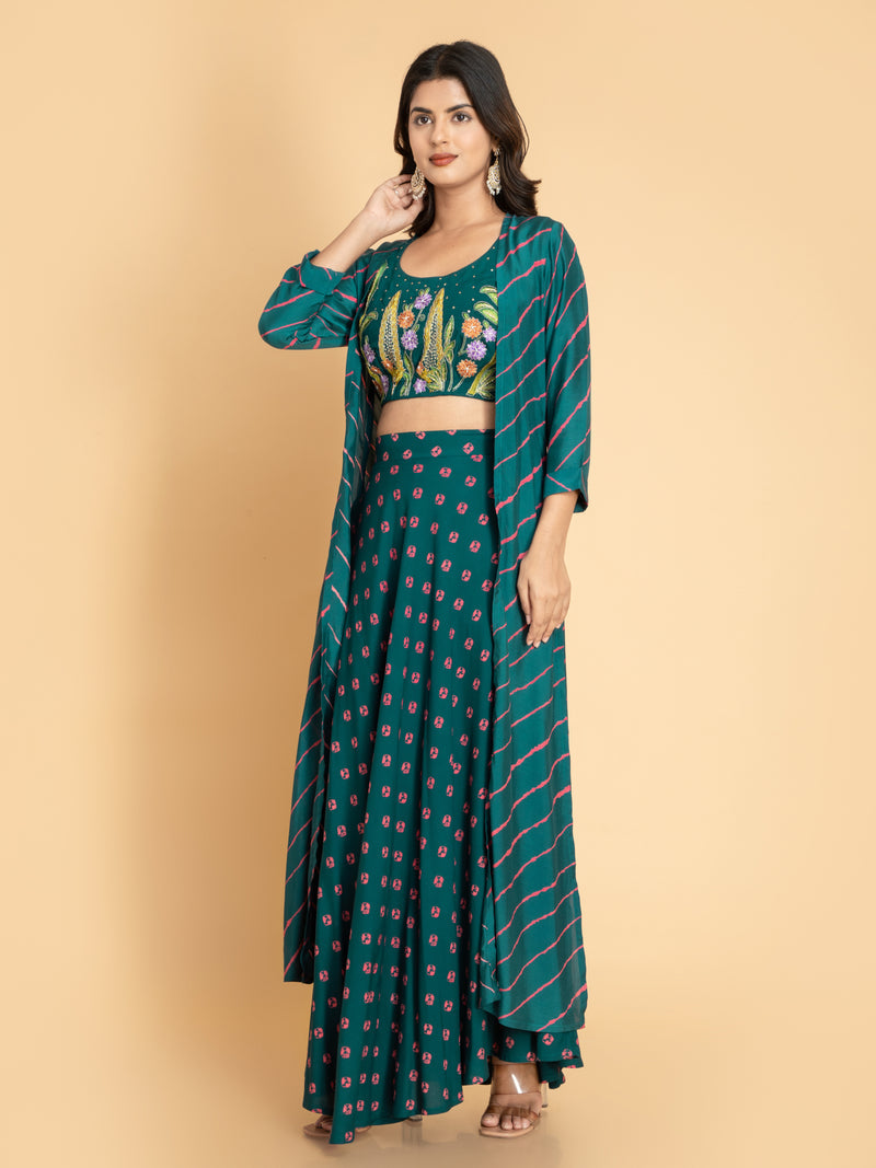 Women Posy Green FUSION WEAR 3PC SKIRT SHRUG SET WITH COLORFUL EMBROIDERED, ADDA WORK EMBELLISHMENT