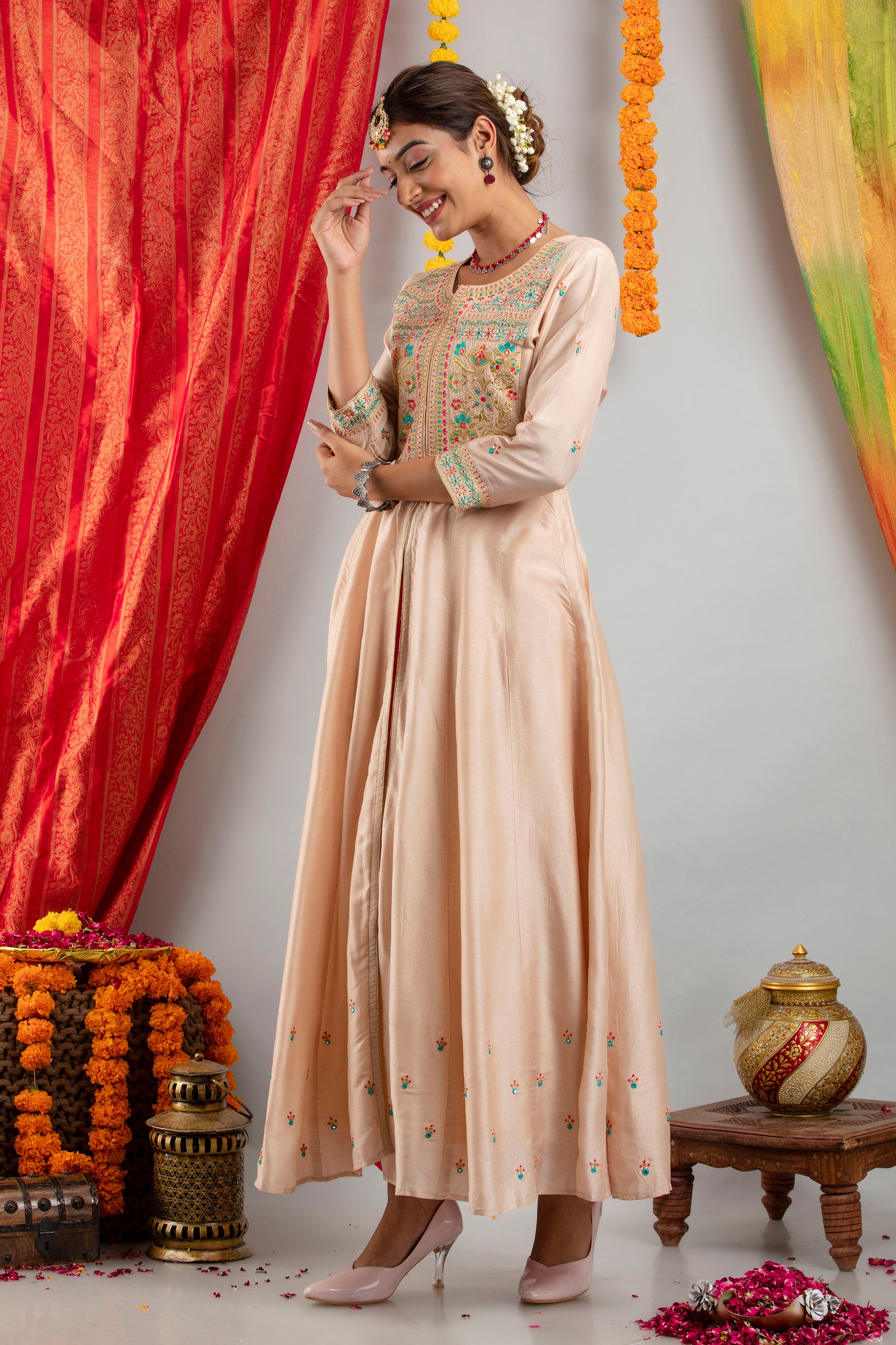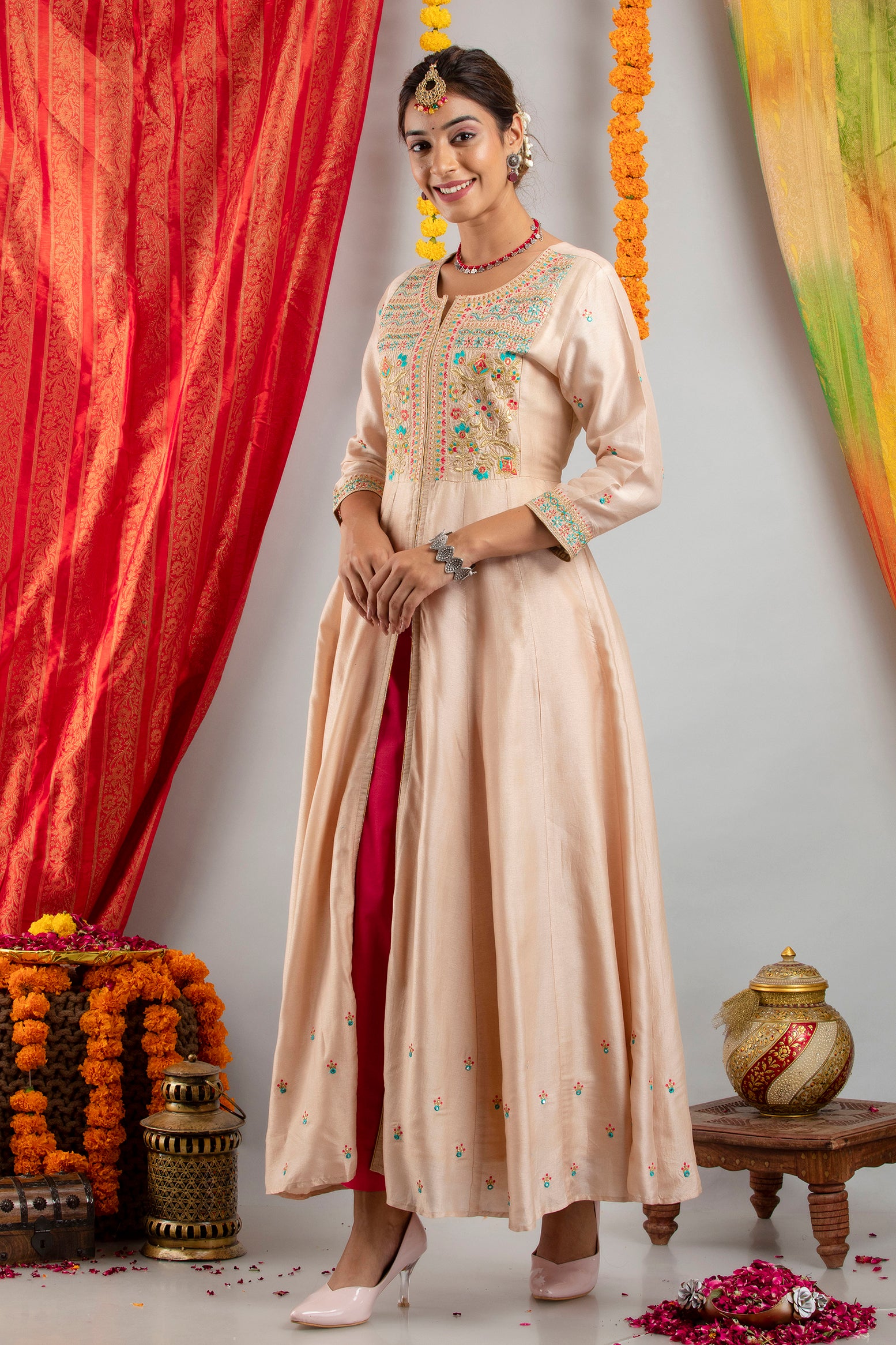 Elegant and timeless, this FESTIVE WEAR EMBROIDERED KALIDAR KURTA SET in soft DOLA SILK is a must-have for every woman's ethnic collection. The rich festive wear embroidered kalidar kurta set detailing enhances its beauty, making it ideal for festive occasions and stylish gatherings. Its graceful fit and modern design ensure you stand out with elegance and ease. Complete the look with complementing jewelry and footwear. Style this elegant piece with your favorite accessories to complete the perfect look.
