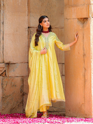 Woven in pure muslin silk, this limited-edition three-piece kalidar kurta set carries the quiet weight of true craftsmanship. Intricate adda work trails across the neckline and shoulders, while delicate all-over embroidery motifs add depth to every fold. In lime sherbet — a timeless choice for the woman who celebrates femininity with grace. Ideal for festive gatherings and intimate ceremonies.