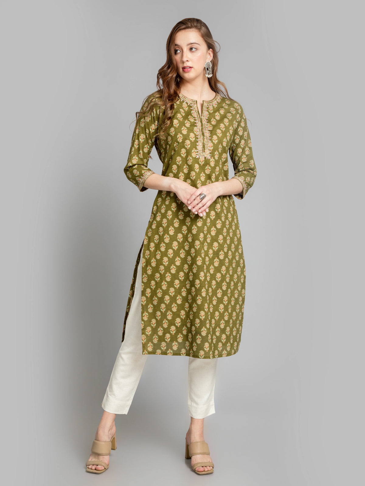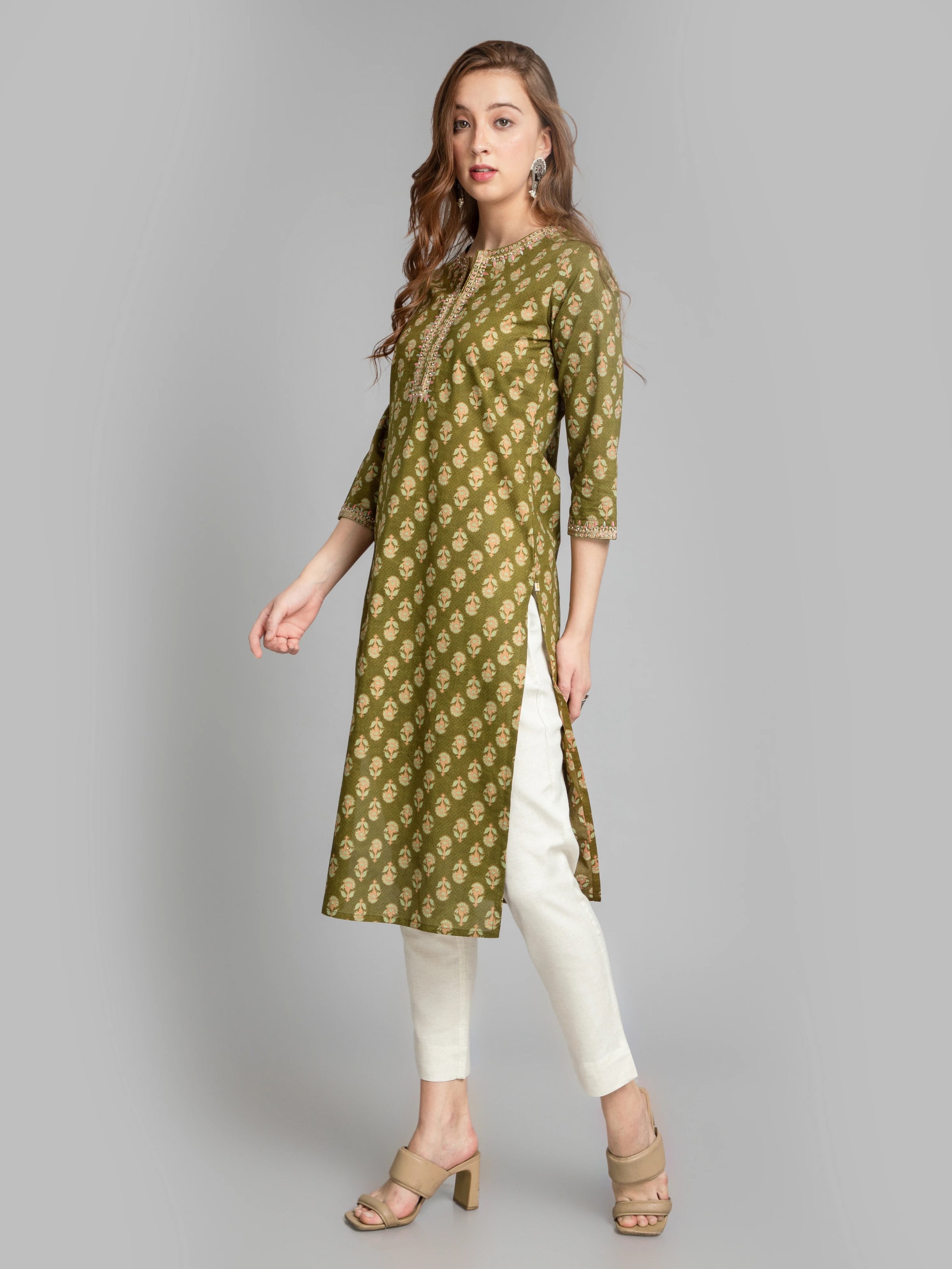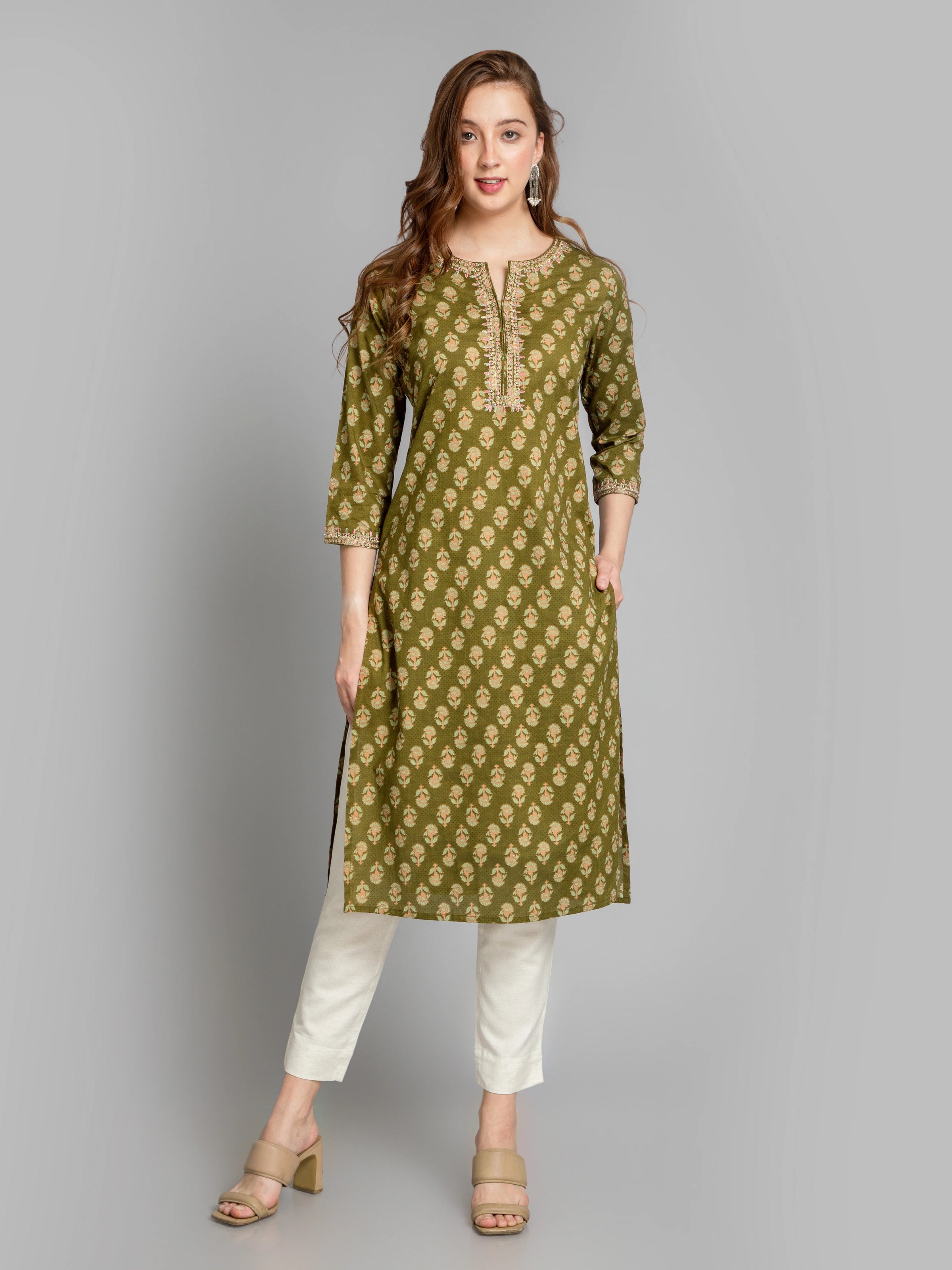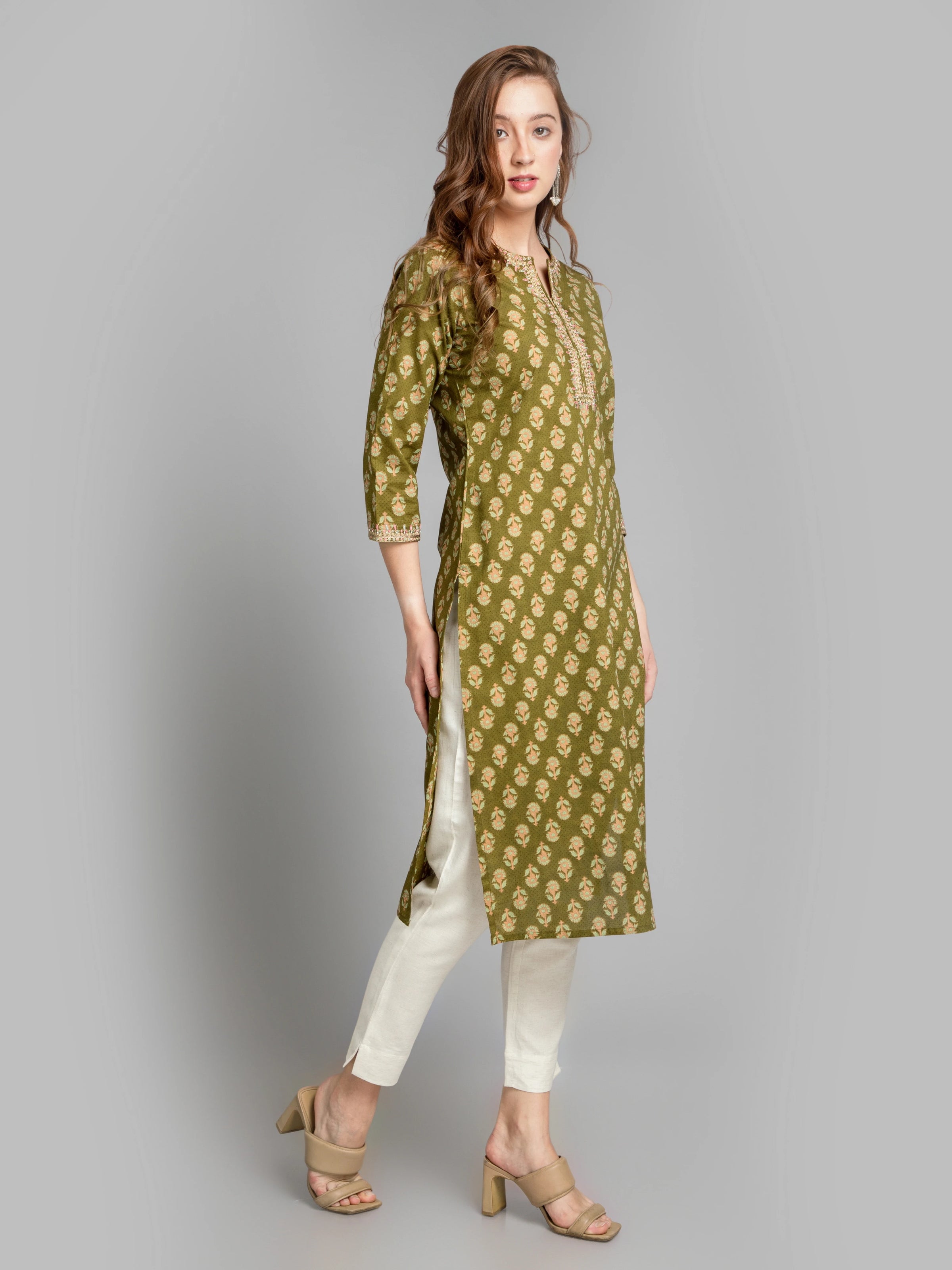 Embroidered Mul Cotton Kurti with Sanganeri Print