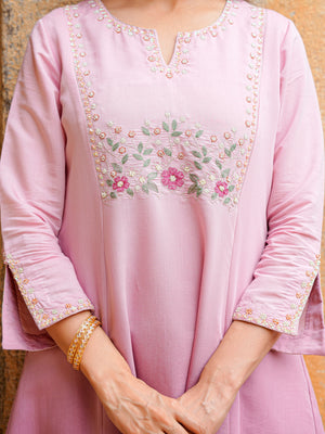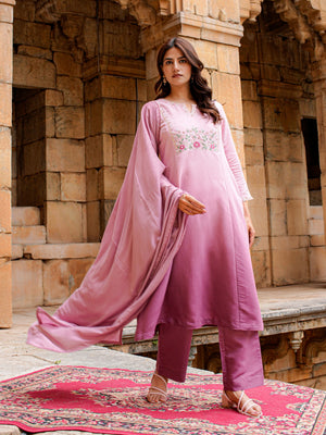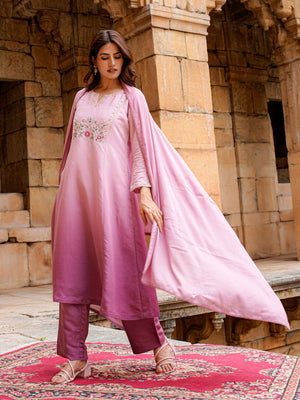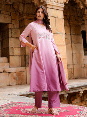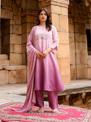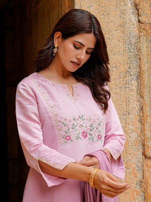 Pink Lavender Roman Silk Adda Work 3 Pc Kurta Set Women