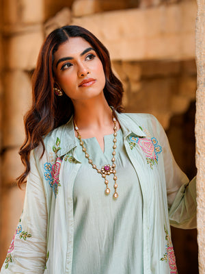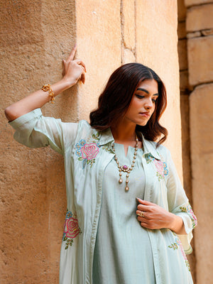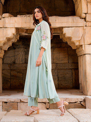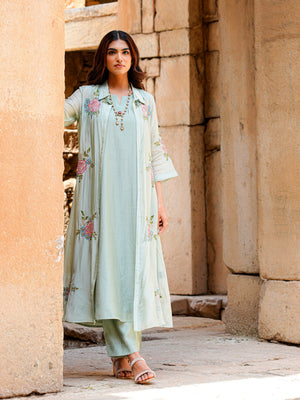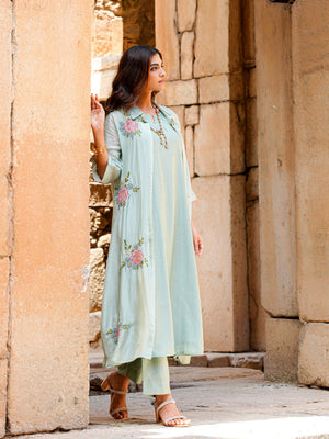 Sage Green Roman Silk Flared Kurta Set Women Occasion Wear