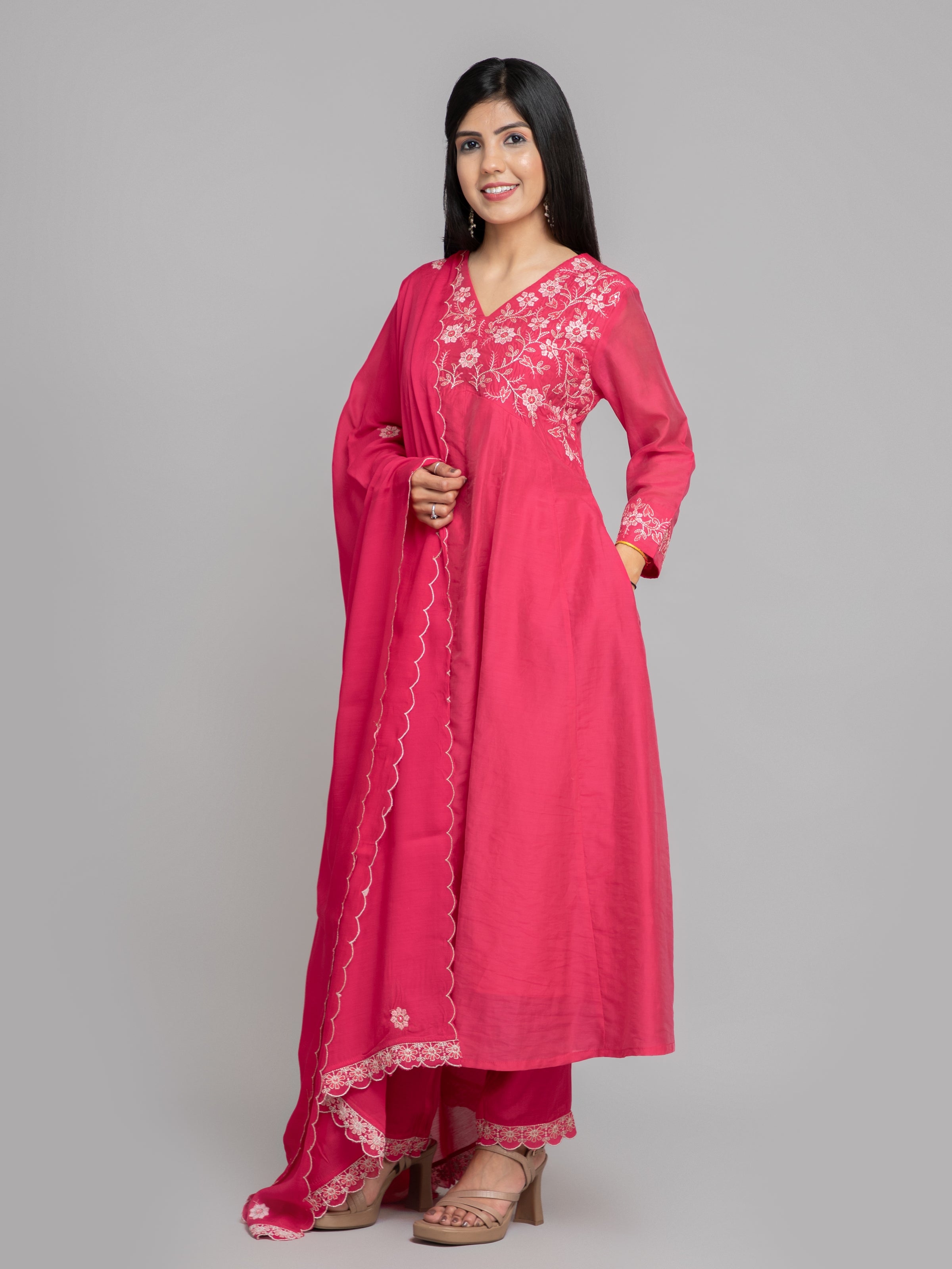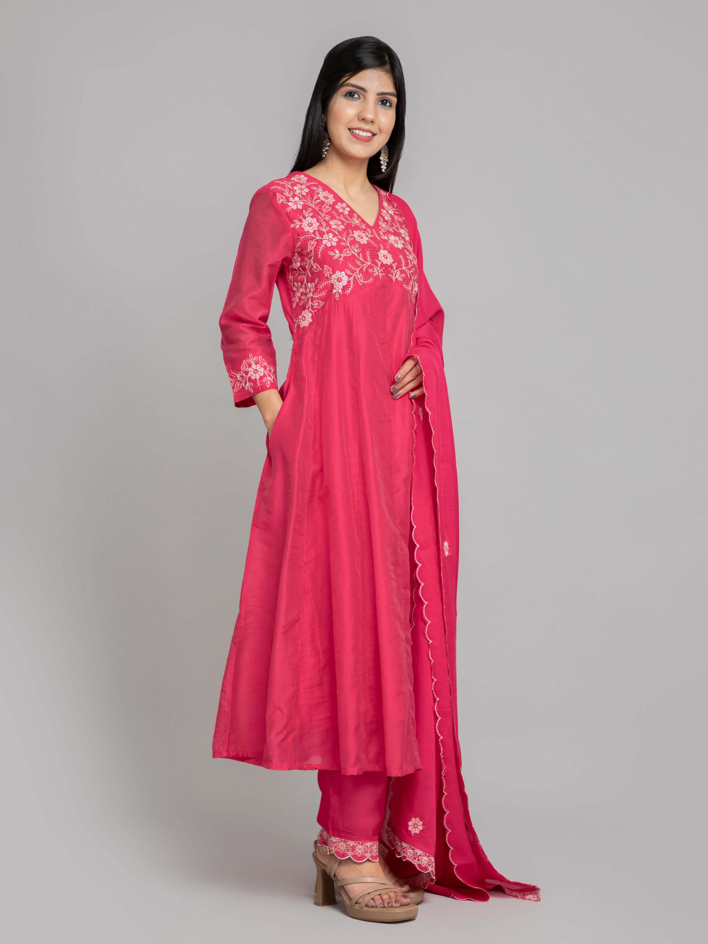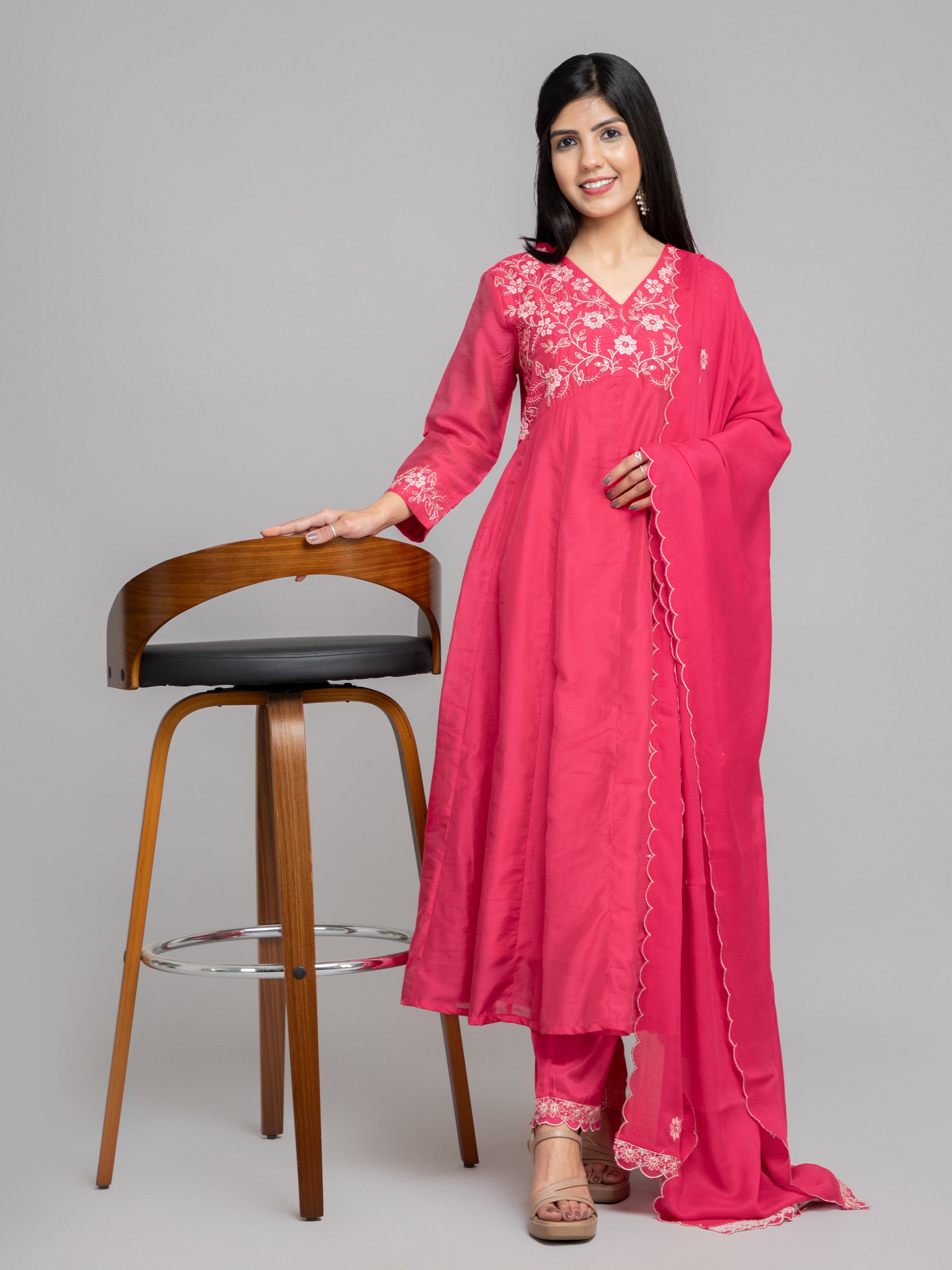 Women Bright Rose CHANDERI SILK CHIKANKARI EMBROIDERED 3PC ALIA CUT 3PC SET