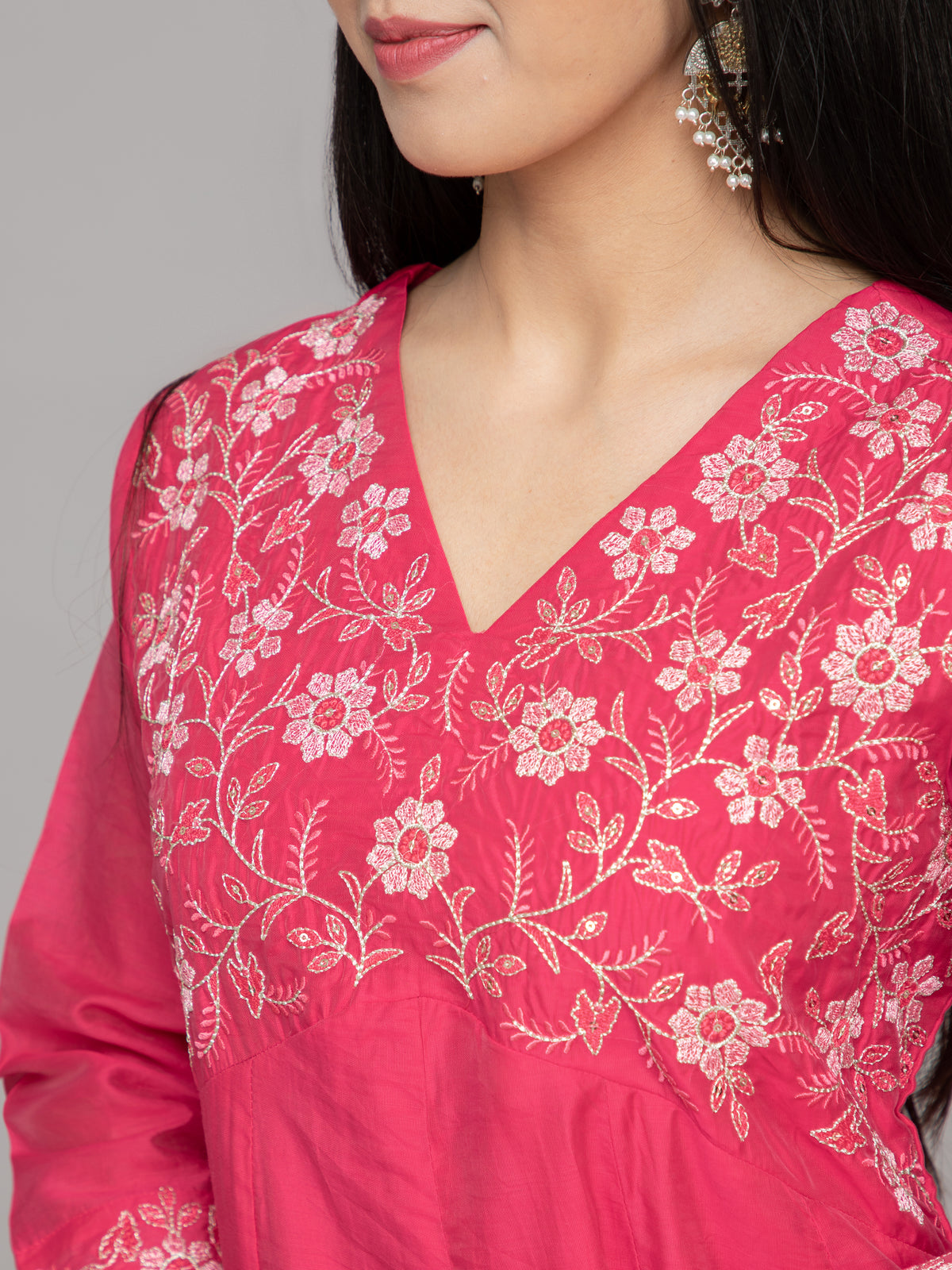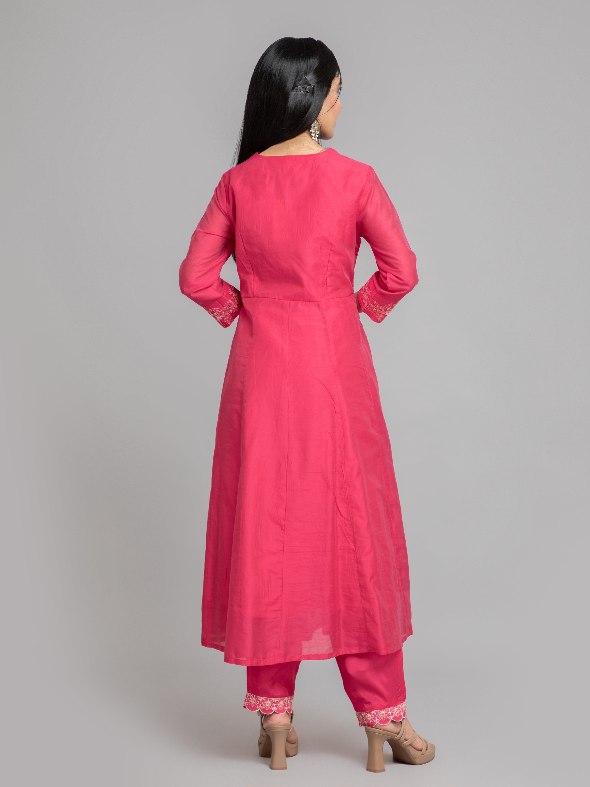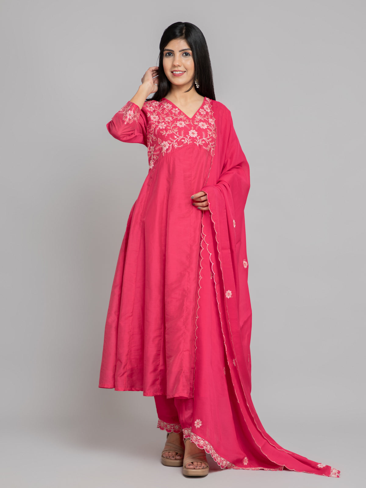 Women Bright Rose CHANDERI SILK CHIKANKARI EMBROIDERED 3PC ALIA CUT 3PC SET