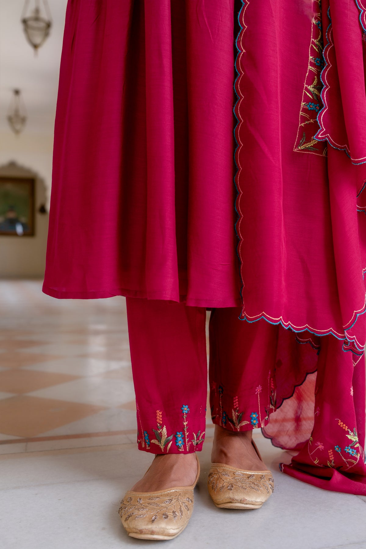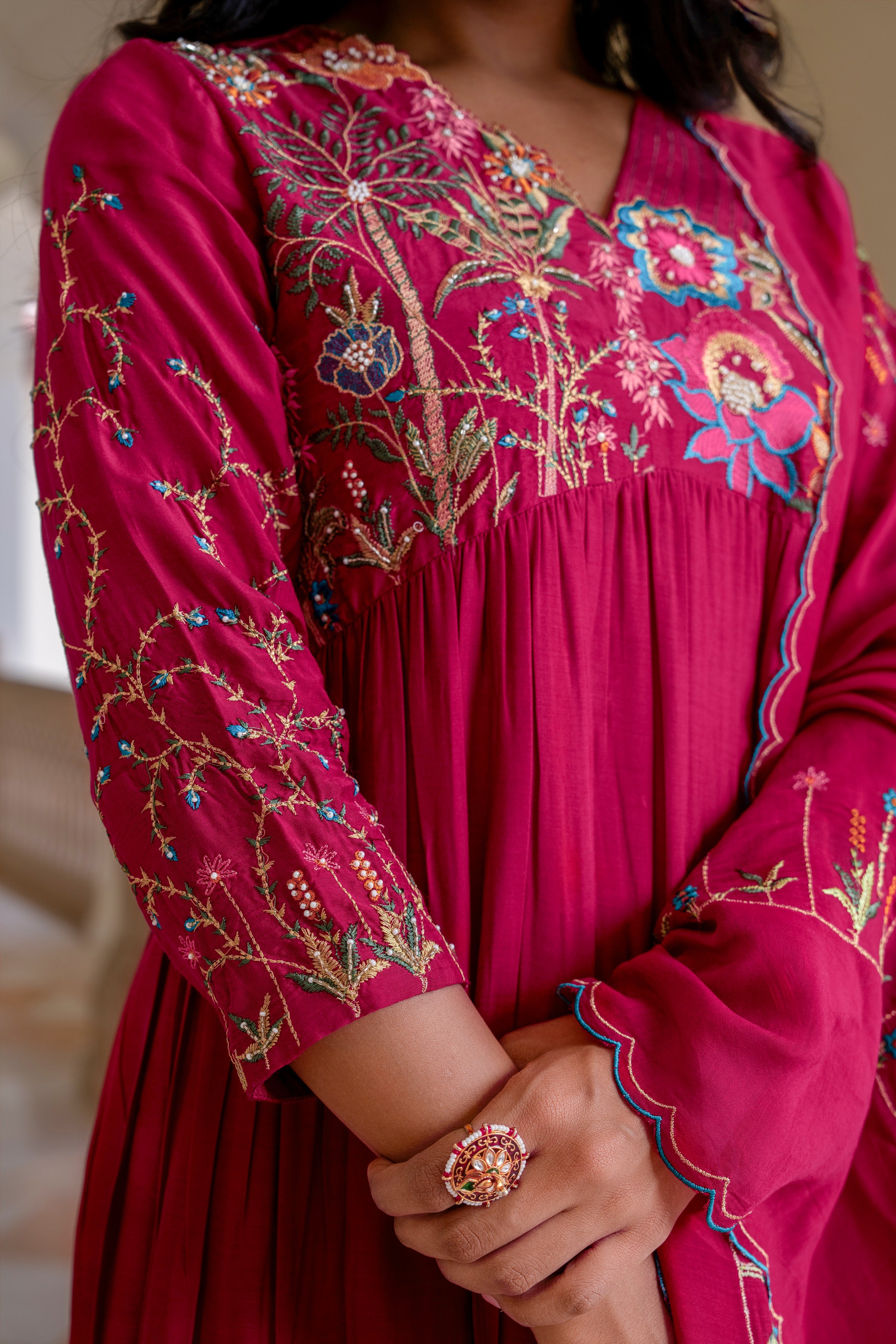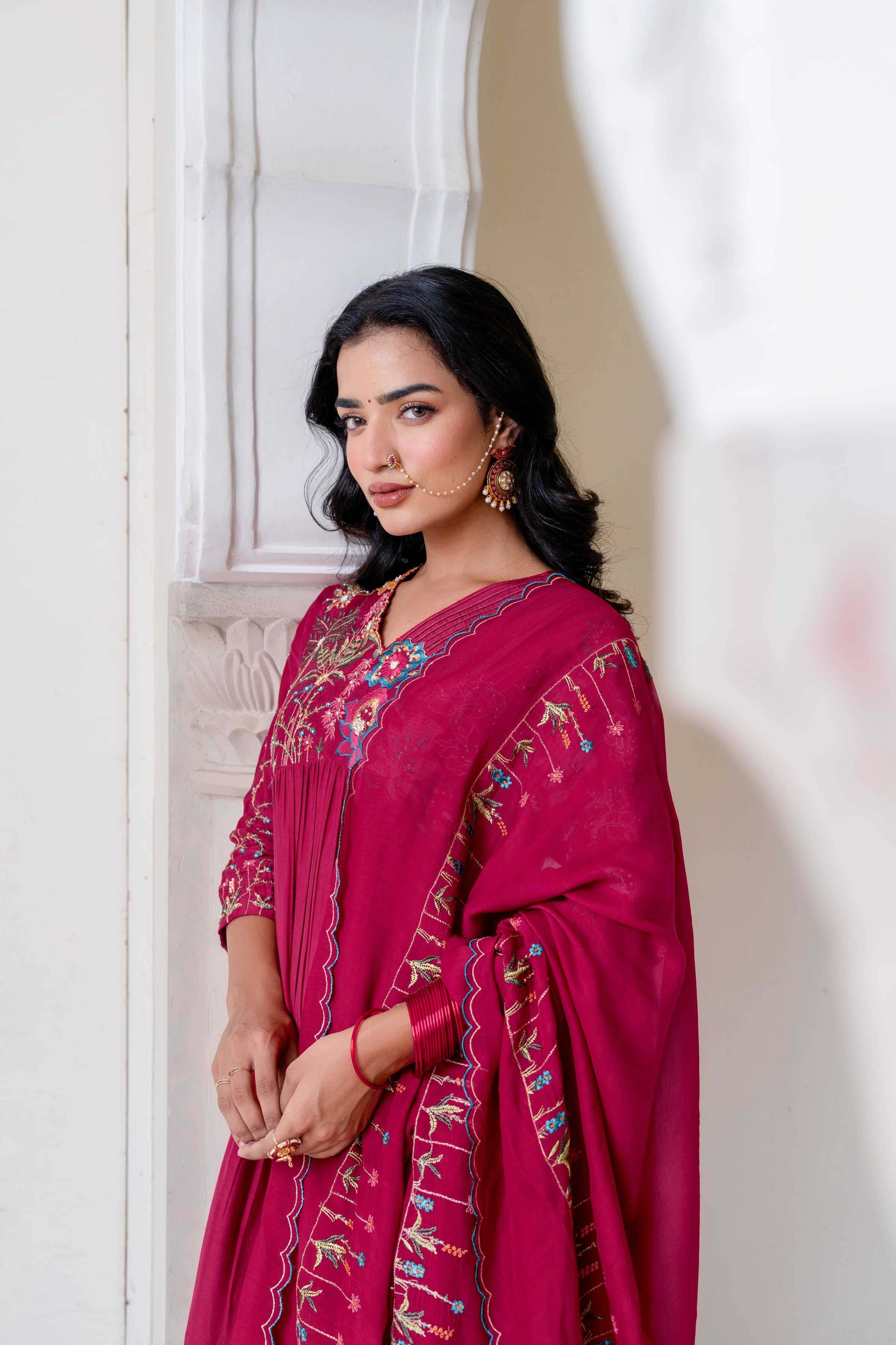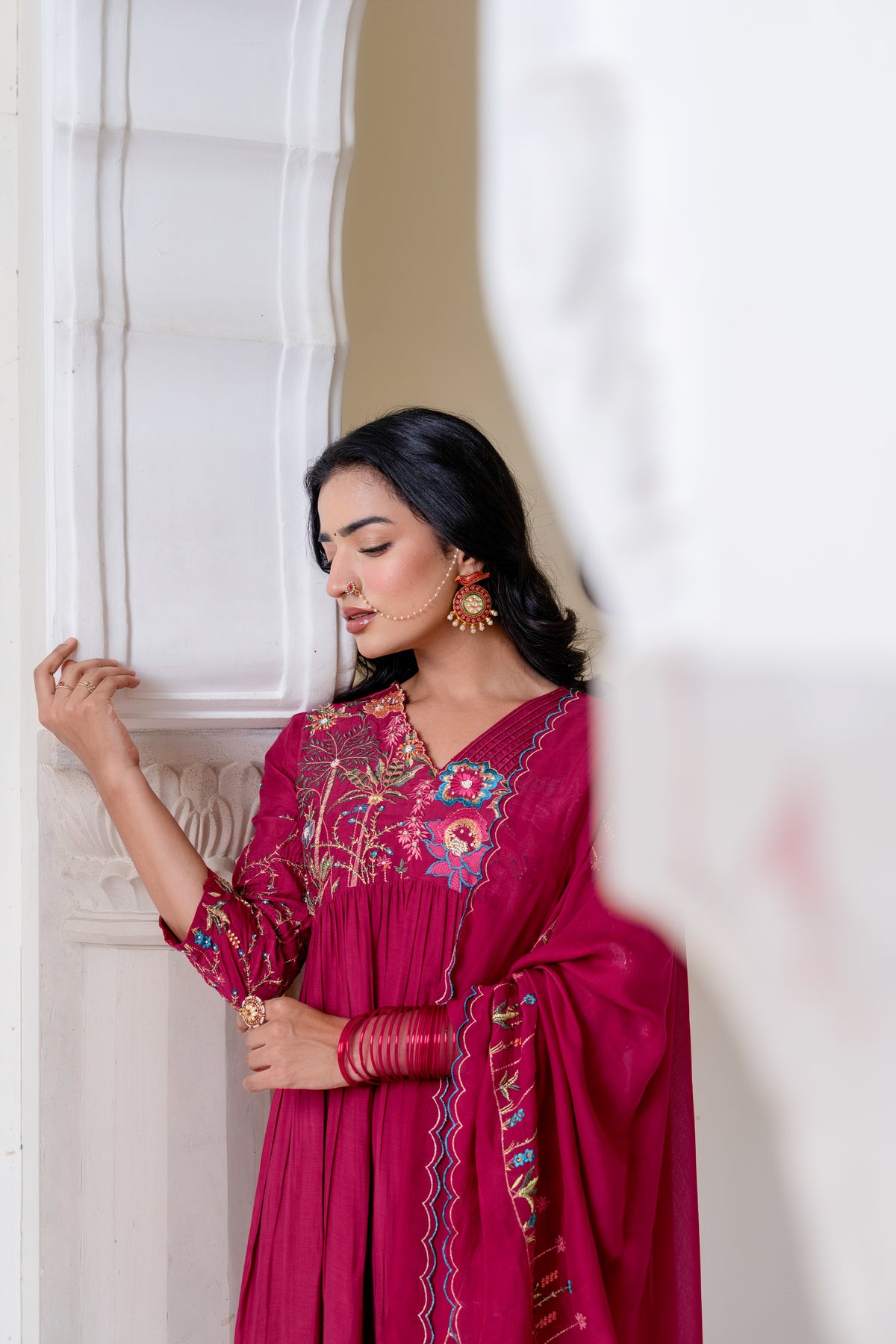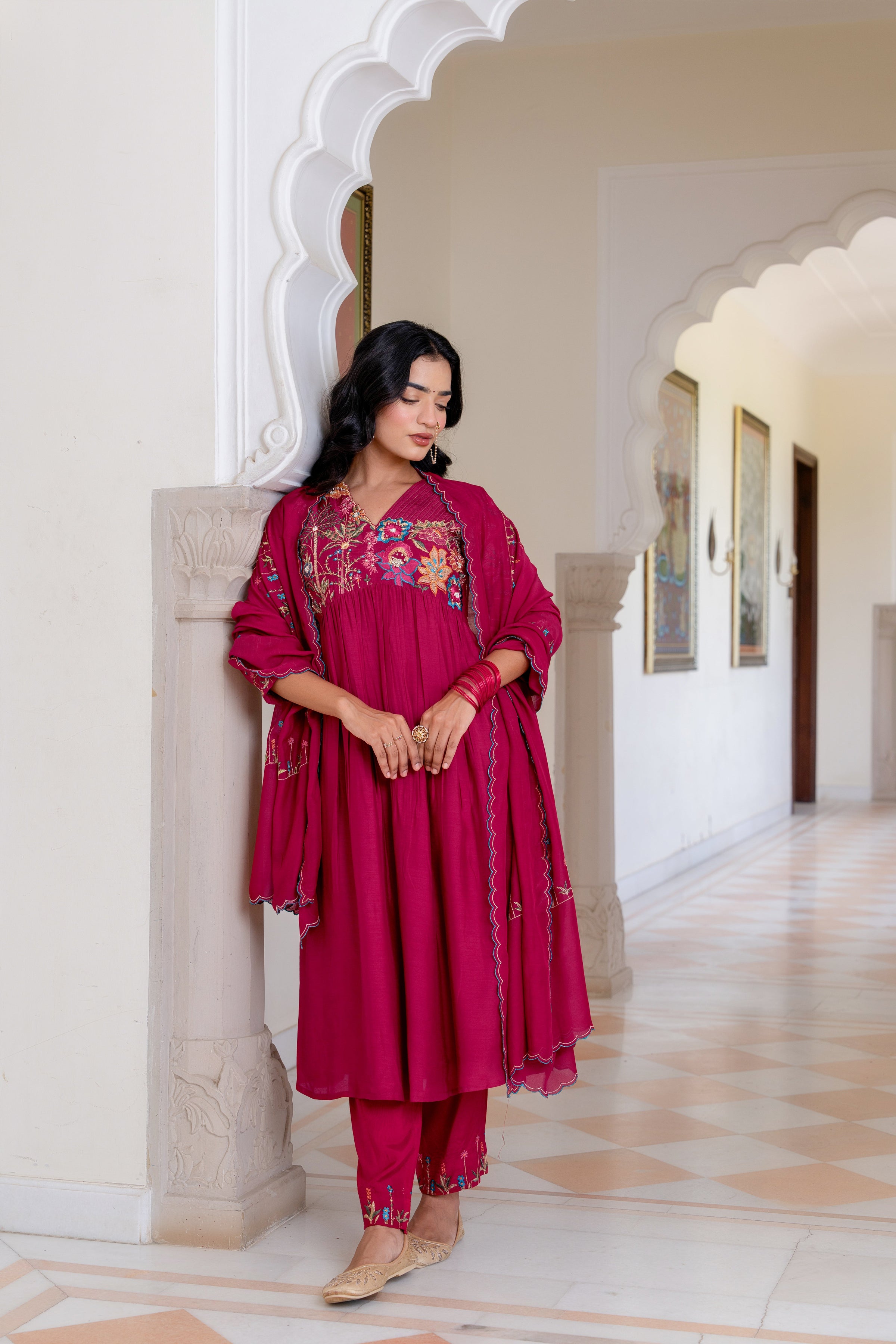Women Maroon Red MUSLIN SILK FUSION WEAR 3PC ALIA CUT SET .