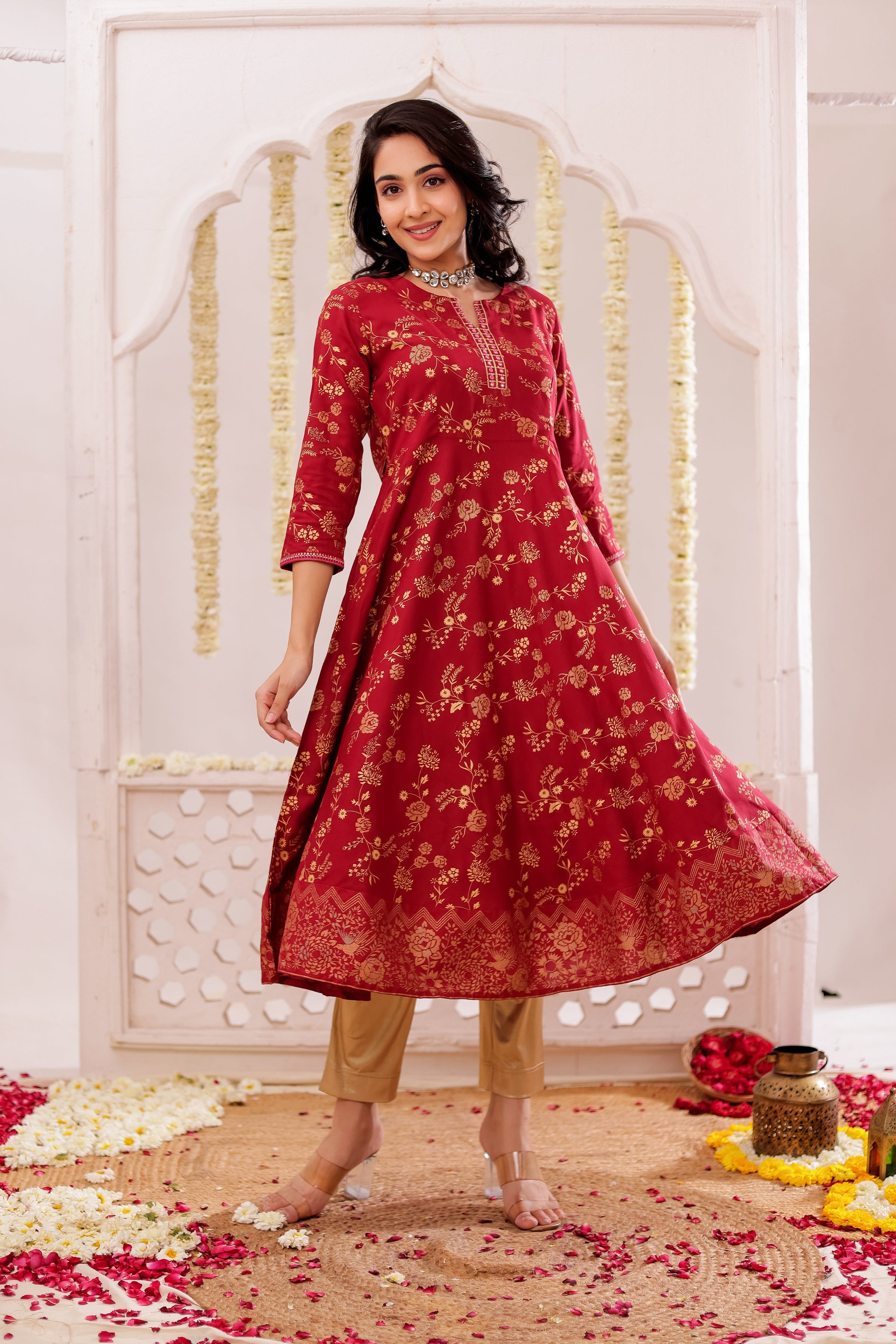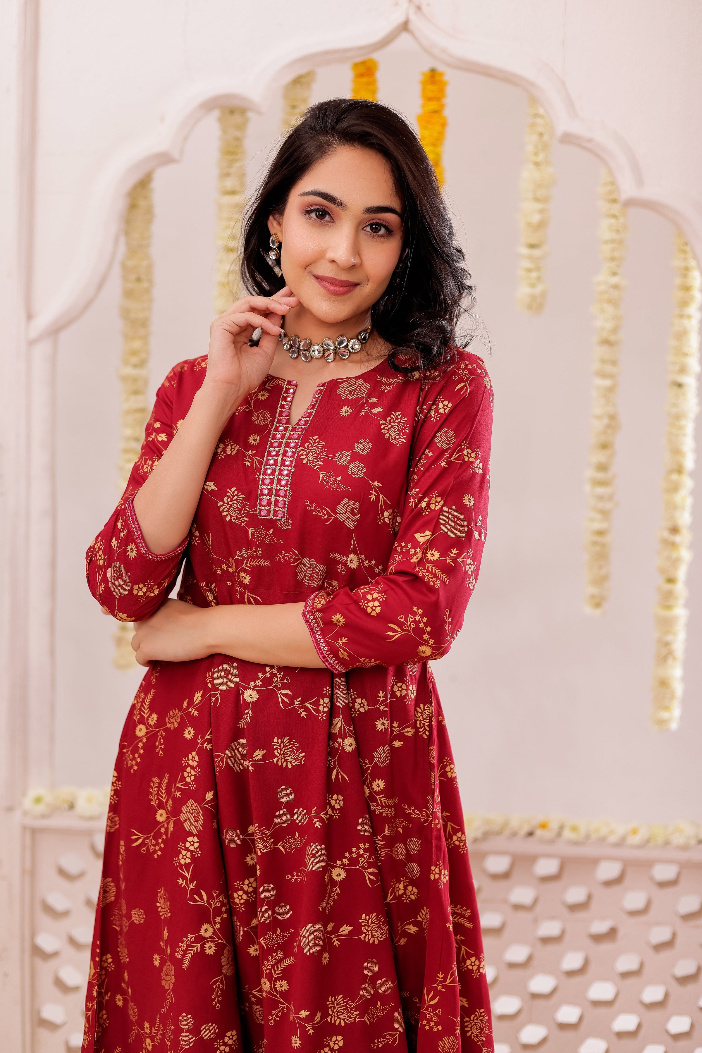 Women Navy Blue gold-printed-flaired-dress-with-mirror-embroidery-details