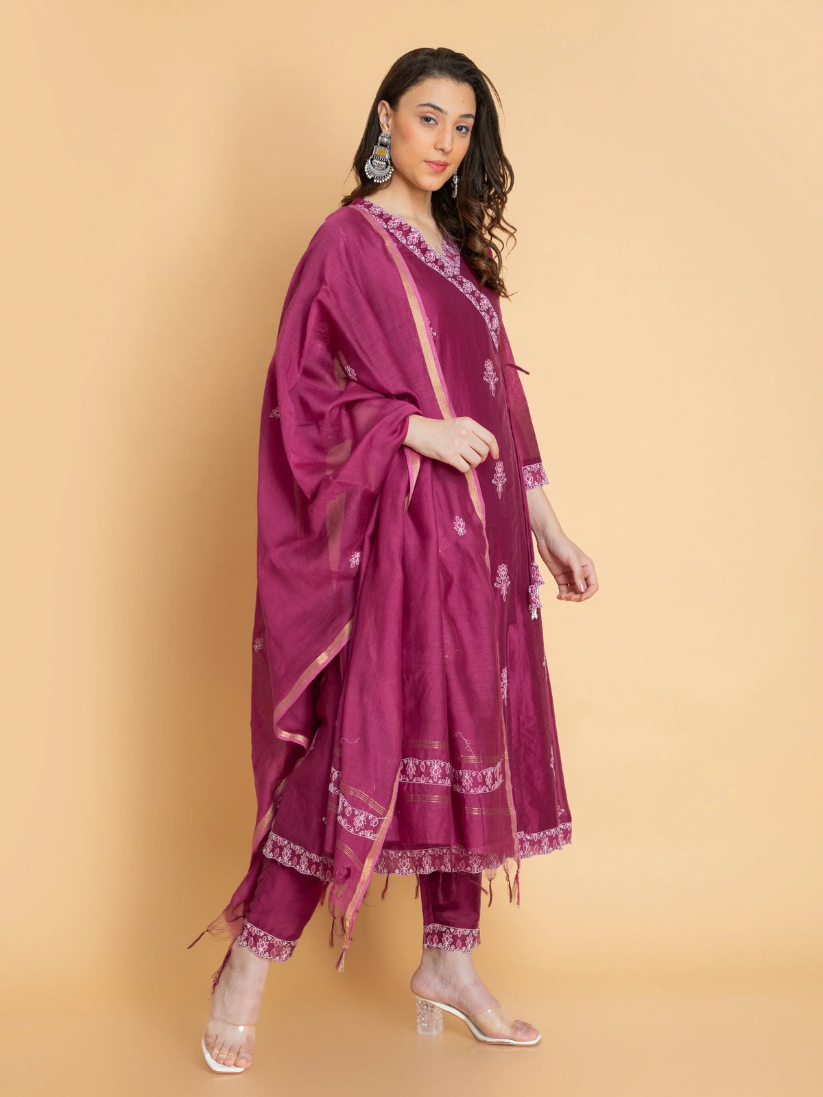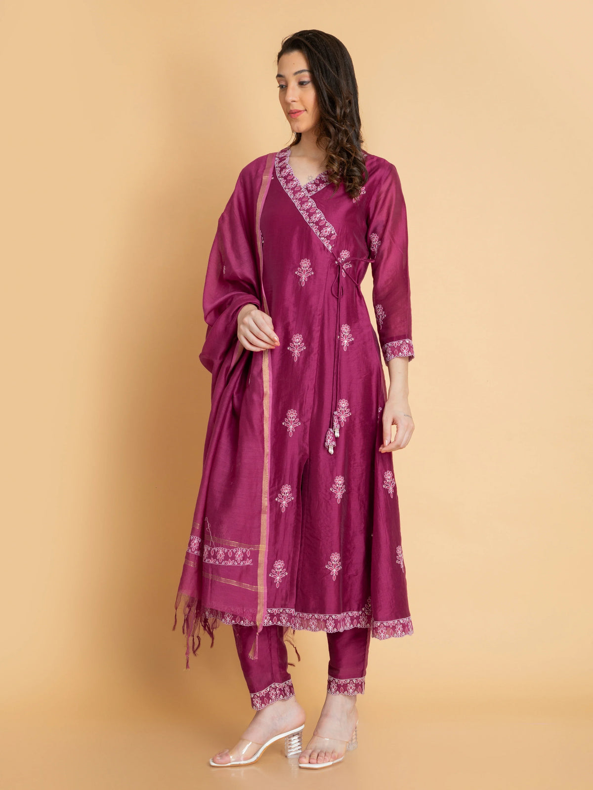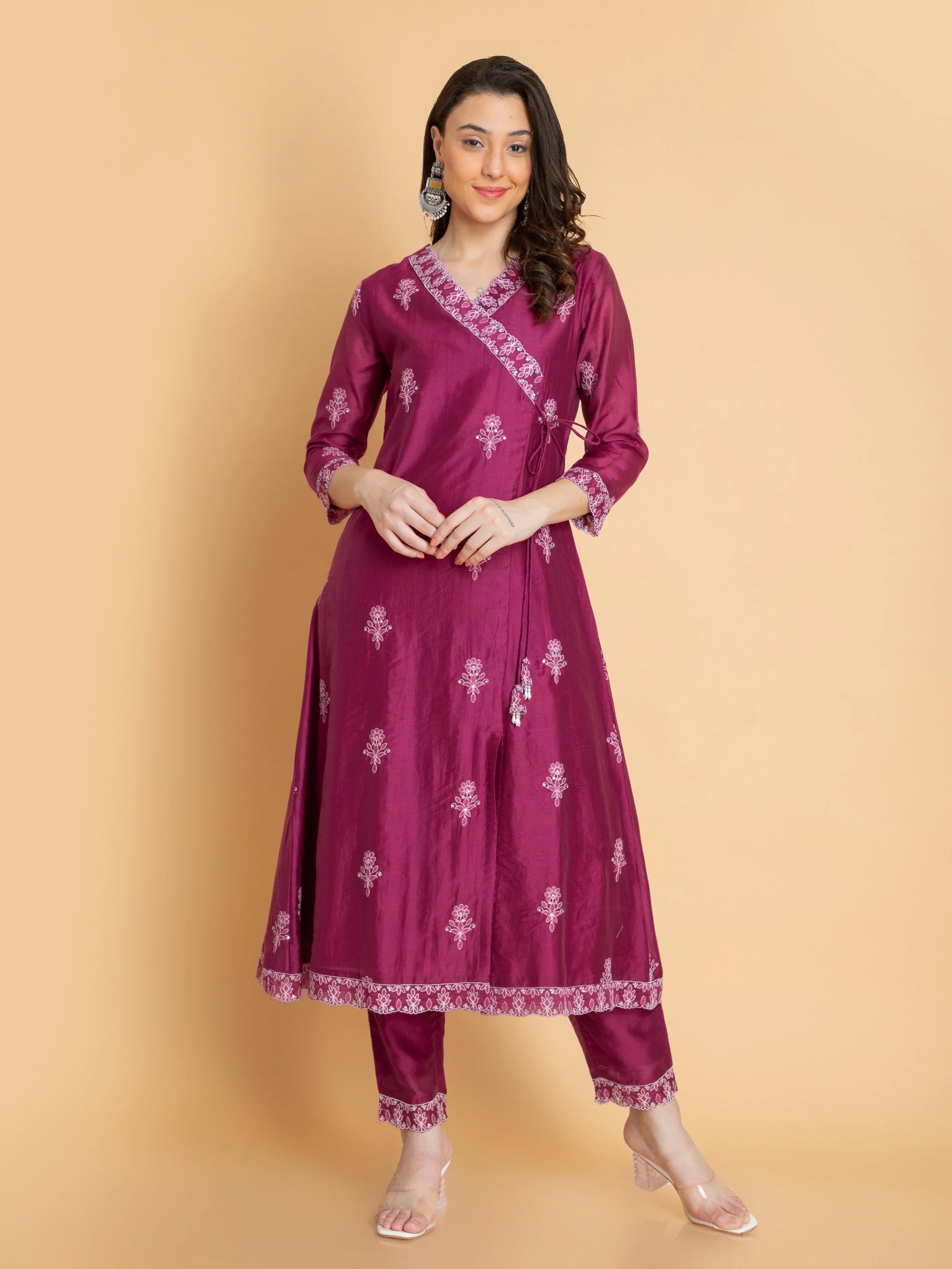Women Red Wine chikankari-embroidered-chanderi-3pc-angrakha-set-embellished-with-dori-latkan