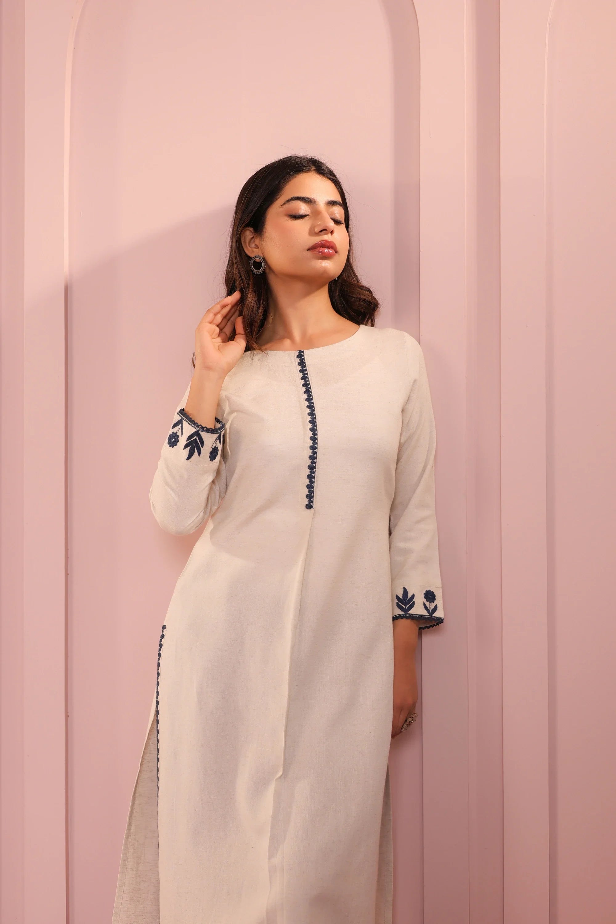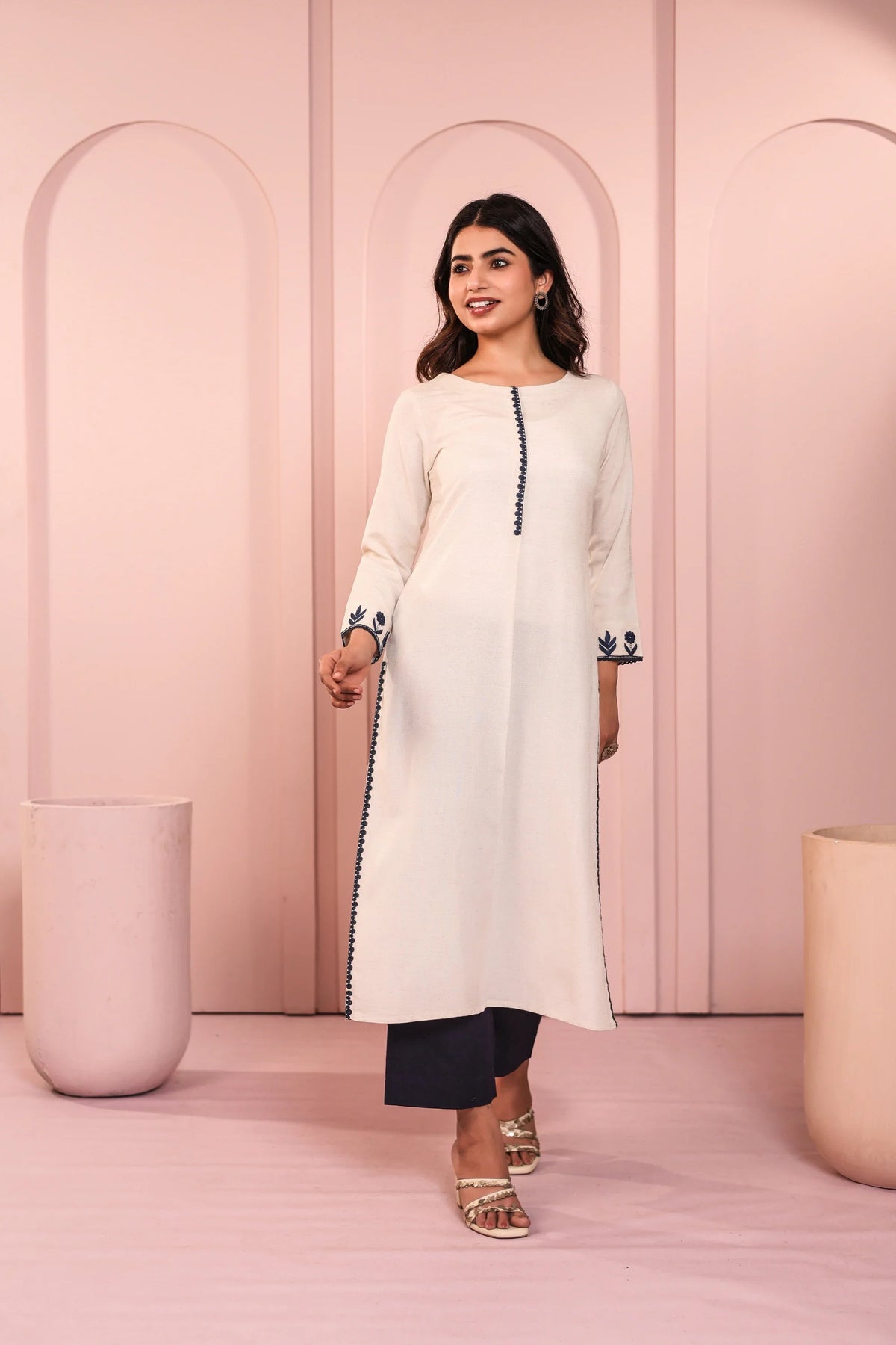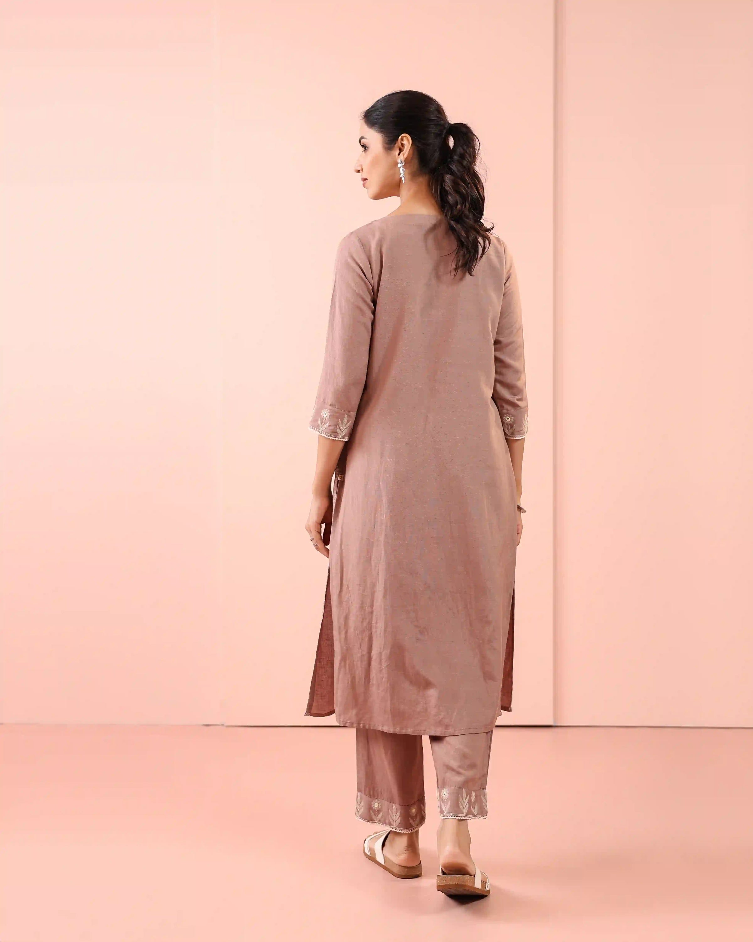 Women Taupe Color linen-blend-2pc-embroidered-kurta-set-with-lace-details