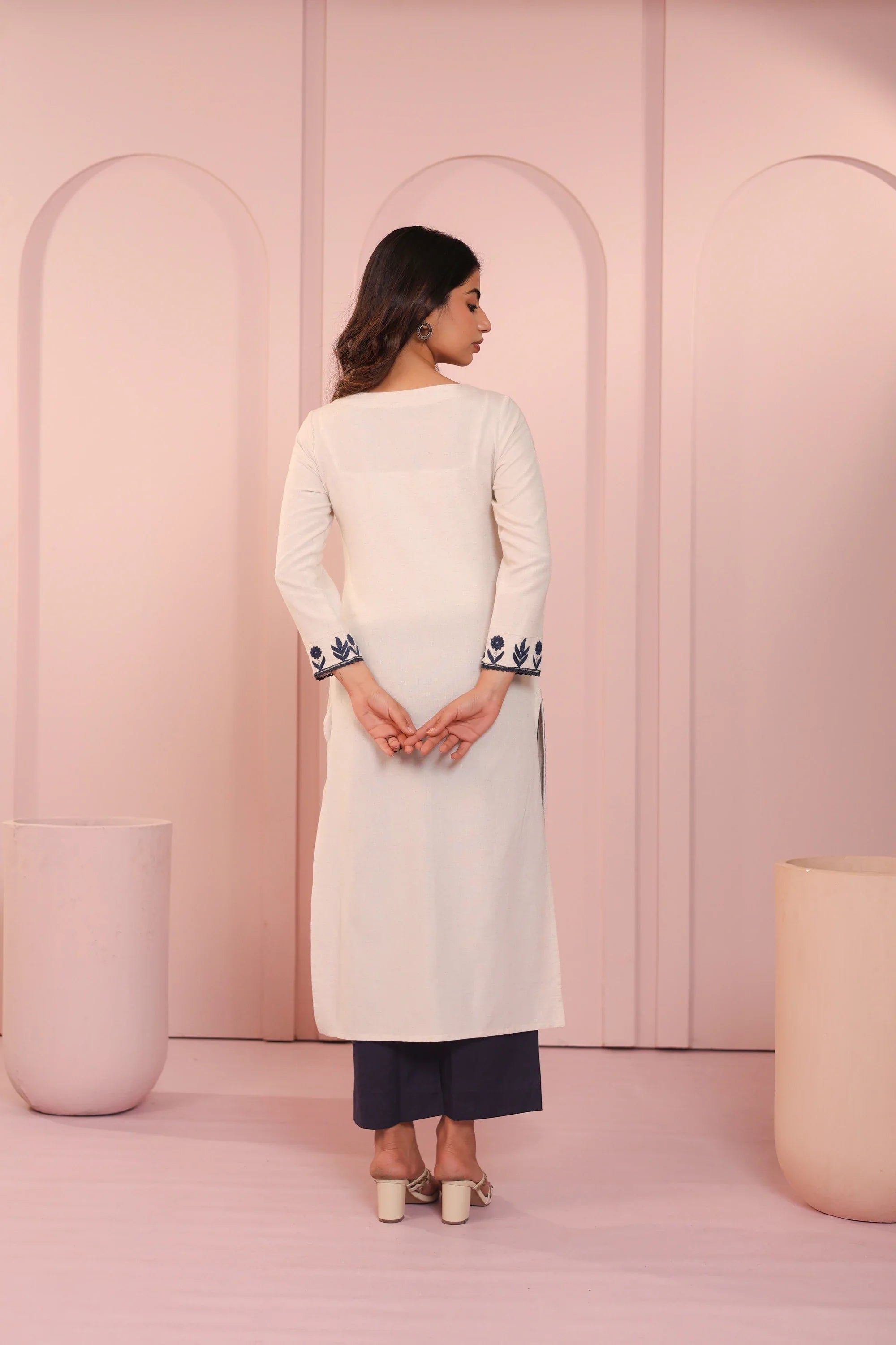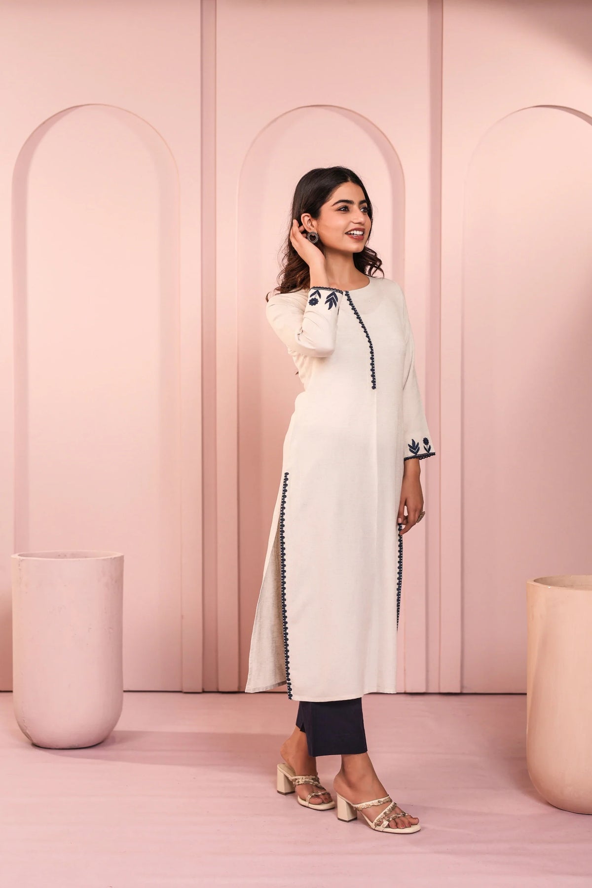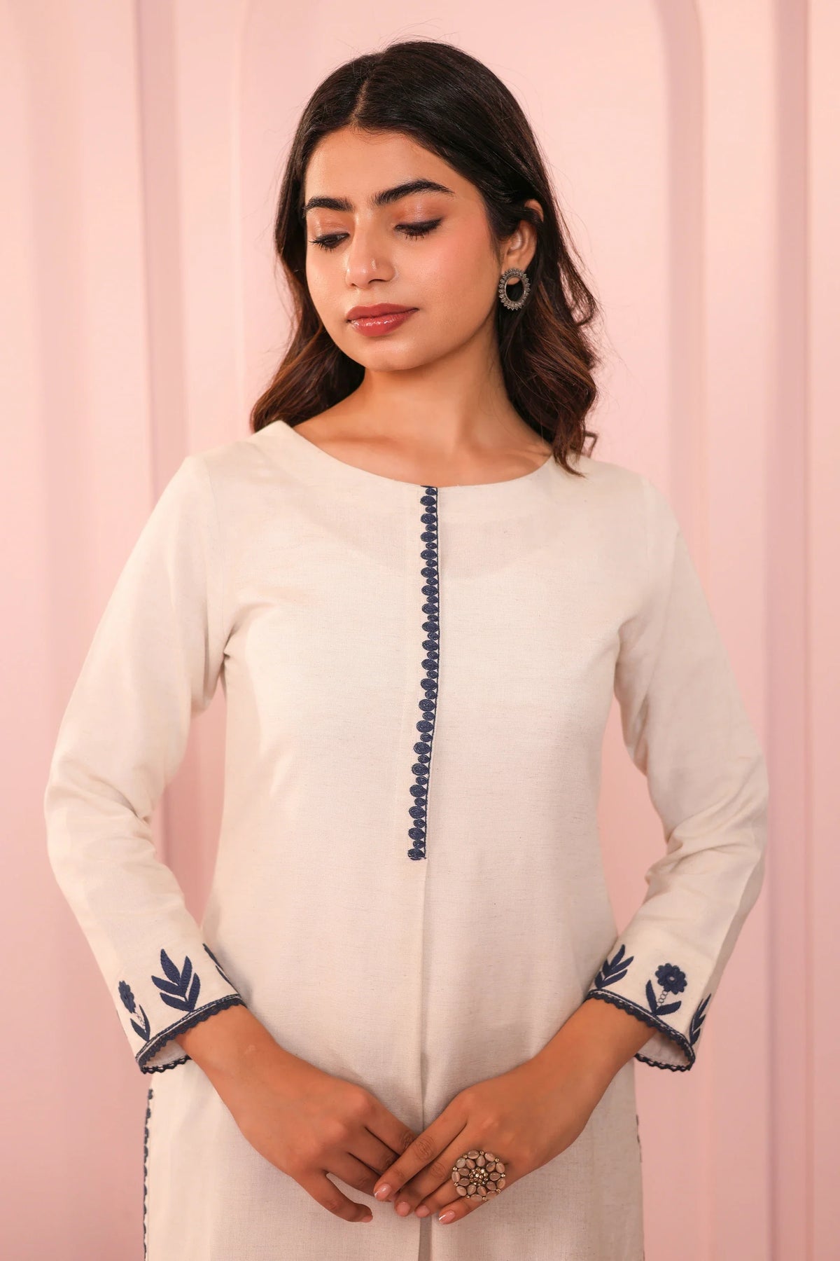 Women Taupe Color linen-blend-2pc-embroidered-kurta-set-with-lace-details