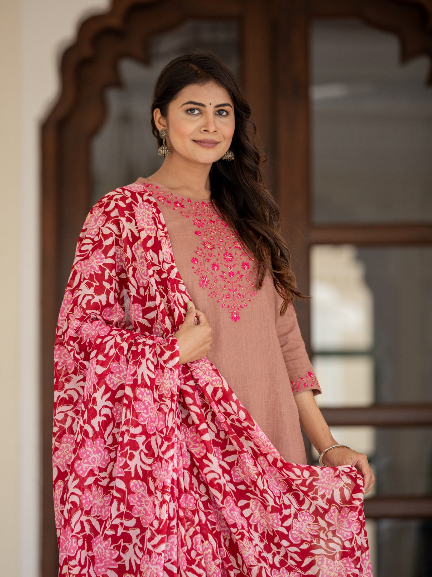 Women Taupe EMBROIDERED 3PC KURTA PANT PAIRED WITH FLORAL DUPATTA